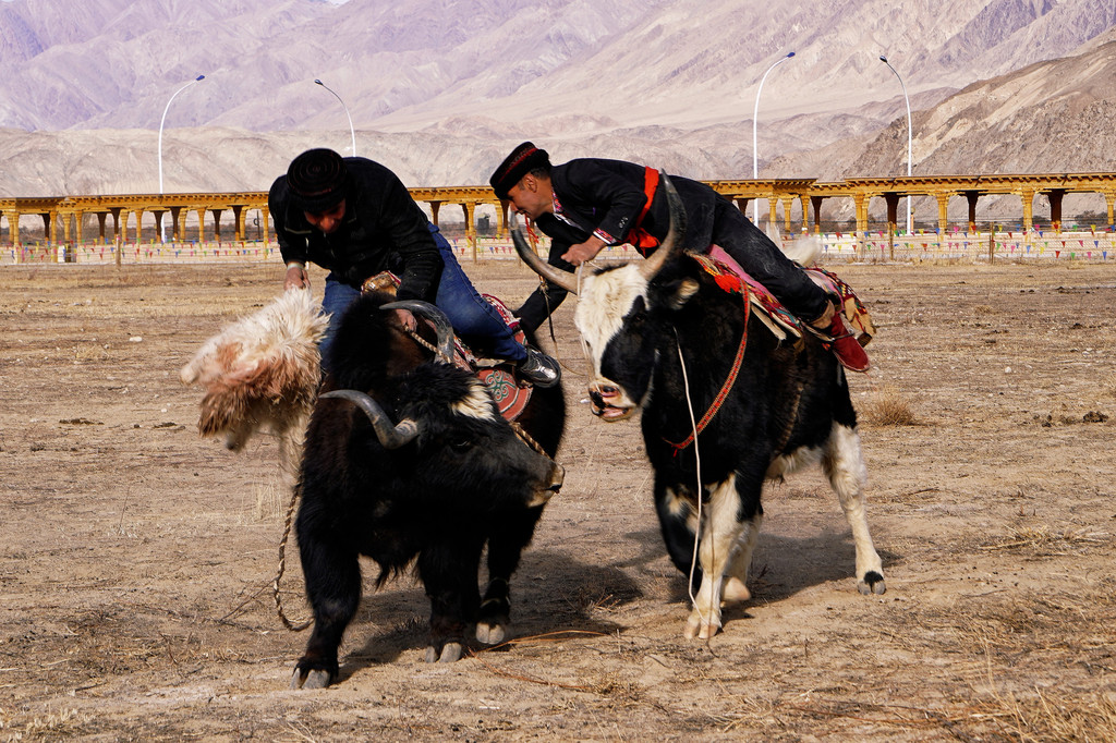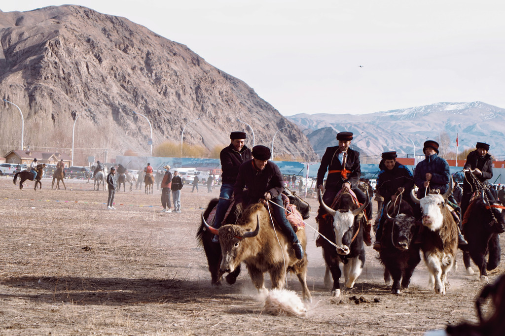 在高原,耐寒的牦牛可是重要的交通运输使者,骑马叨羊在这里演变成了牦牛叨羊。看牦牛跑得气喘吁吁、相互冲撞,主人策牛前冲,真是扣人心弦的比赛。