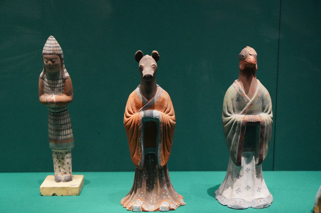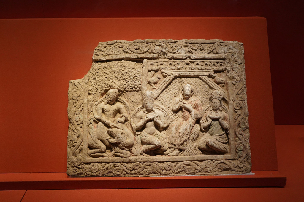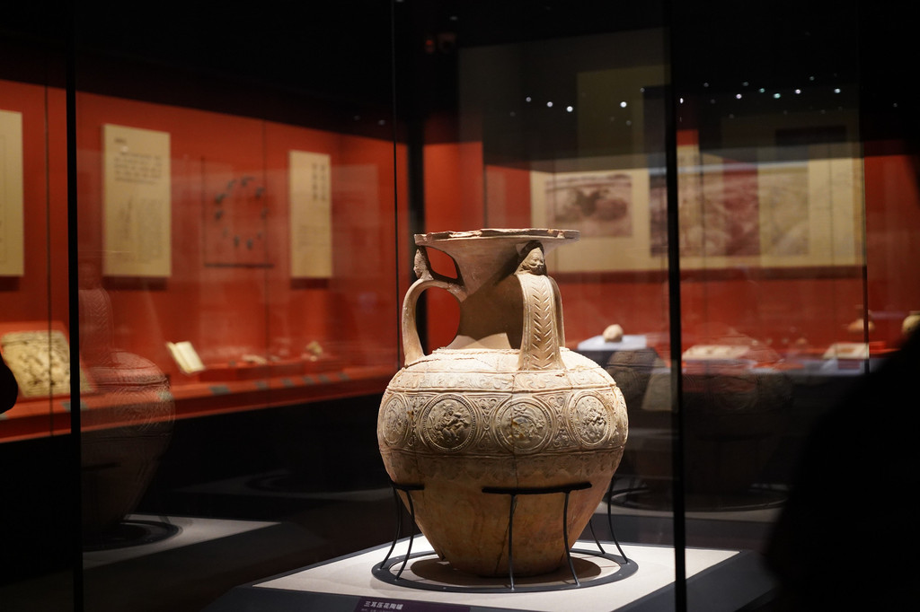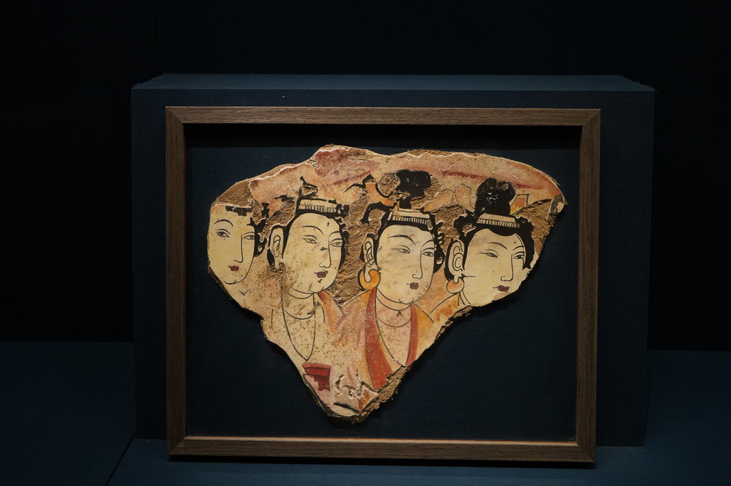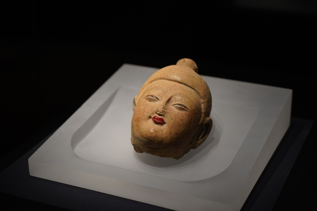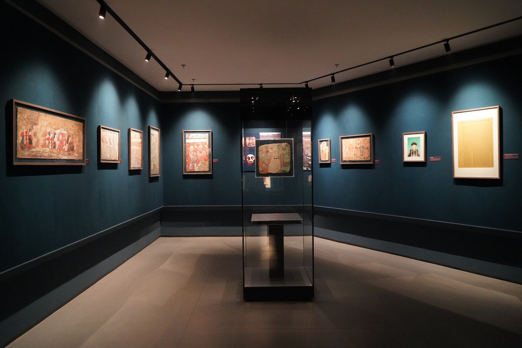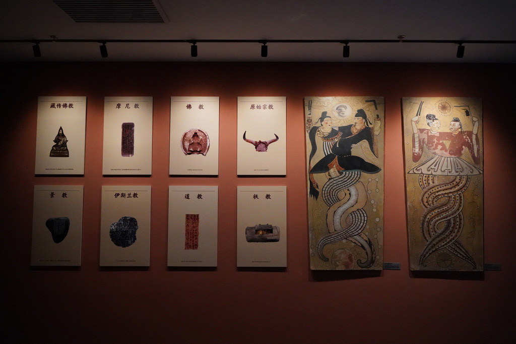 第二个展厅陈列着古代新疆佛教文化盛行的区域出土的佛教残片、法卢文残片、婆罗谜文残片、各种陶器、纺织品等古代生活用品。