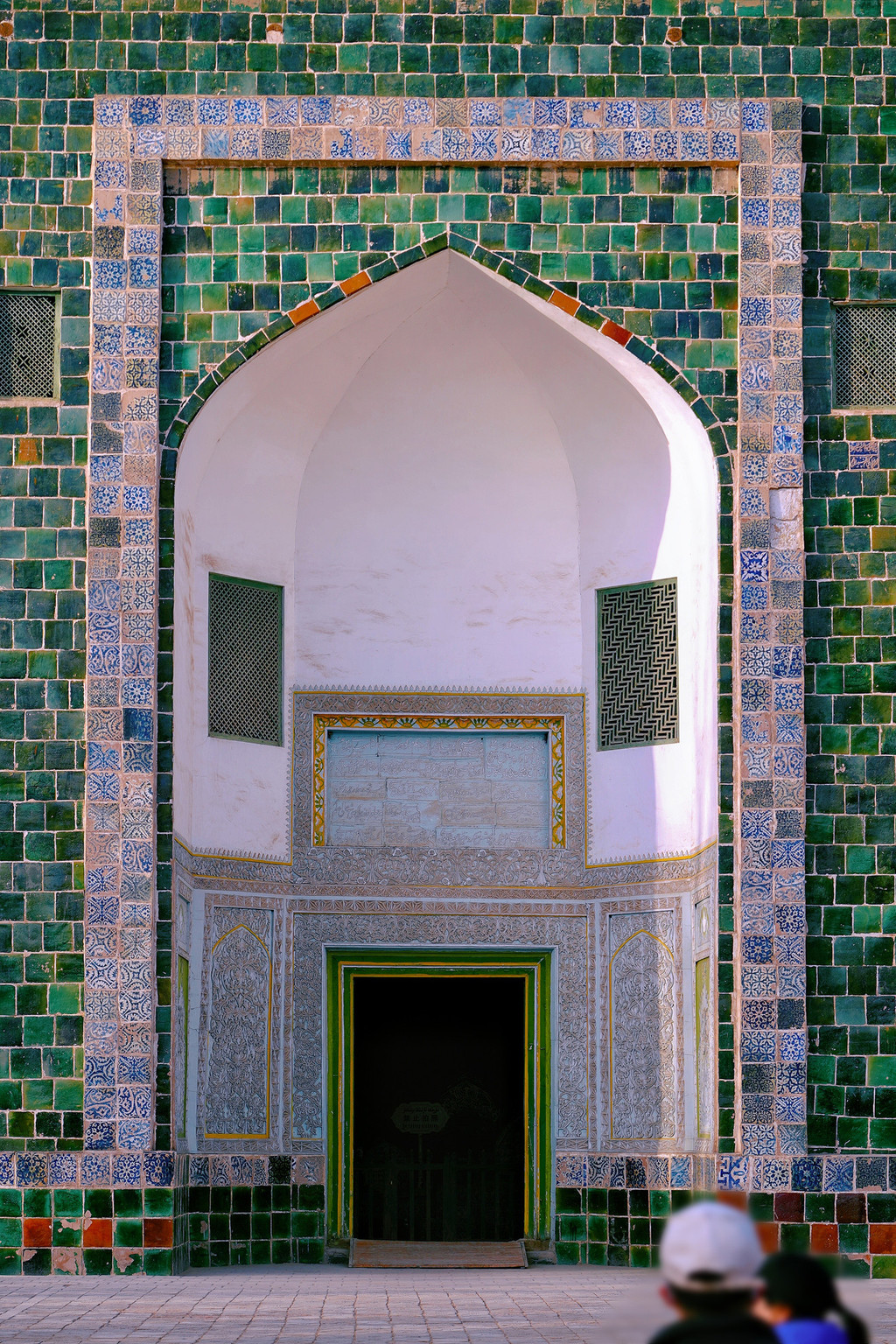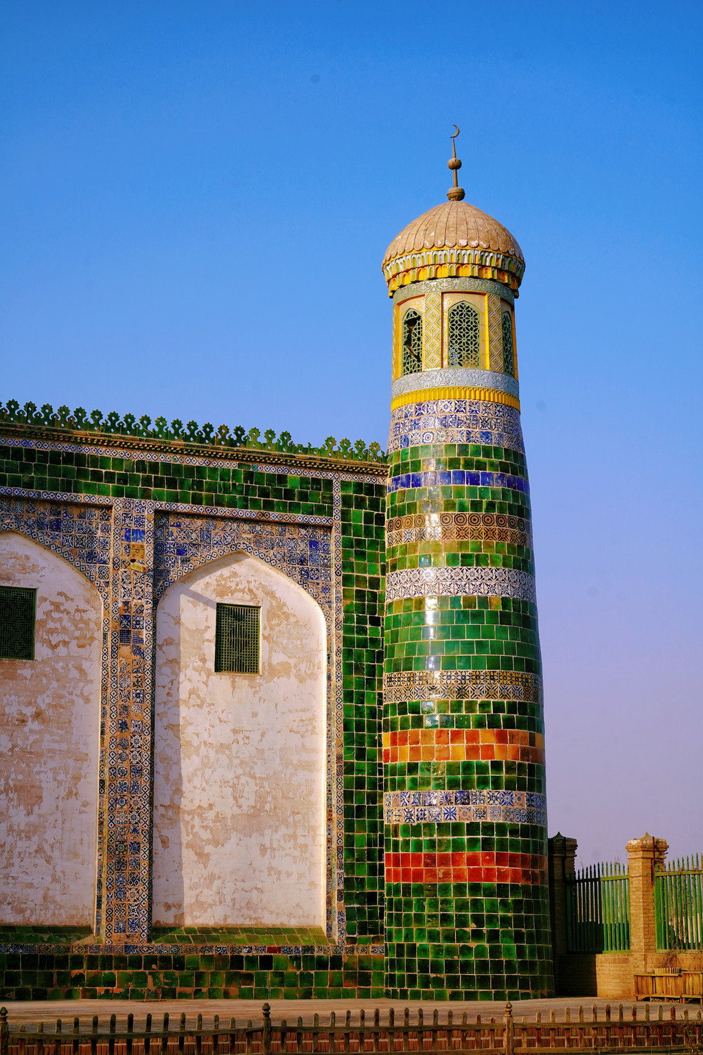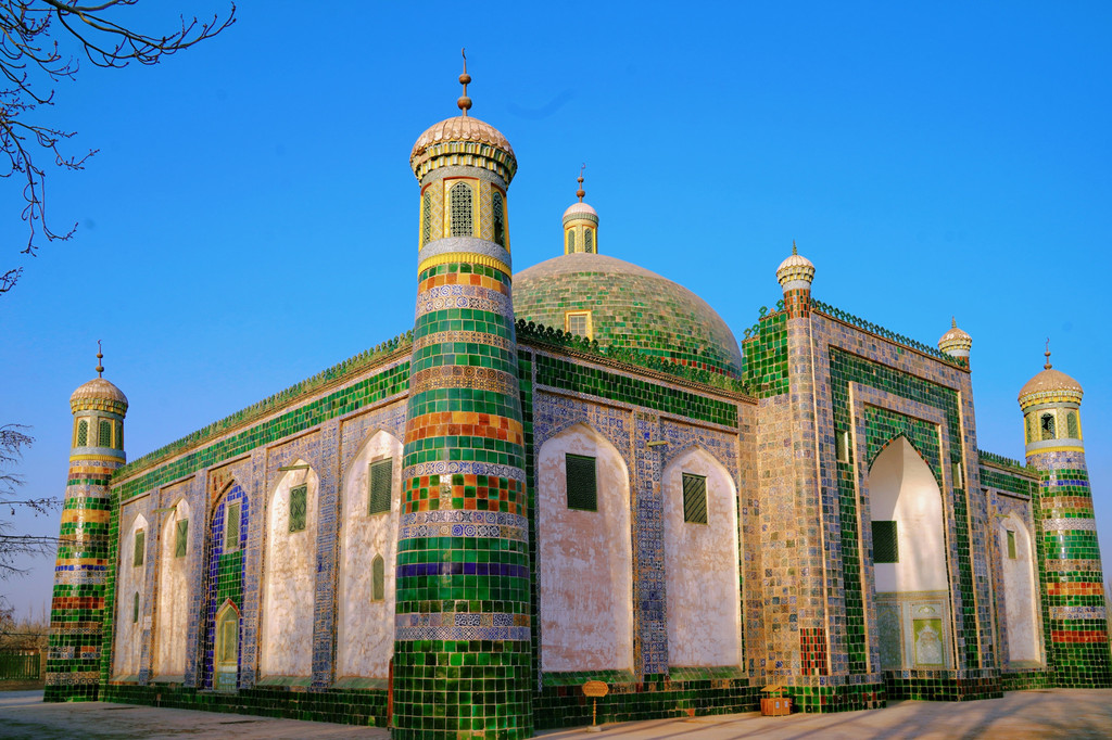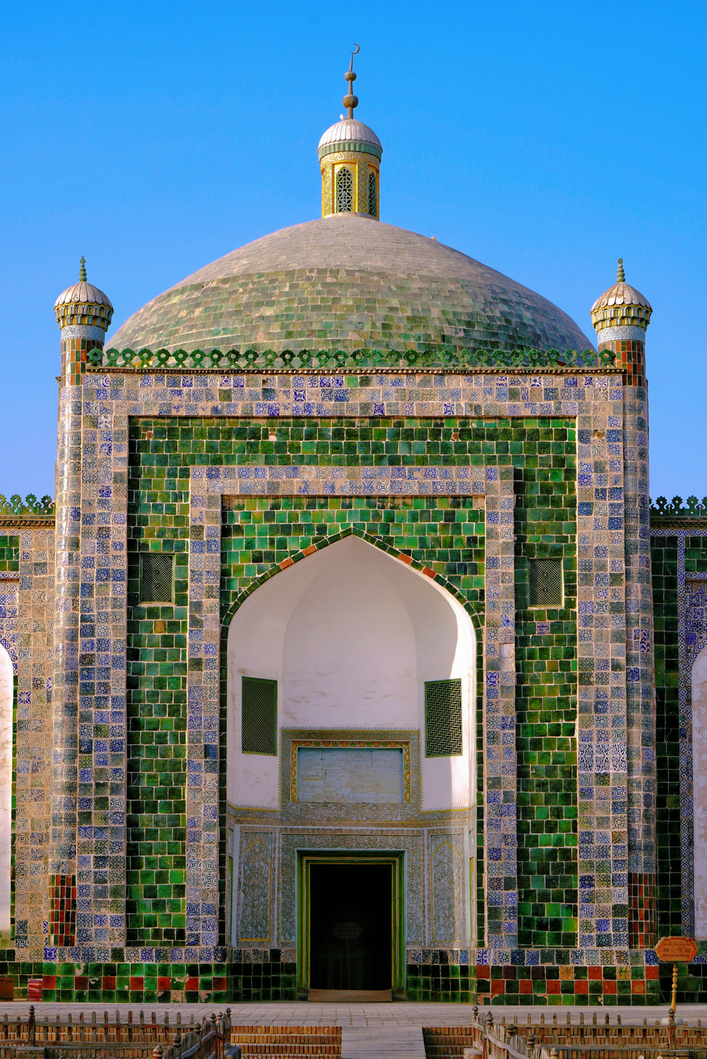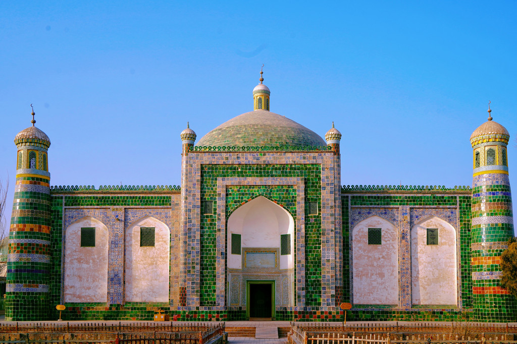 这也是香妃园中最重要的建筑,四周墙壁从上到下全都用深绿色琉璃砖贴面,上面绘有彩色图饰等。这些琉璃砖均为300多年以前烧制,时至今日依然色彩靓丽。四楼一拱搭配上面铁柱高擎的五弯新月,造型和谐,使整个建筑物显得格外庄严。