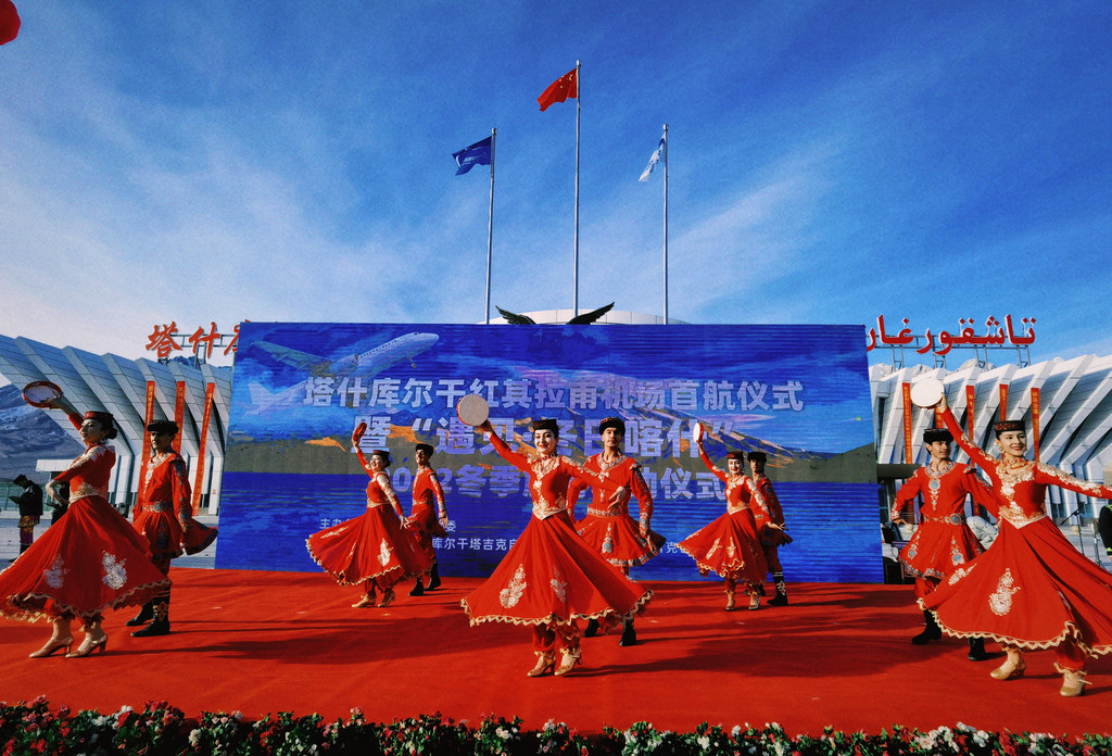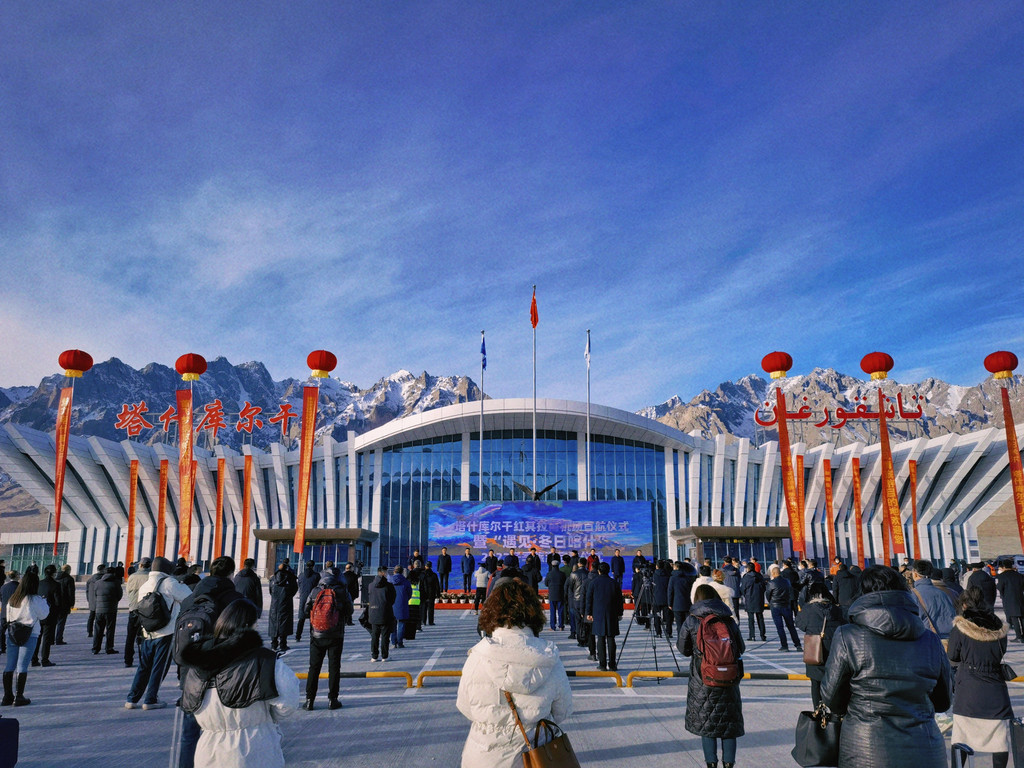 走出机场,迎接首航的典礼也已经开始了。塔吉克族的姑娘与小伙儿载歌载舞,塔吉克族是我国唯一的白色人种,长相颇具异域风情。塔吉克族的服饰也很漂亮,颜色鲜艳配以帽子,男生的帽子叫“吐马克”,女生戴的叫“库勒塔”,是区别于其他民族的重要特征。