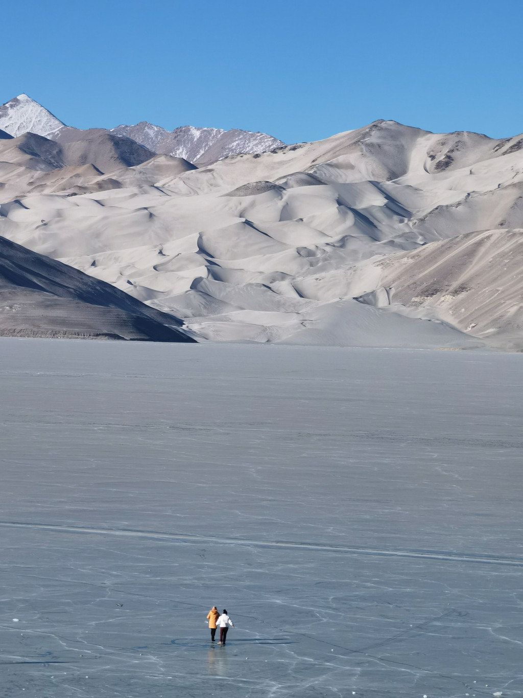 夏天,湖水会倒映出白色的沙山和远处的雪山;