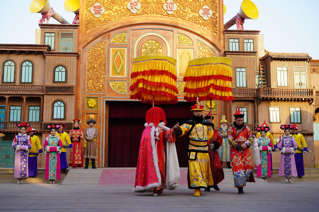 香妃园景区每天都会举行隆重的“香妃迎宾”入园仪式。“乾隆皇帝”、“香妃”以及“香妃家族”纷纷走上台来欢迎八方来客入园。