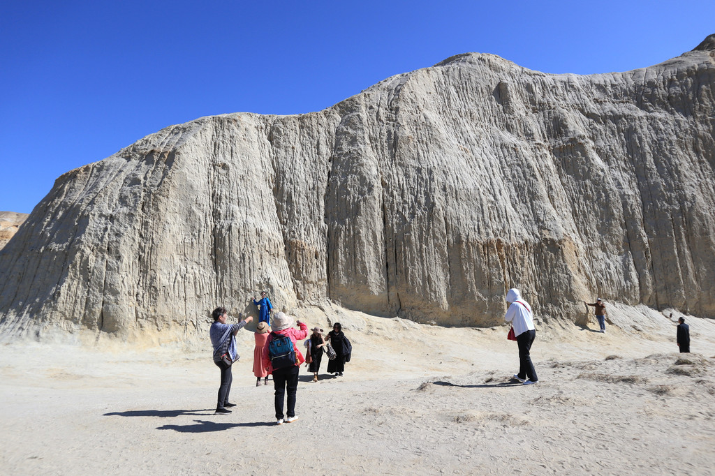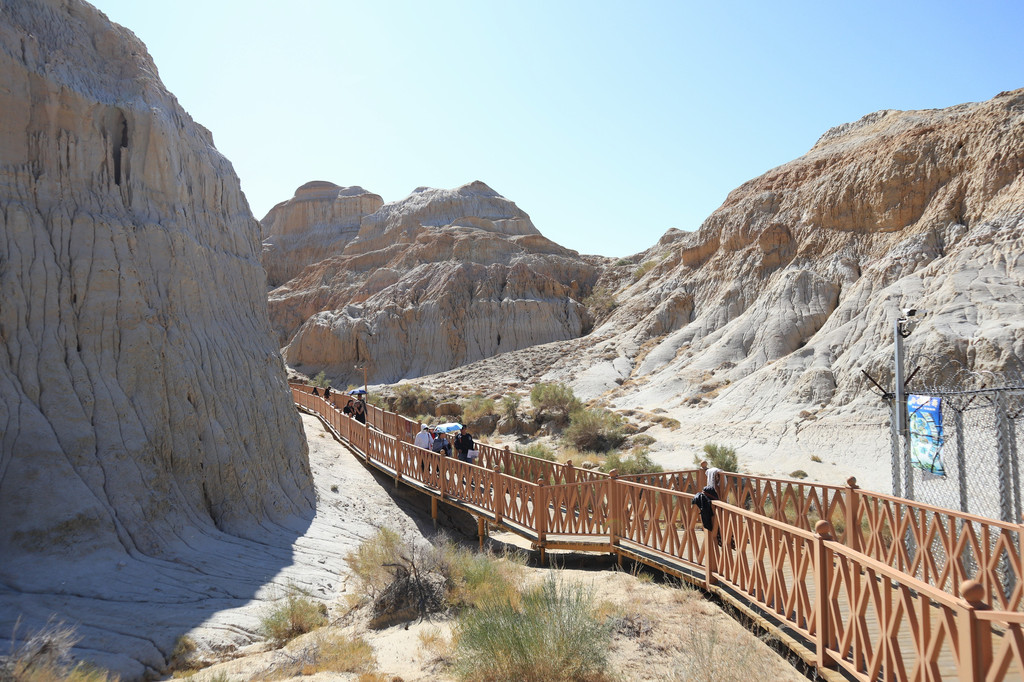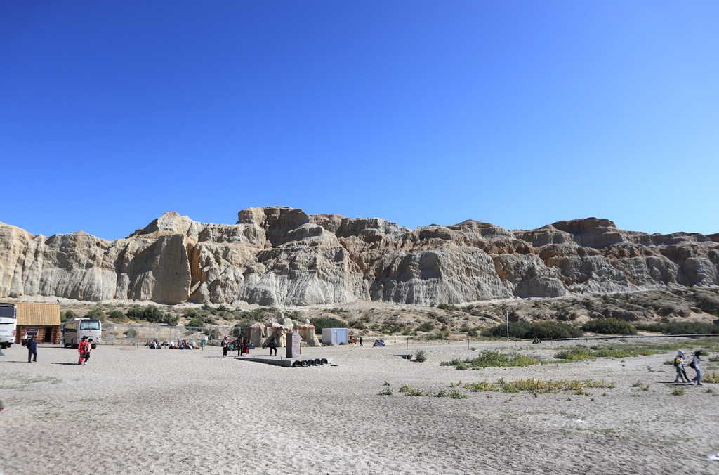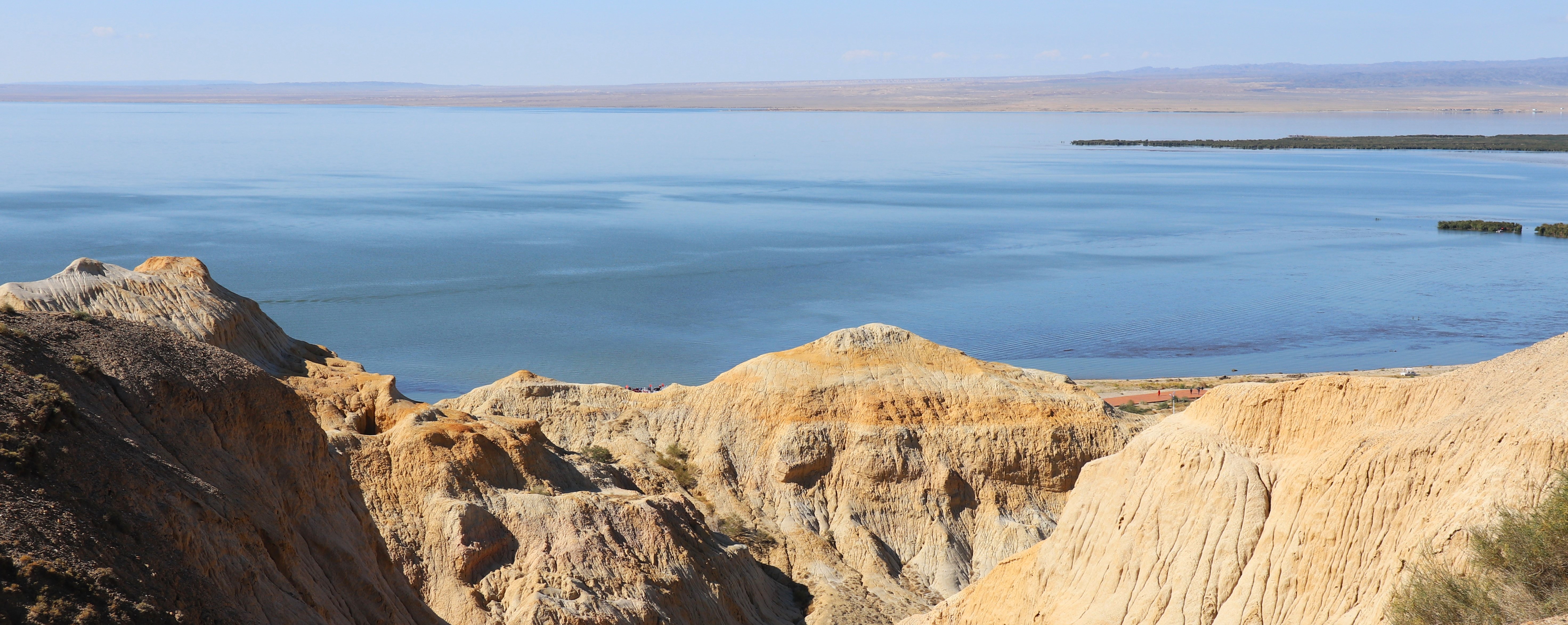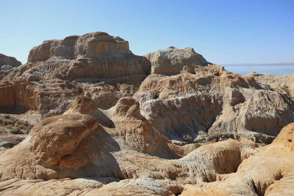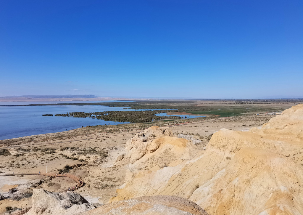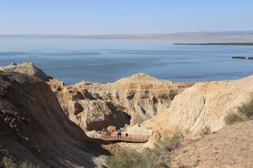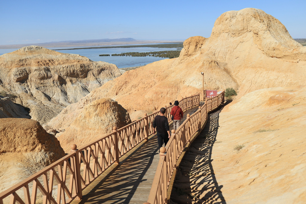 距湖岸约百米处,有着一片十分壮观的雅丹地貌,呈南北走向,绵延十余里,坡体呈斗圆形,环绕着小海子。由于长年的风蚀雨蛀,形成了造型奇特的地貌景观。有的象巍峨的宫殿,有的象庄严的庙宇,有的象仰天长啸的雄狮......,维妙维肖,巧夺天工。