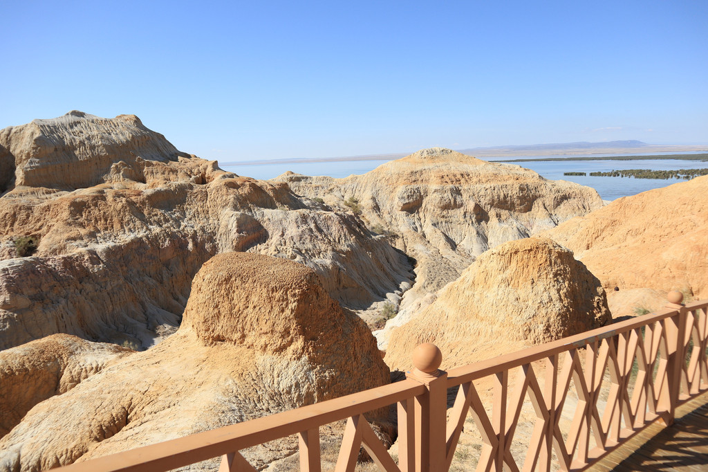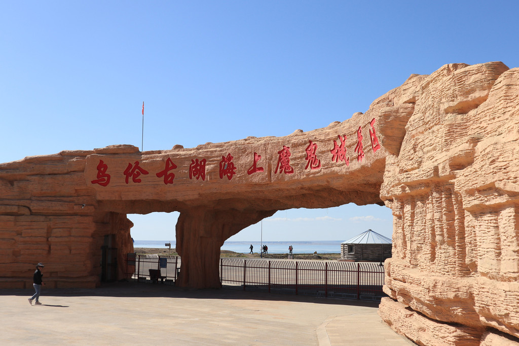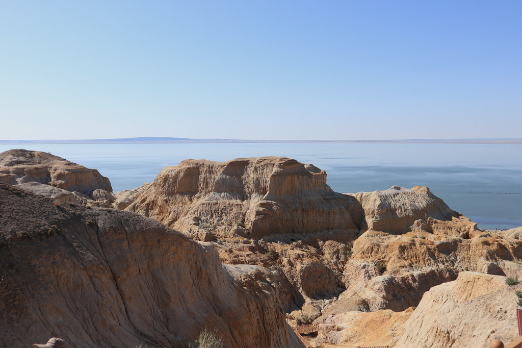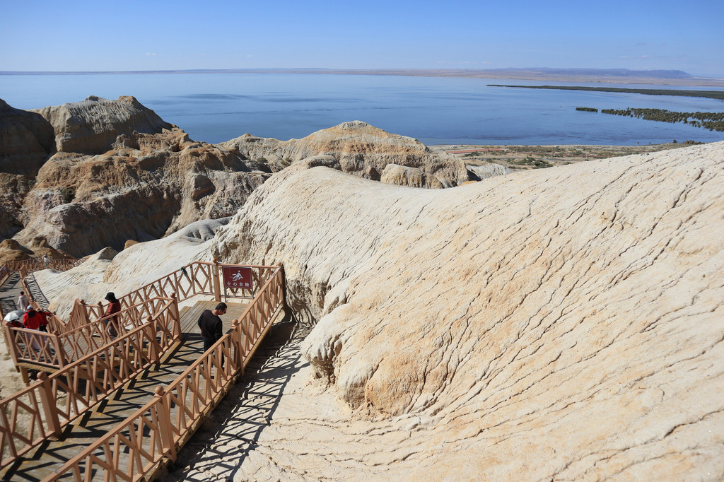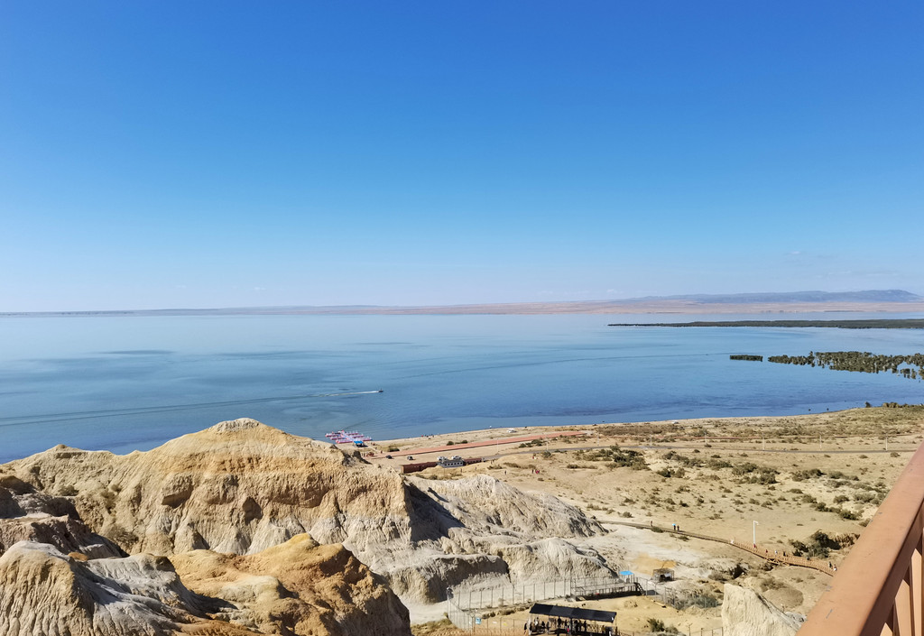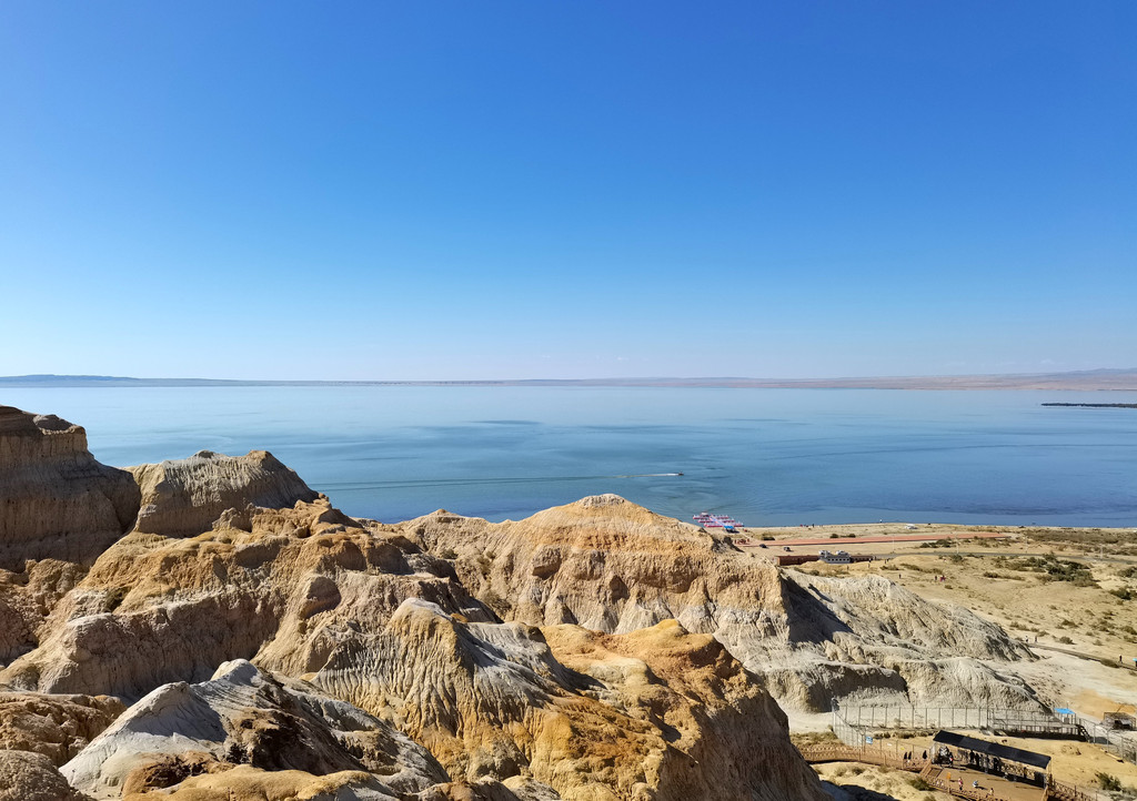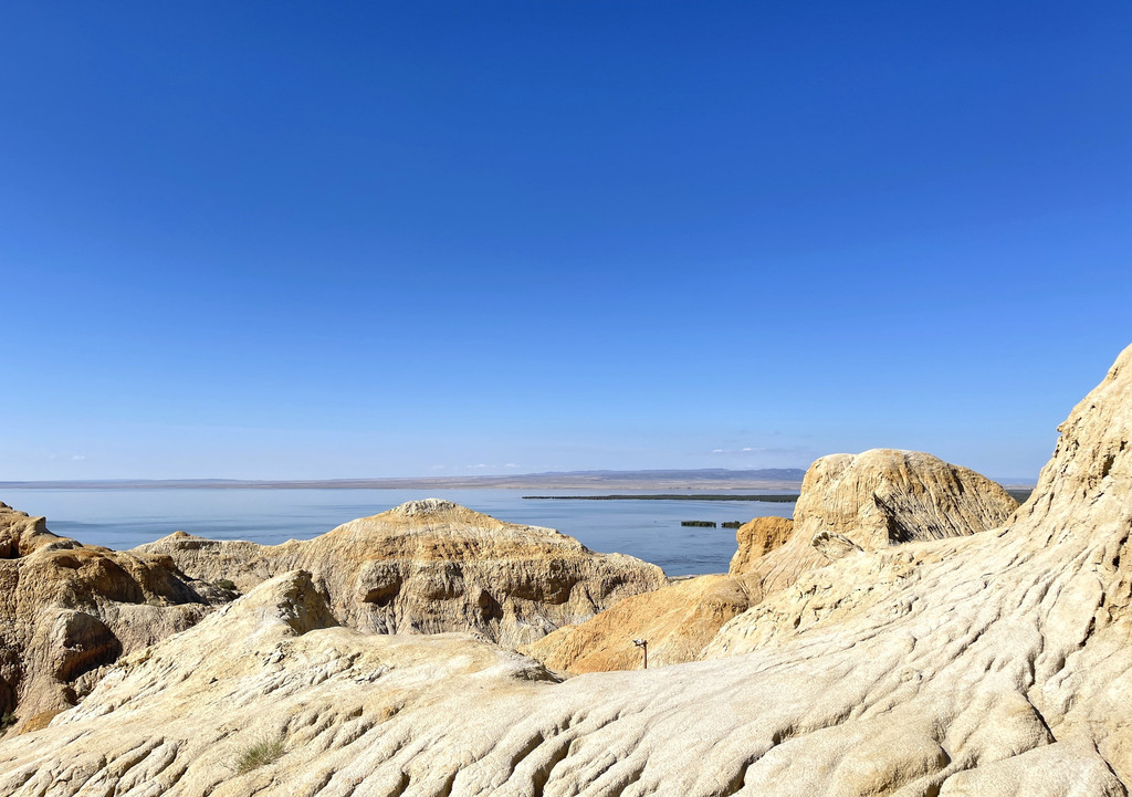 进入景区,照例先乘坐景区车,好在不很长,几分钟而已。而后走上几步路,就能在山崖边看到乌伦古湖和海上魔鬼城的身影。所谓魔鬼城,是当地人对雅丹地貌的一种形象的描述,因为远远望去,就象一座飘浮在水面上的城堡。