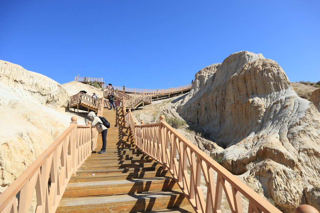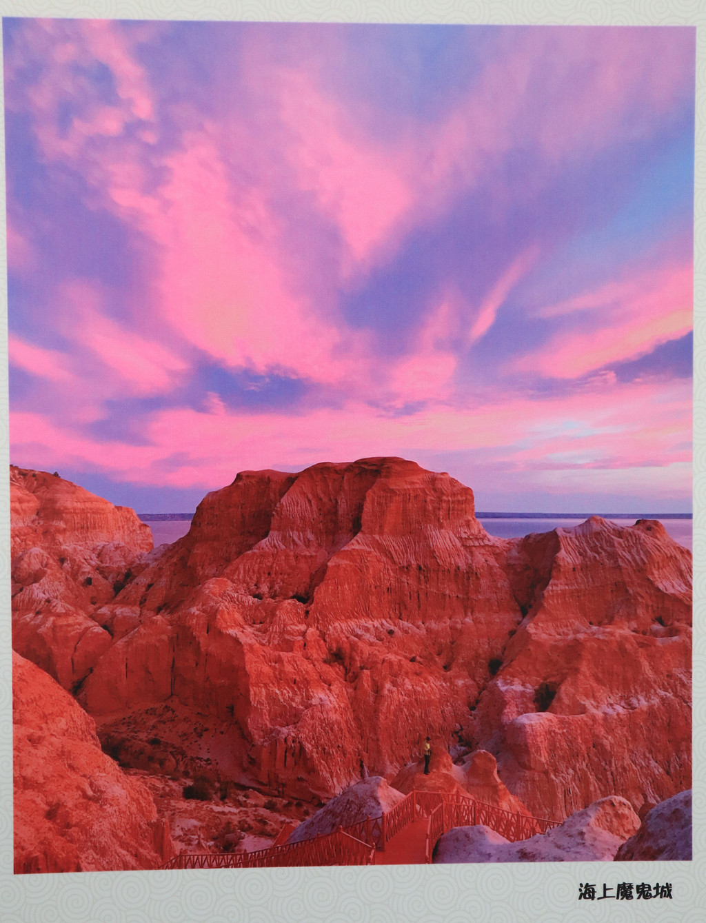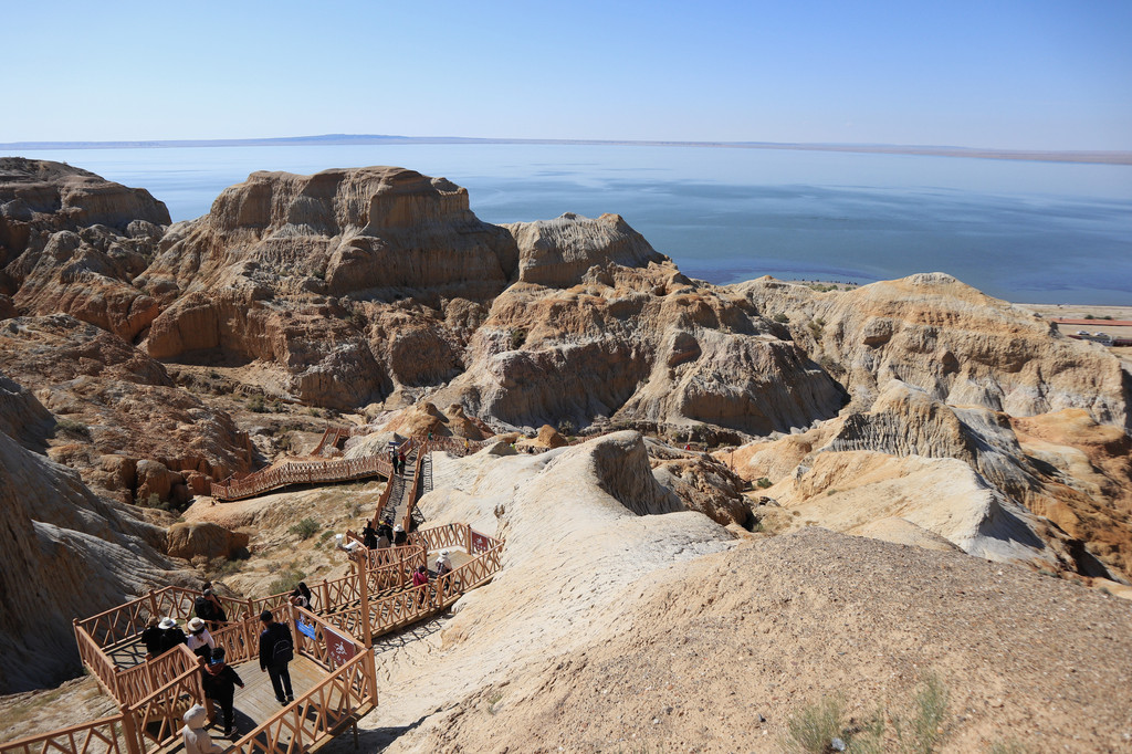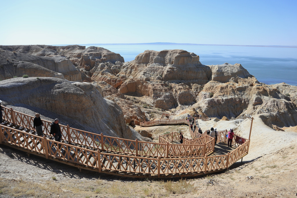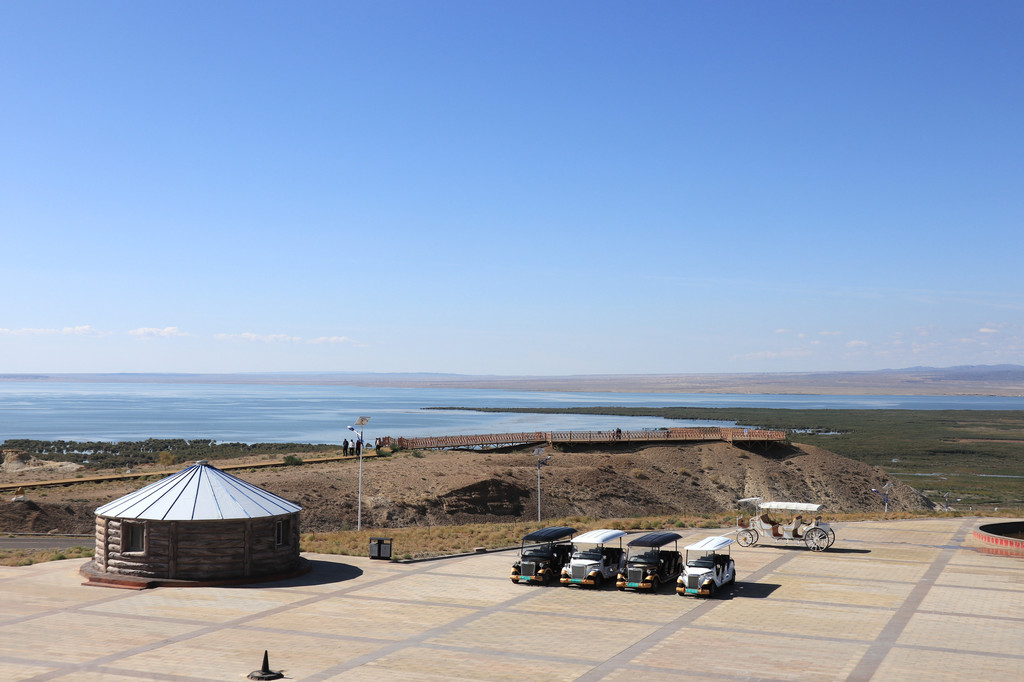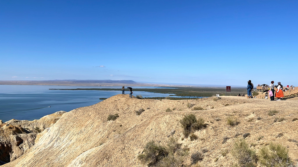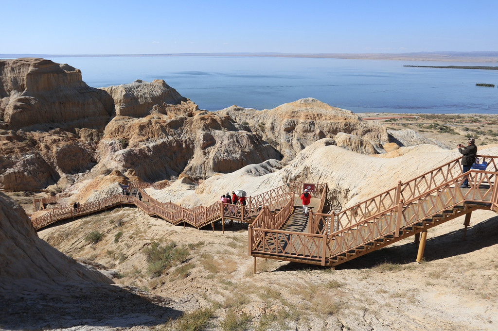 进入景区,照例先乘坐景区车,好在不很长,几分钟而已。而后走上几步路,就能在山崖边看到乌伦古湖和海上魔鬼城的身影。所谓魔鬼城,是当地人对雅丹地貌的一种形象的描述,因为远远望去,就象一座飘浮在水面上的城堡。