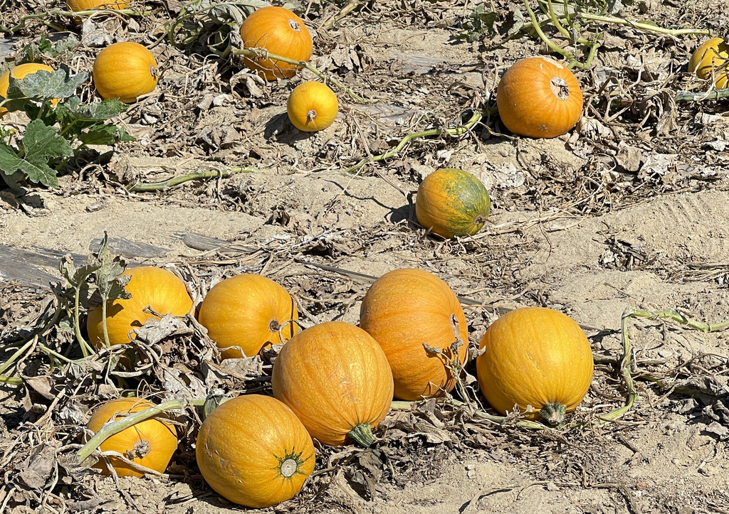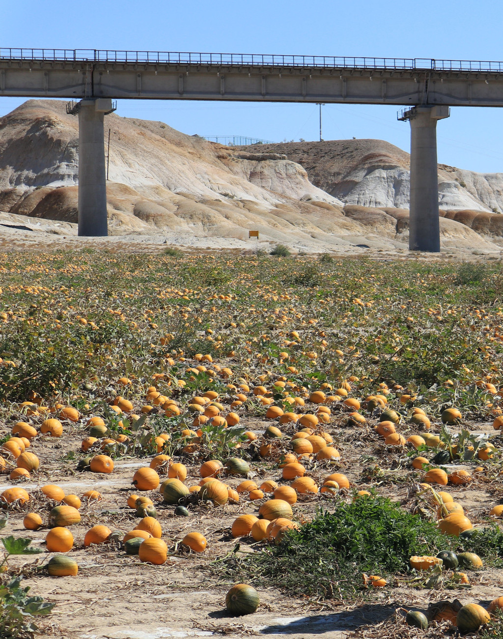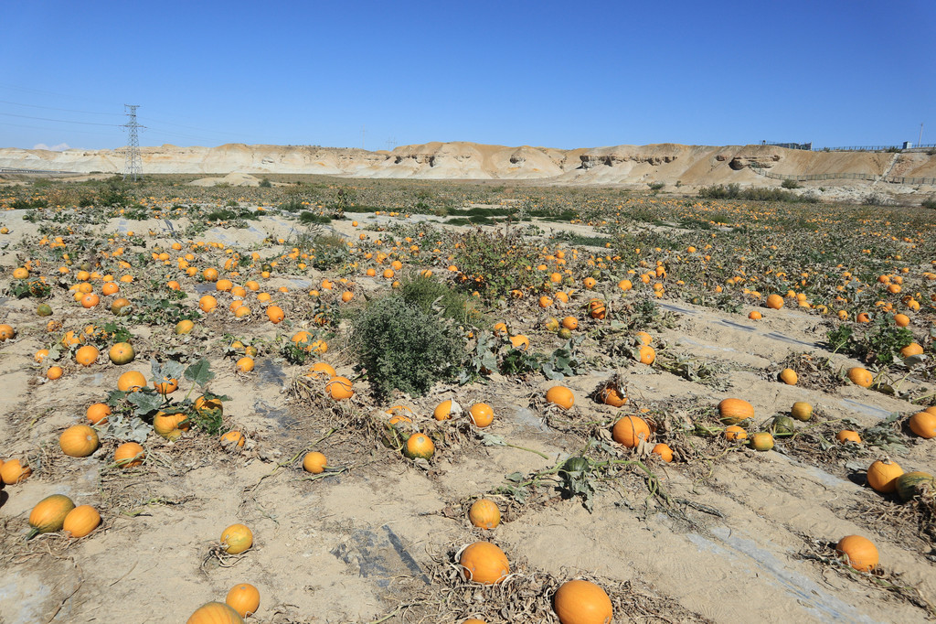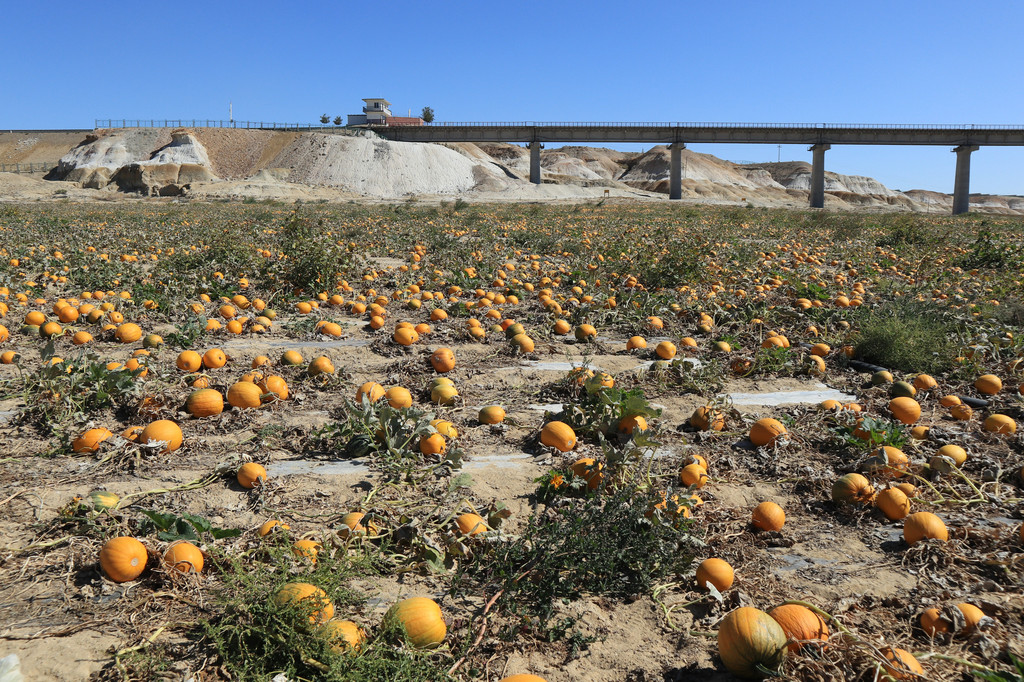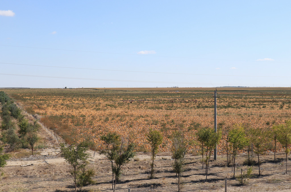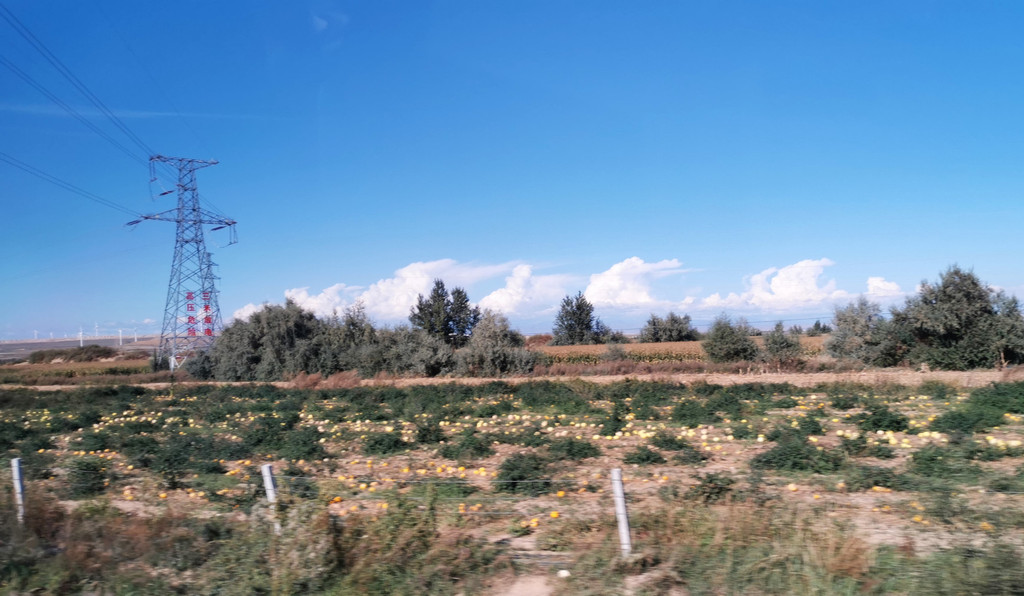 上午行车时,窗外不时掠过的土地上多次闪现这种画面,种植物像是哈密瓜,颜色又不大对,有的近乎金黄色、有的颜色发白、还有绿色的,由于车速太快,一晃而过,辨别不清,关键是连司机都不认识。