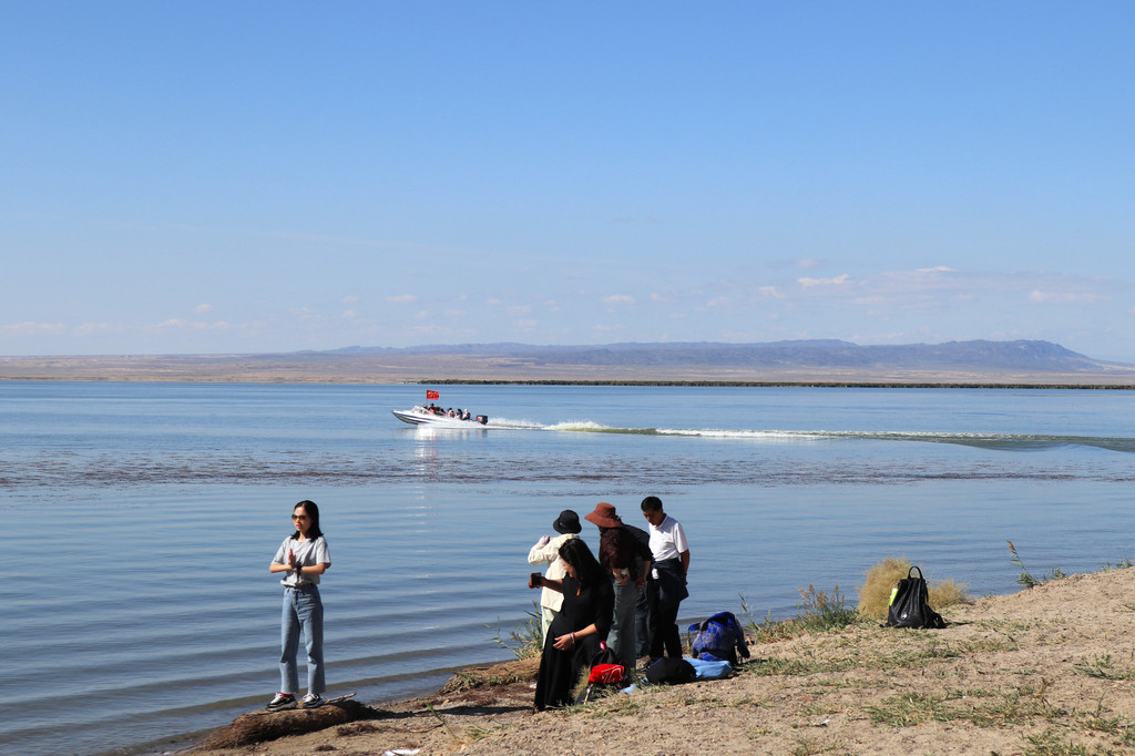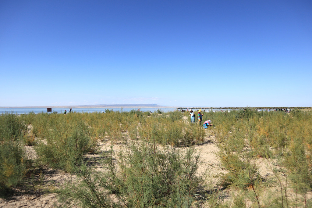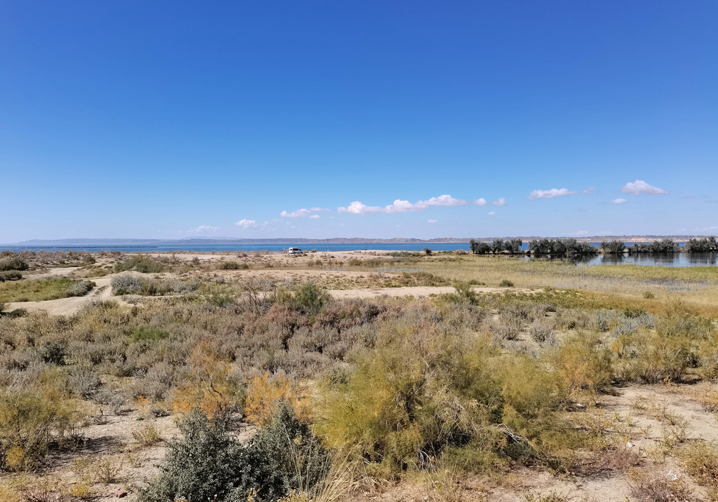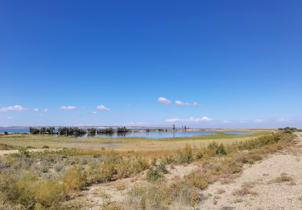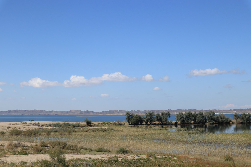 虽然这片水域号称乌伦古湖小海子,但面积并不小,依然那般辽阔、浩渺,水蓝蓝,天蓝蓝,远方更是水天一色。