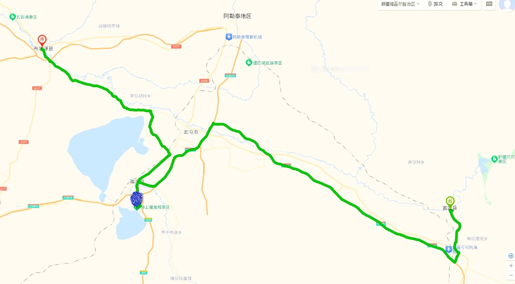 路线图中:大块蓝色是乌伦古湖,小块蓝色是吉力湖(乌伦古湖小海子),深蓝色圆点是海上魔鬼城所在位置。