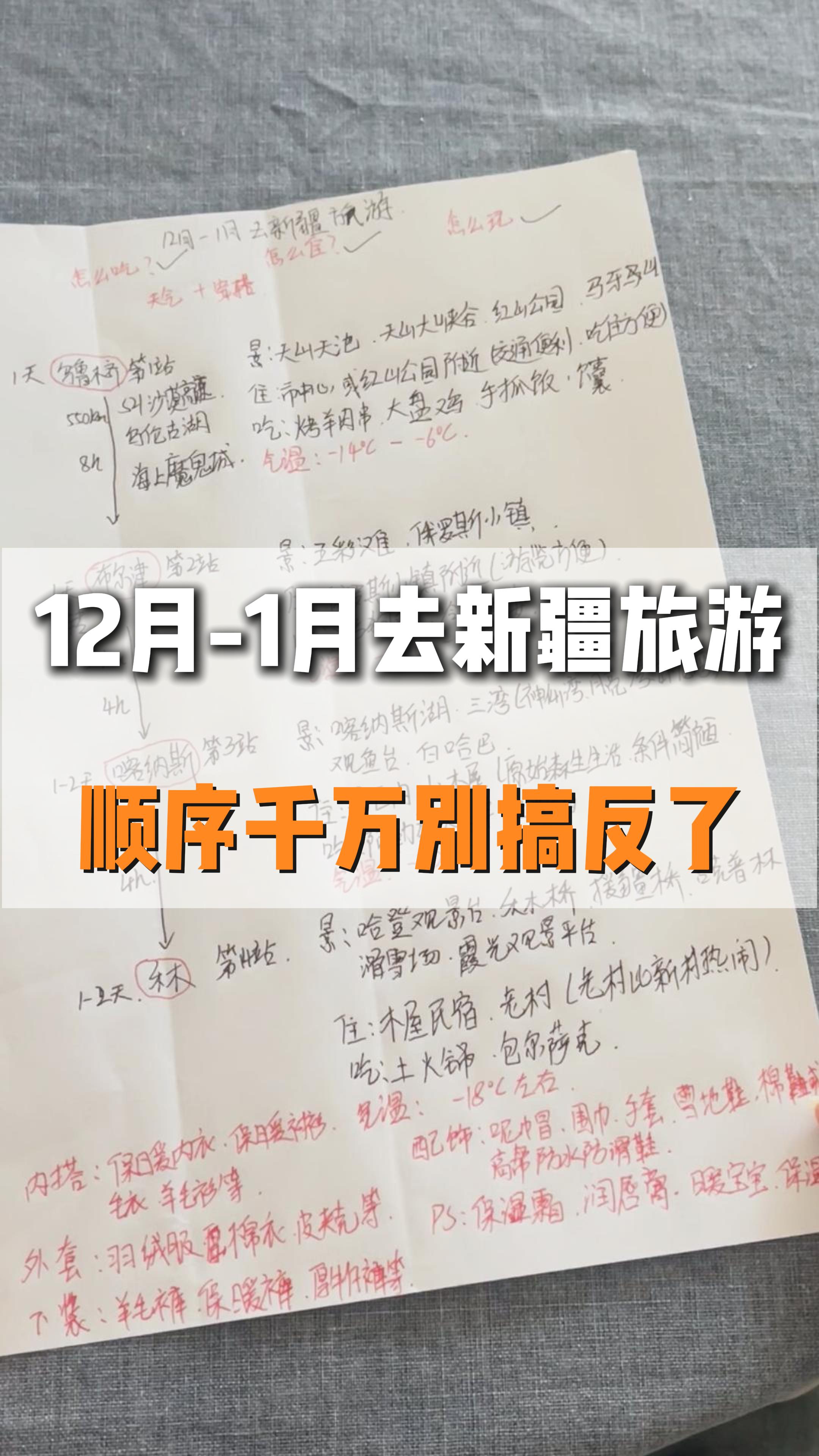 ⚠建议tips: 1.新疆比内地晚时差两个小时这边太阳下山比较晚,九点十点天还是亮的,上班时间晚两小时。基本八点前比较难找到早餐吃。 2. 来新疆旅游建议1-2周提前做好攻略,定好景点门piso,新号并不适合说走就走的旅行 3.新疆不适合穷游,六分之一的面积在新疆呢!真正的地广人稀,尤其是旅游旺季,都是一笔大开销。 4. 南疆以人文景观为主,沙漠戈壁湖泊较多,有美好的故事传说,北疆以优美的自然风光为主,雪山、草原、湖泊、河流、原始森林等。 5.一定要带件冲锋衣或厚一点的衣服,这边不紧早晚温差大,而且山上山下温差也大!! 6.新疆气候明显,温差大,晚上羽绒服中午裙子也是很正常,大多时候穿夏装,一定要做好保暖,带上厚外套 . 行程规划:提前了解景点的距离、交通情况及最佳游览时间,合理安排行程,避免过度紧凑,预留弹性时间应对意外. 文化习俗:新疆是多民族聚居地区,要充分尊重当地的文化习俗、宗教信仰和民族习惯,不随意触犯忌讳,如不在清真餐厅携带非清真食品等. 气候准备:新疆气候多变,早晚温差大,紫外线强,部分地区海拔高。夏季需做好防晒,冬季要注意保暖,前往高海拔地区还需预防高原反应. 交通选择:若条件允许,包车或自驾游可更自由安排行程,但要选正规的旅游或租车公司;乘坐公共交通工具则要提前了解车次和发车时间 饮食安全:选择干净卫生的餐厅和摊位就餐,避免食用生冷食物和过期食品,注意适量饮食,防止肠胃不适. 购物消费:购买特产时要理性,选择正规商店,对比质量和价格,注意查看生产日期、保质期等信息,保留购物凭证以便维权. 景区游览:留意景区规定和提示牌,不随意攀爬文物古迹、破坏景区设施和环境卫生,对于景区内的收费项目要提前了解清楚,避免不必要的消费.#旅行推荐官 #新疆 #新疆是个好地方 #国内旅游线路推荐