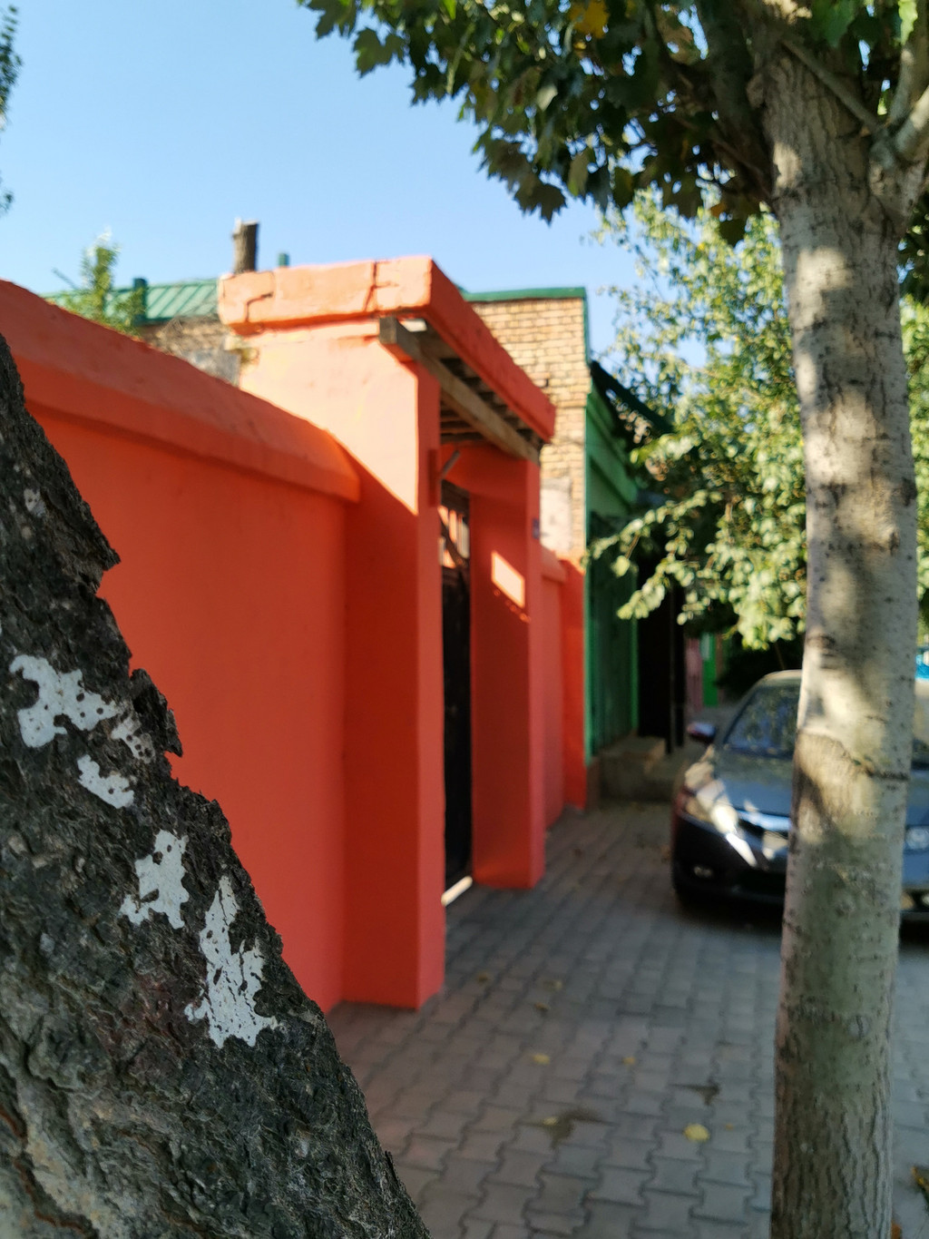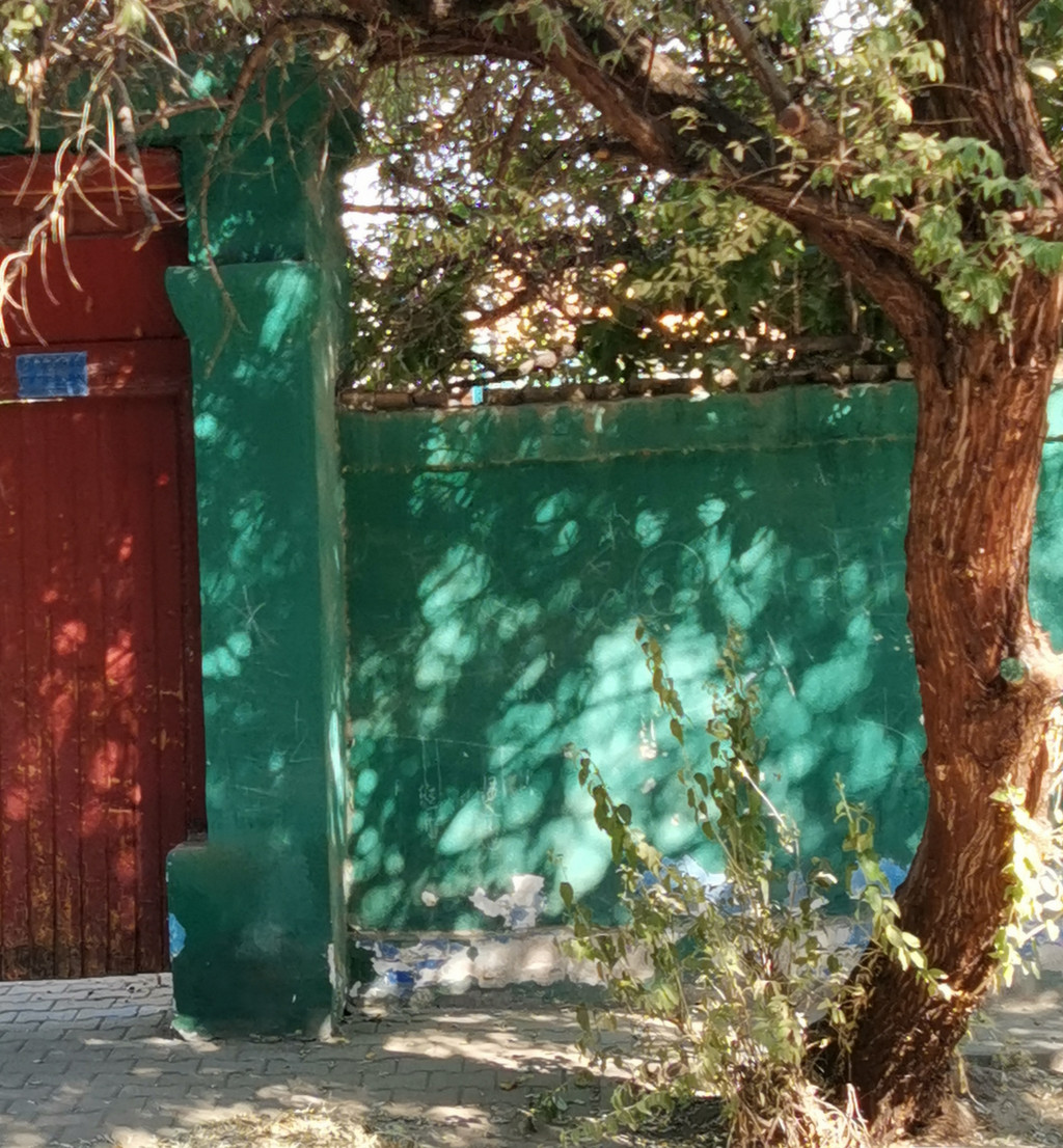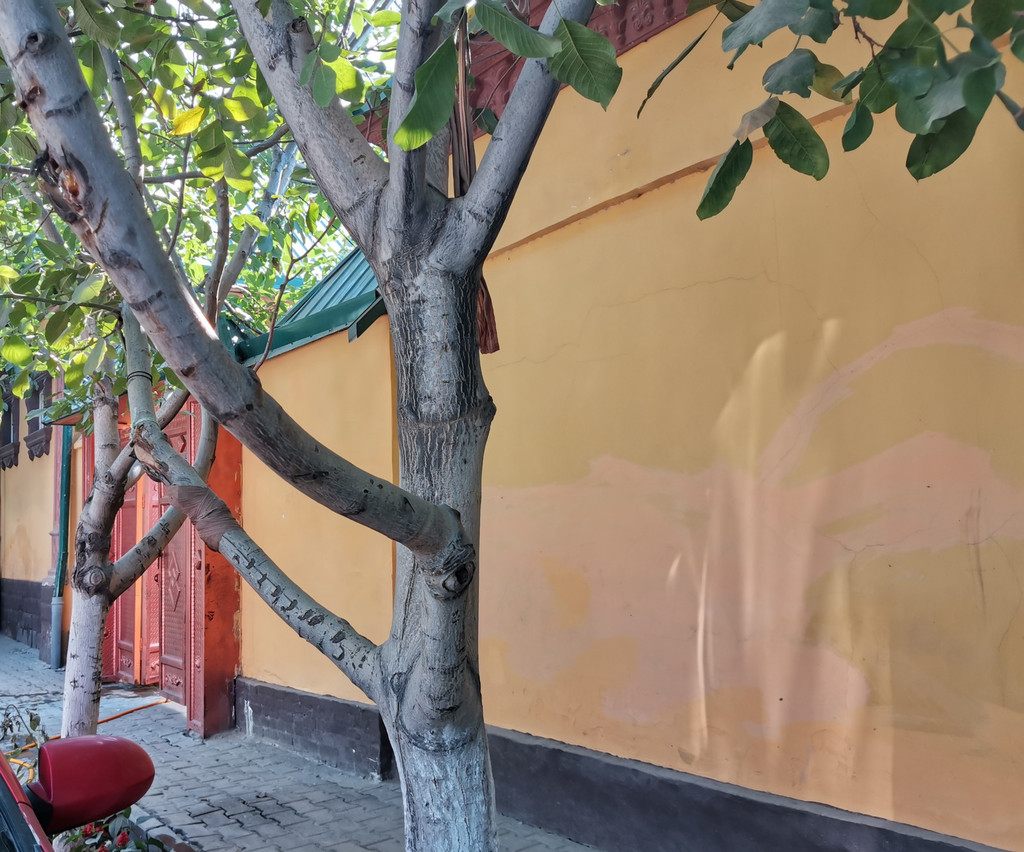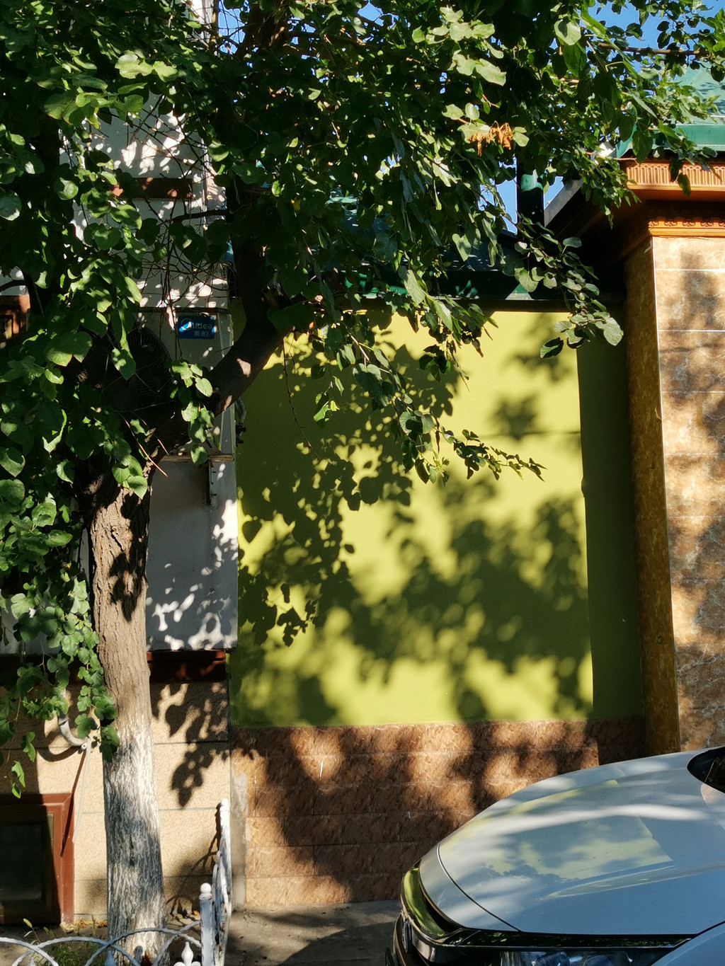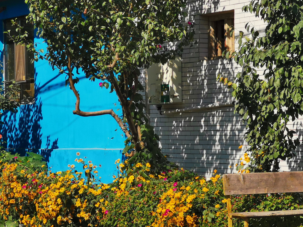 老街每家门口都有果实累累的果树,早上9、10的阳光撒在这些颜色鲜艳的院墙上,也将门前各种果树的树影斑驳地投射在院墙上,这光与影的交错,色彩与历史的交织,成就了老街独特的风味,绚烂中带有丝丝沉静,明媚中又有些许静谧。每个院子门前都有供人休憩的长椅,你可以就这样悠闲地从巷口到巷尾,走走停停,且行且享受,没有人声的嘈杂,没有商业的招徕,没有刻意的生硬,你仿佛穿梭在岁月里,仿佛沉浸在属于自己的世界,时光与生活的气息让你找到最初的自己。这里不需要排队等候拍照打卡,每个人都可能找到自己钟情的小院。