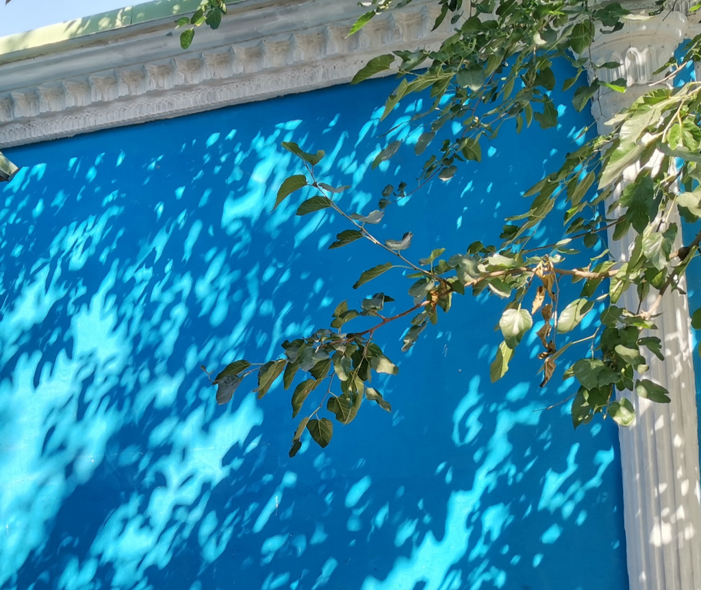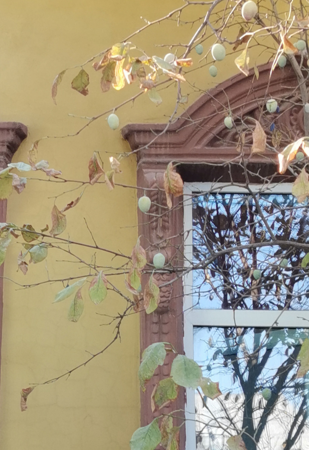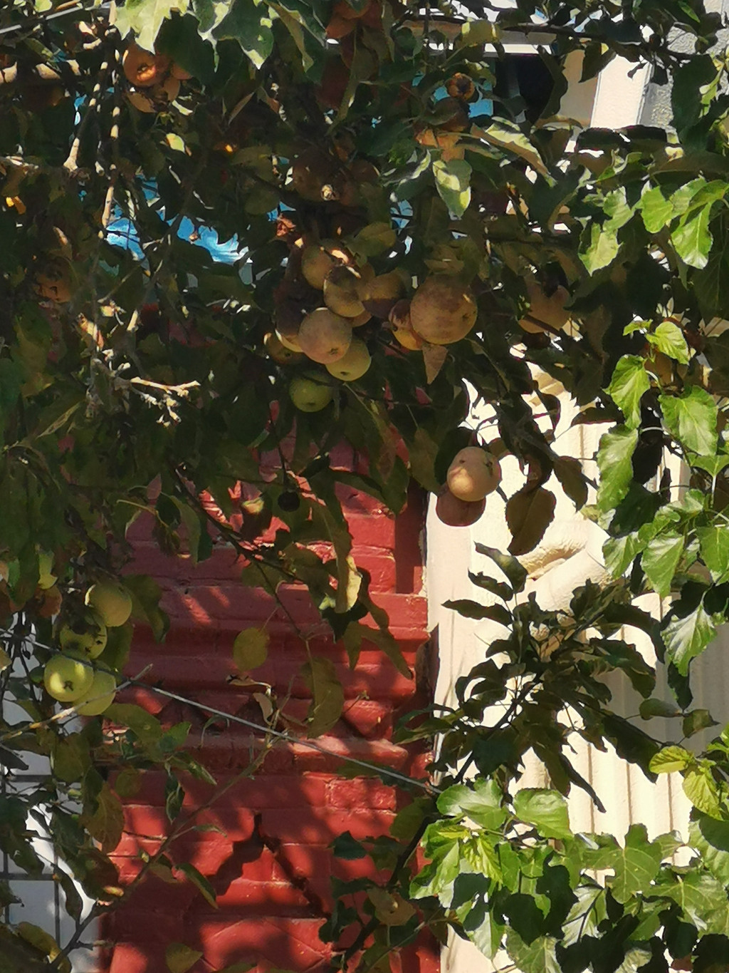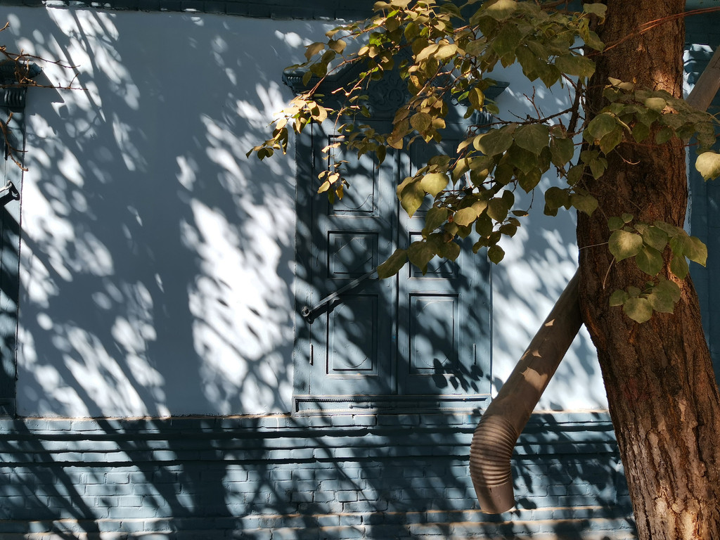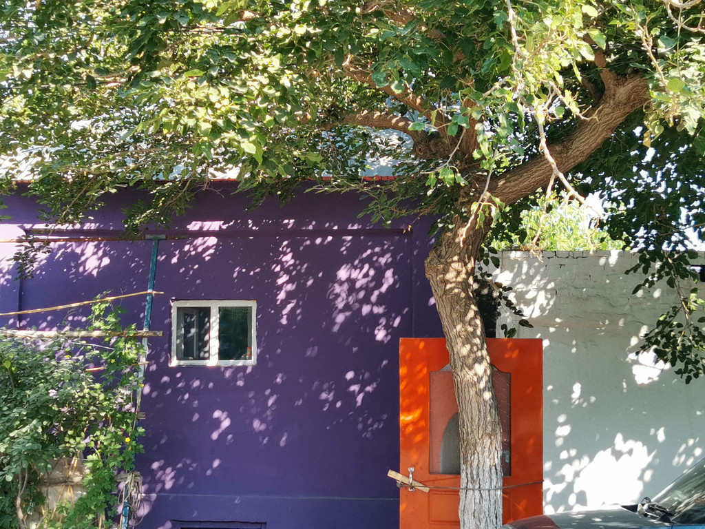 老街每家门口都有果实累累的果树,早上9、10的阳光撒在这些颜色鲜艳的院墙上,也将门前各种果树的树影斑驳地投射在院墙上,这光与影的交错,色彩与历史的交织,成就了老街独特的风味,绚烂中带有丝丝沉静,明媚中又有些许静谧。每个院子门前都有供人休憩的长椅,你可以就这样悠闲地从巷口到巷尾,走走停停,且行且享受,没有人声的嘈杂,没有商业的招徕,没有刻意的生硬,你仿佛穿梭在岁月里,仿佛沉浸在属于自己的世界,时光与生活的气息让你找到最初的自己。这里不需要排队等候拍照打卡,每个人都可能找到自己钟情的小院。