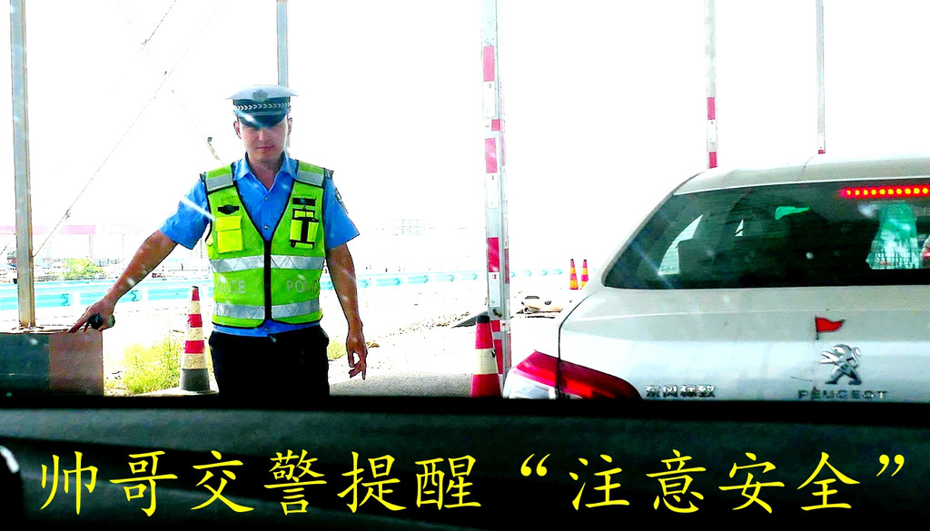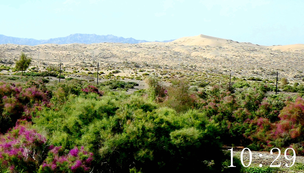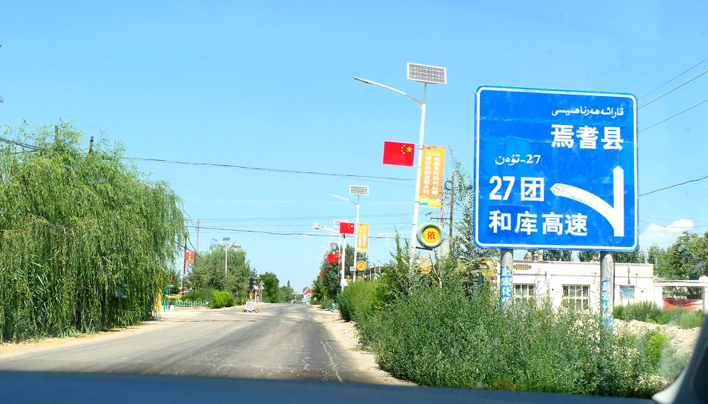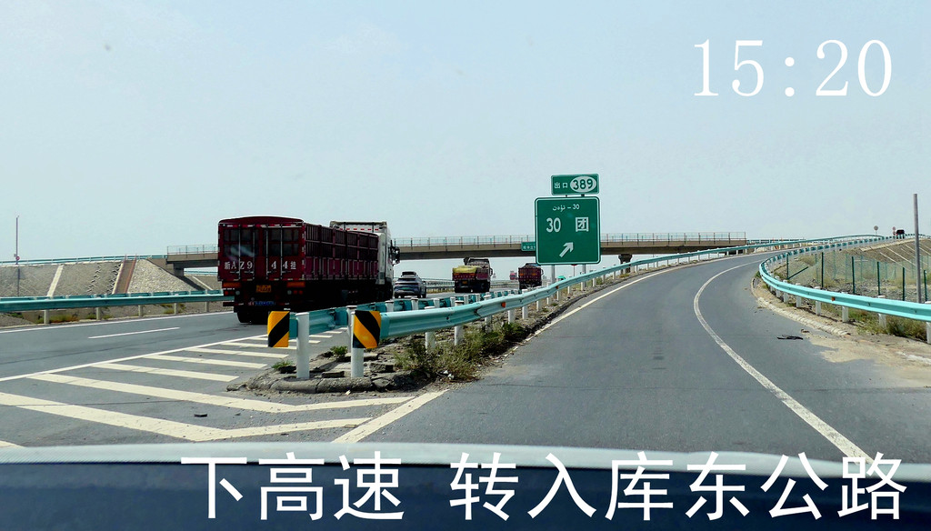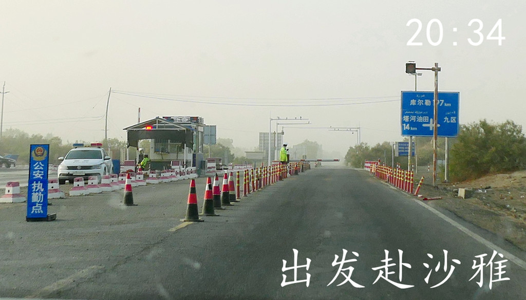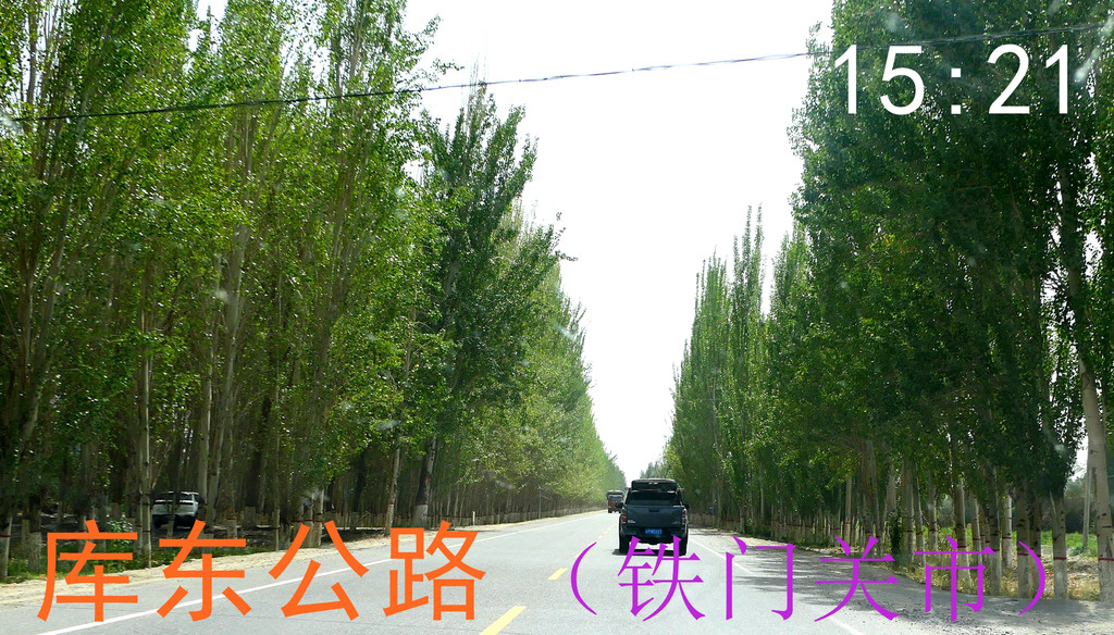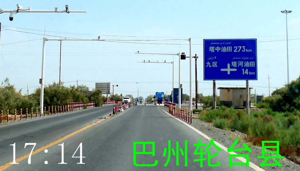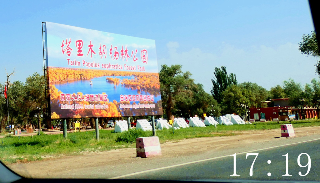 14:39,驶经土和高速“库尔勒收费站”。14:50,在库尔勒市铁路西站附近通过公安检查站,维吾尔族帅哥交警礼貌敬礼,温馨提醒“注意安全,别开太快”。库尔勒是巴音郭楞蒙古自治州的首府。15:20,在铁门关市境内“30团出口”驶离土和高速,转进库东公路,继续向着塔里木胡杨林公园(轮台县)进发。