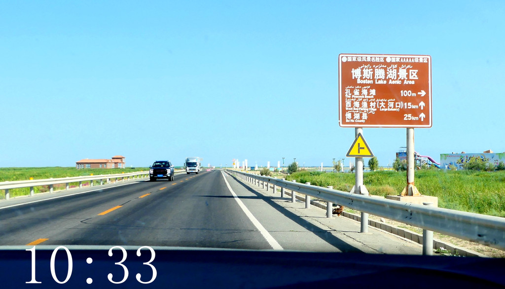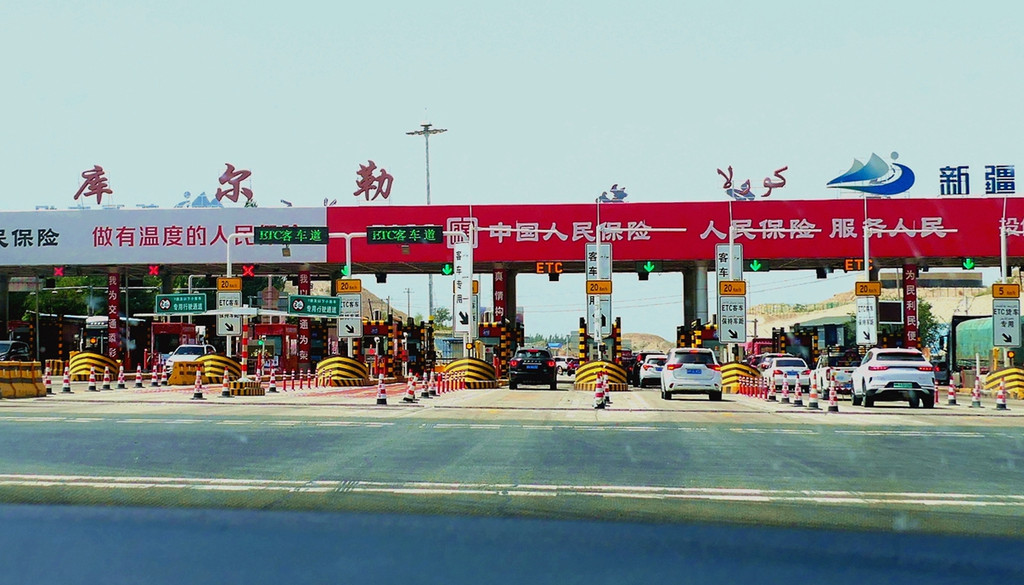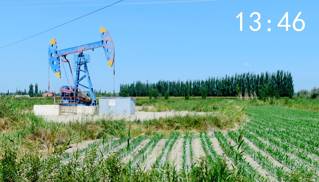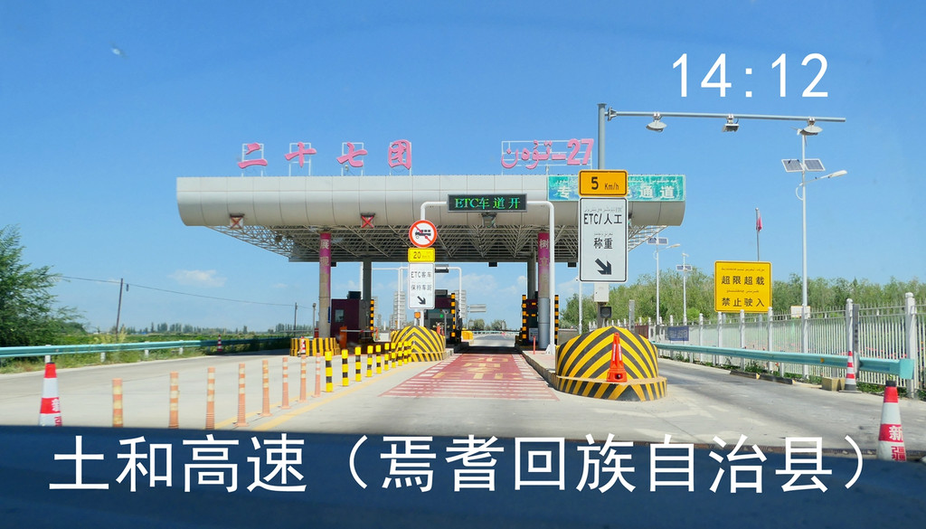 13:46,车辆经过焉耆回族自治县的 “九号渠村”,田野间的磕头泵暗示附近或许有油田。14:12,我们在焉耆回族自治县的27团收费站驶上土和高速。