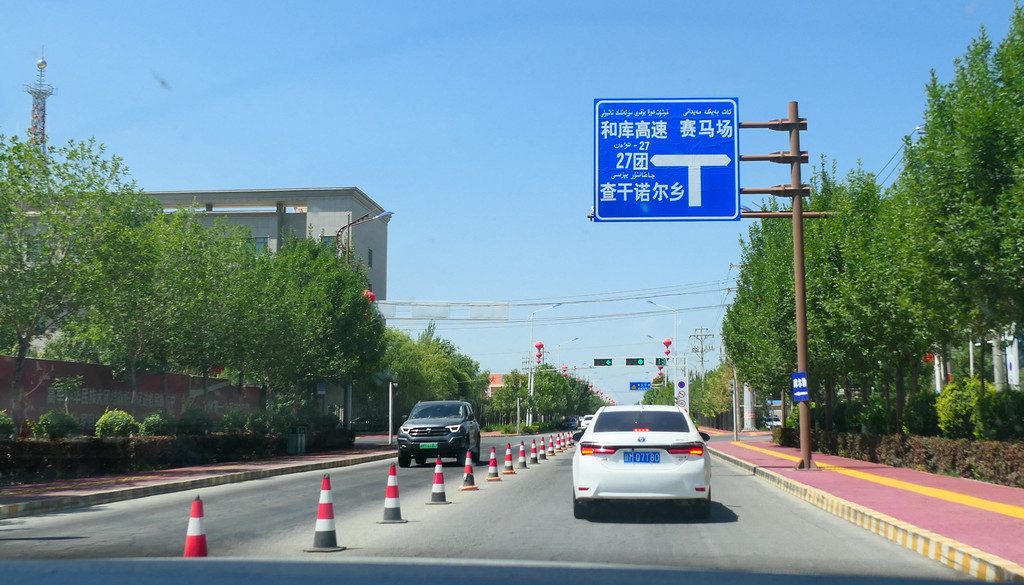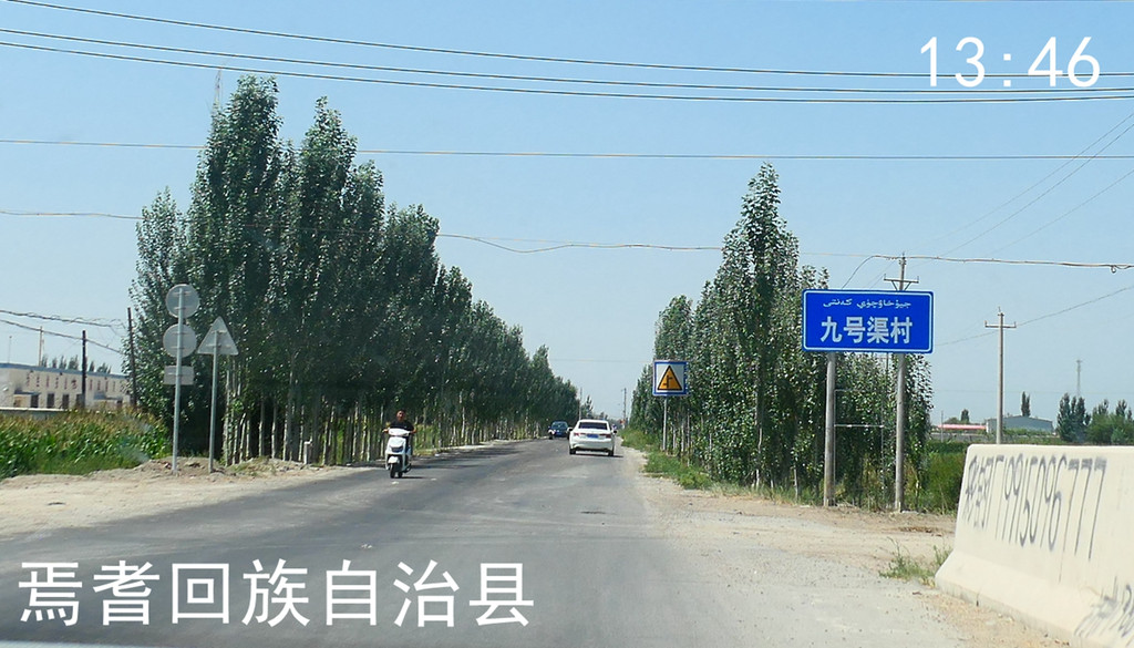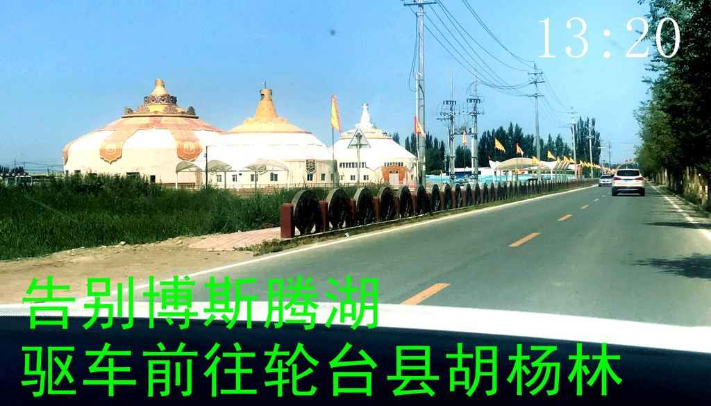 13:19,我们离开农家乐,驱车前往位于轮台县轮南镇的塔里木胡杨林公园。出发后,驾车沿 G218 向北行驶,途经整洁漂亮的博湖县城。13:33过开都河桥后,我们转向西行,驶入乡间公路。