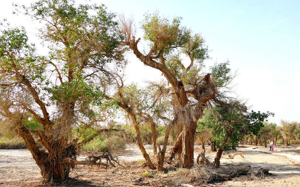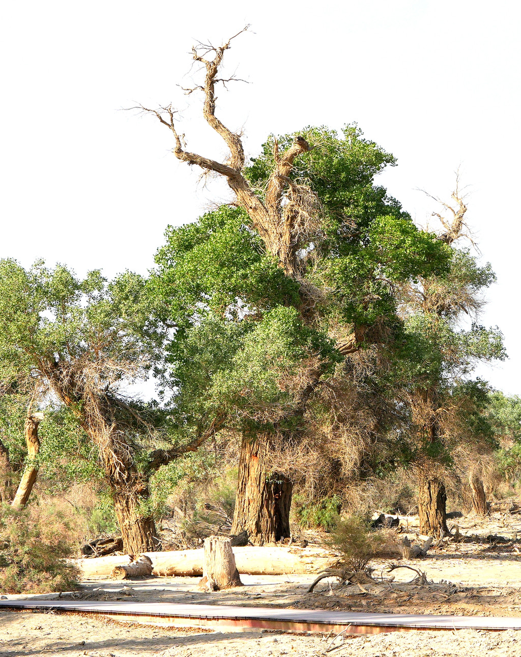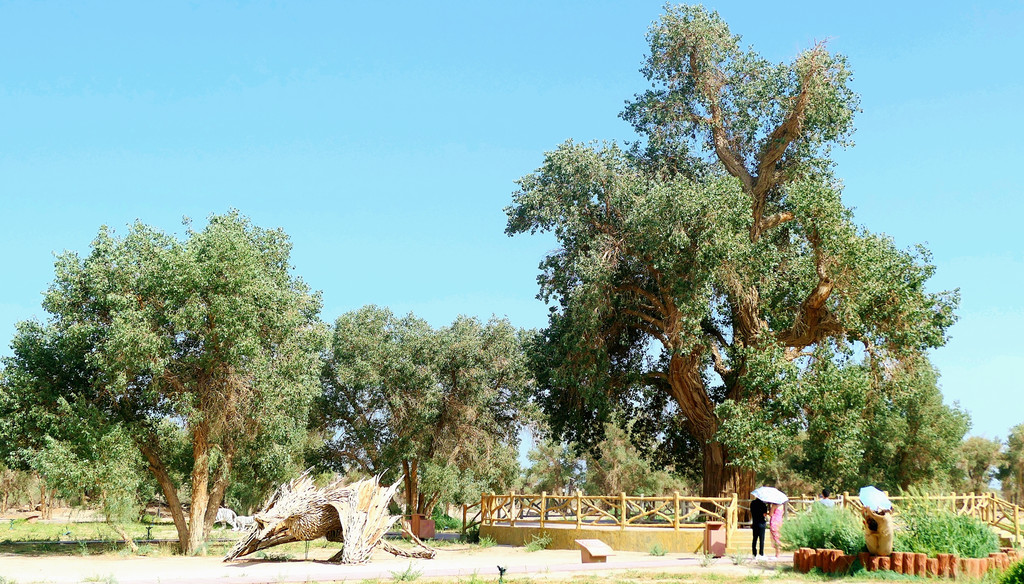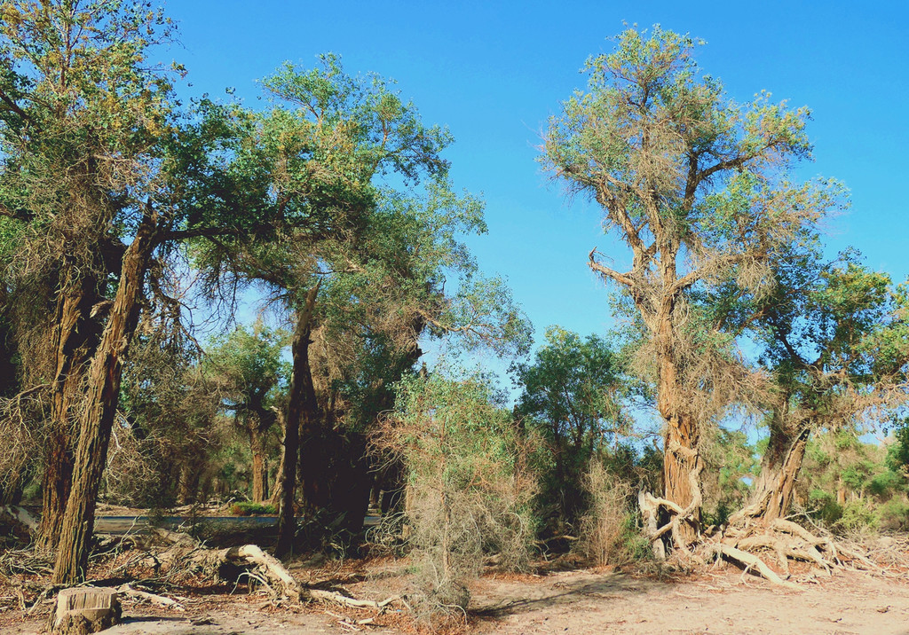 与公园门口的那株“胡杨王”相比,这里的胡杨都不算高大,但树干却是堪称为粗壮,经常是需数人才能合抱,树顶枝杈纵横交错,形成繁茂的树冠,犹如巨大的伞盖,远远望去,蔚为壮观。