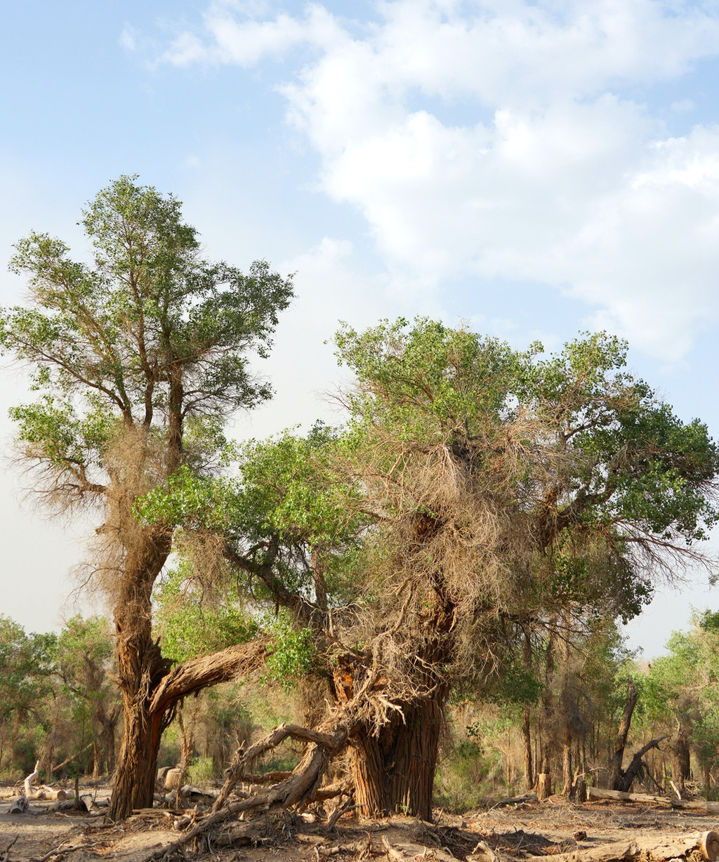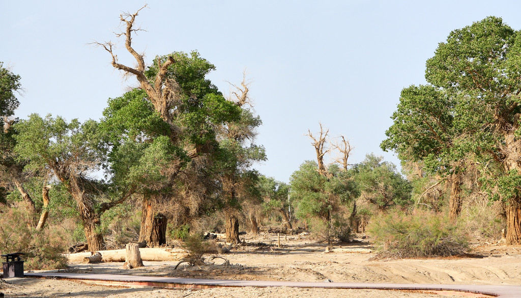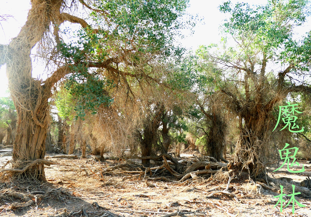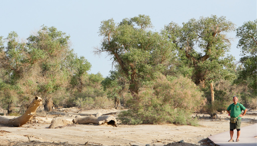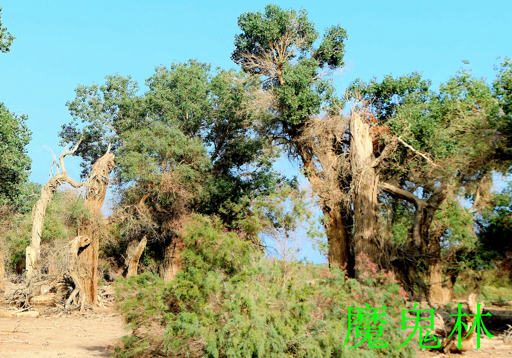 与公园门口的那株“胡杨王”相比,这里的胡杨都不算高大,但树干却是堪称为粗壮,经常是需数人才能合抱,树顶枝杈纵横交错,形成繁茂的树冠,犹如巨大的伞盖,远远望去,蔚为壮观。