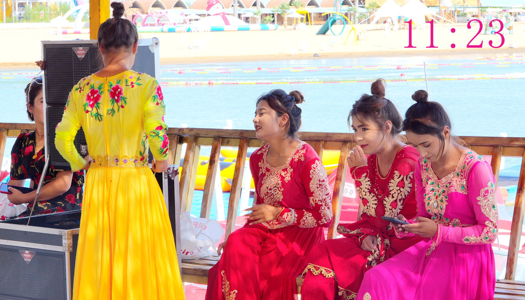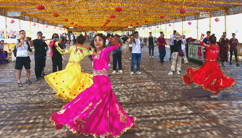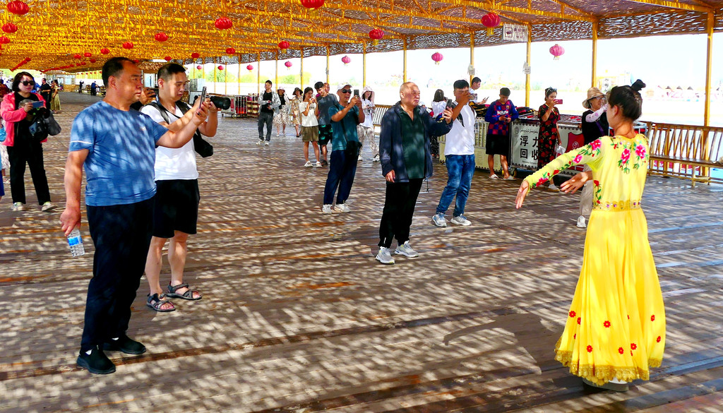 栈桥上的表演每半小时一场,11:30响起了音乐,舞蹈表演也随即开场。维吾尔族女孩的演出随性自然,不仅不介意游客近距离拍摄,还欢迎大家客串参与。我和X.J.相互拍照,都将对方定格在这充满活力的舞蹈场景之中。