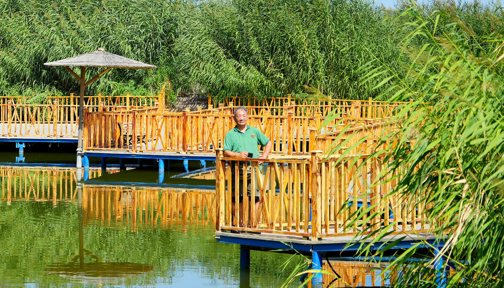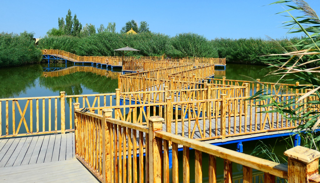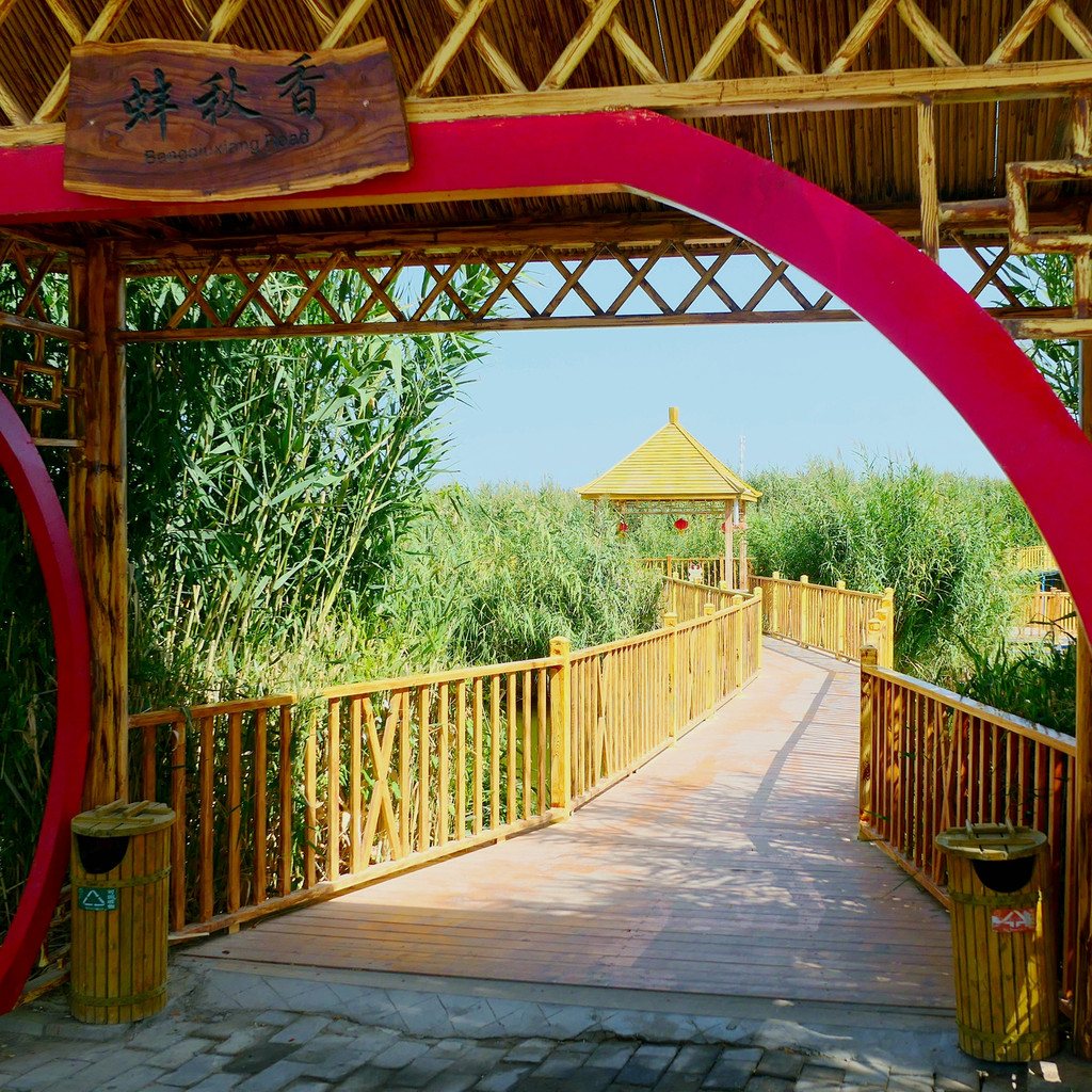 博斯腾湖是全国四大苇区之一,拥有约350平方公里的芦苇沼泽。从栈桥到景区大门这一路上,也有几处芦苇景园,木栈道在水面上蜿蜒,引领游人深入芦苇丛中探秘。只可惜我们时间紧迫,仅在景园入口匆匆打卡,便继续赶往景区大门。