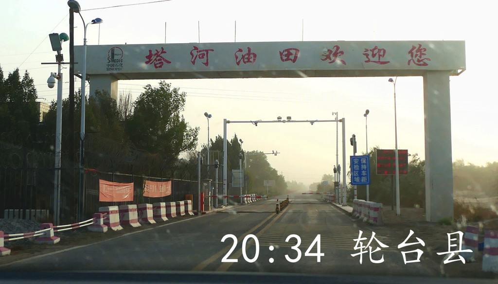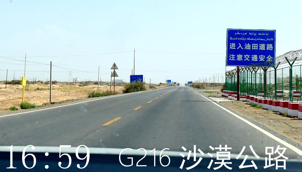 16:38,在中石油轮南加油站加油180元后,继续沿库东公路西行,16:51左拐,驶入G216沙漠公路,随即改为向南行进。这段公路隶属油田管辖,路口矗立着高大的中石油牌坊,“塔里木沙漠公路”七个大字格外醒目。路边有警示牌提示“油田内部通道,严禁外部车辆驶入”,可我们一路畅行,并未遇到任何阻拦。