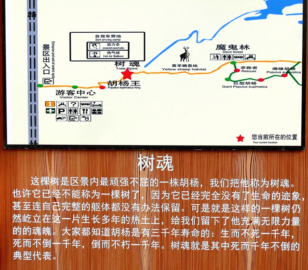 19:45,我们继续乘车,三分钟后抵达最后一处景点“树魂”,这里仅有一颗枯死却屹立不倒的胡杨。标牌介绍显示,这株胡杨是景区内最为顽强的存在:它已彻底失去生机,枯死的树干只剩半边外壳,几乎已是不能再称之为树。可即便如此,它依然挺拔地直指苍穹,诠释着胡杨 “死而不倒一千年”的传奇。