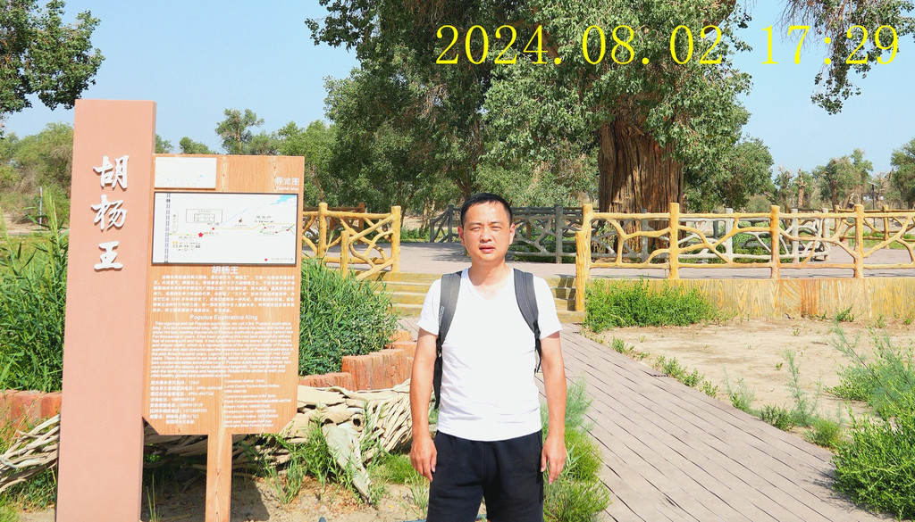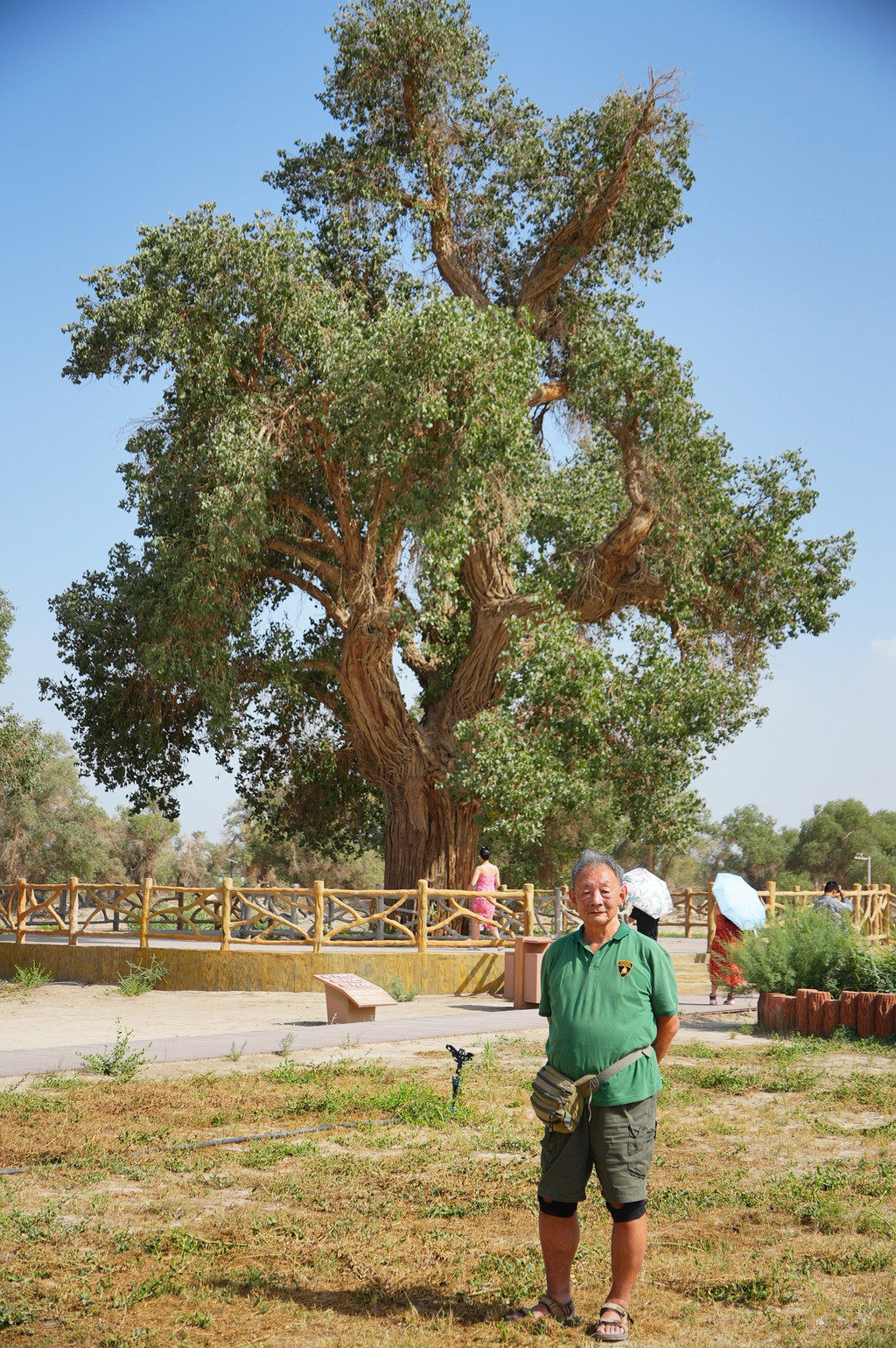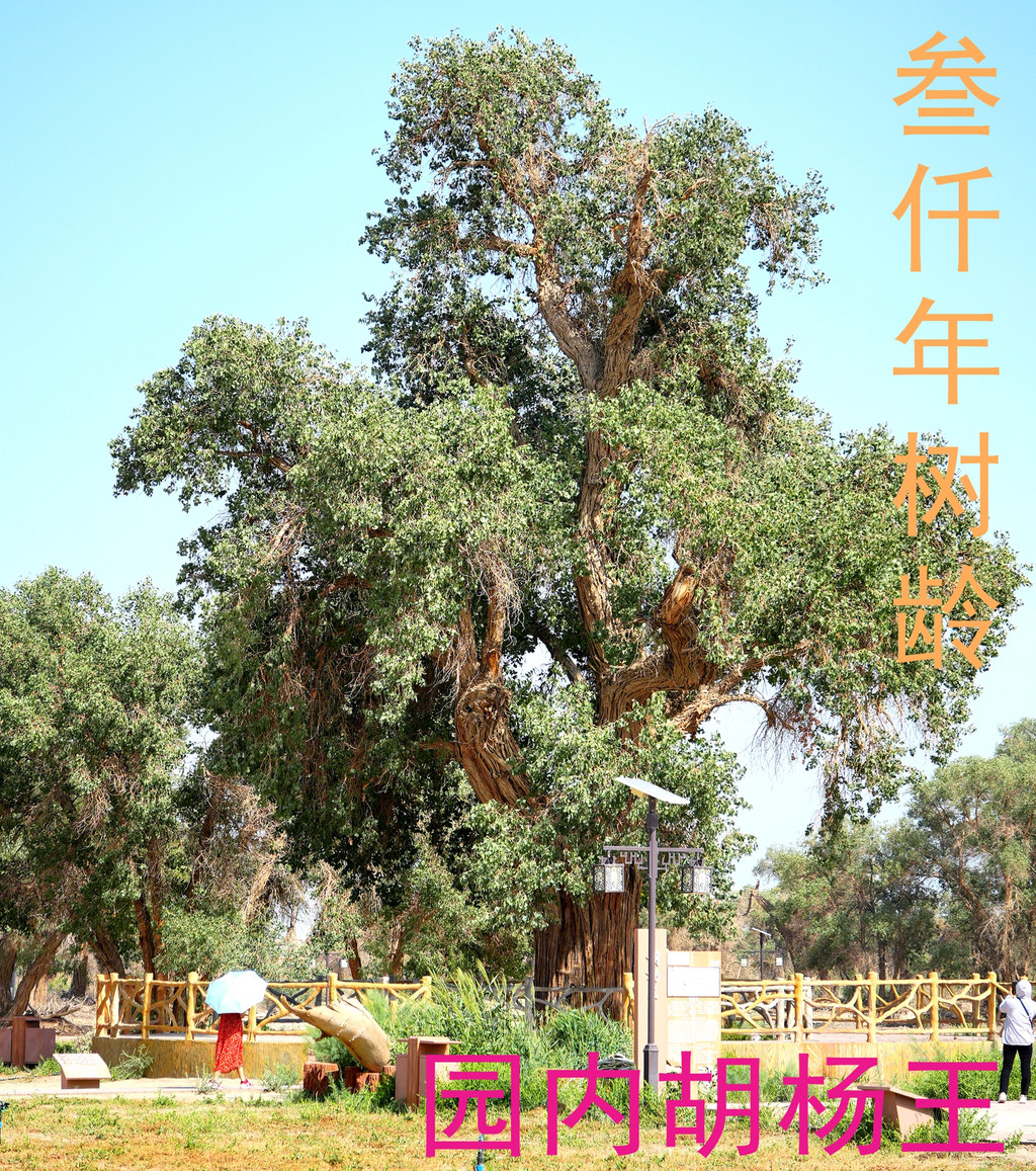 17:27,我们抵达观光车乘车点。距离发车还有十多分钟,工作人员推荐我们去看看旁边的“胡杨王”。它是园内最高大、最古老的胡杨,树龄已有3000多年。