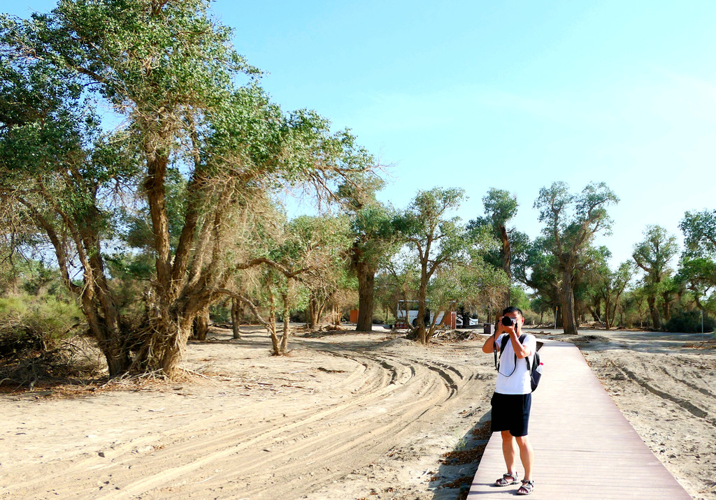 18:09抵达折返点“恰阳河火车站”,观光车司机让大家自由活动,半小时后原地集合。此处可乘小火车(须额外付费),深入胡杨林深处观光,但同车六人都没兴趣,于是便结伴同行,沿着林中小径漫步。