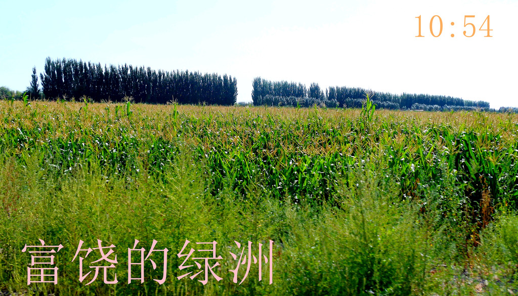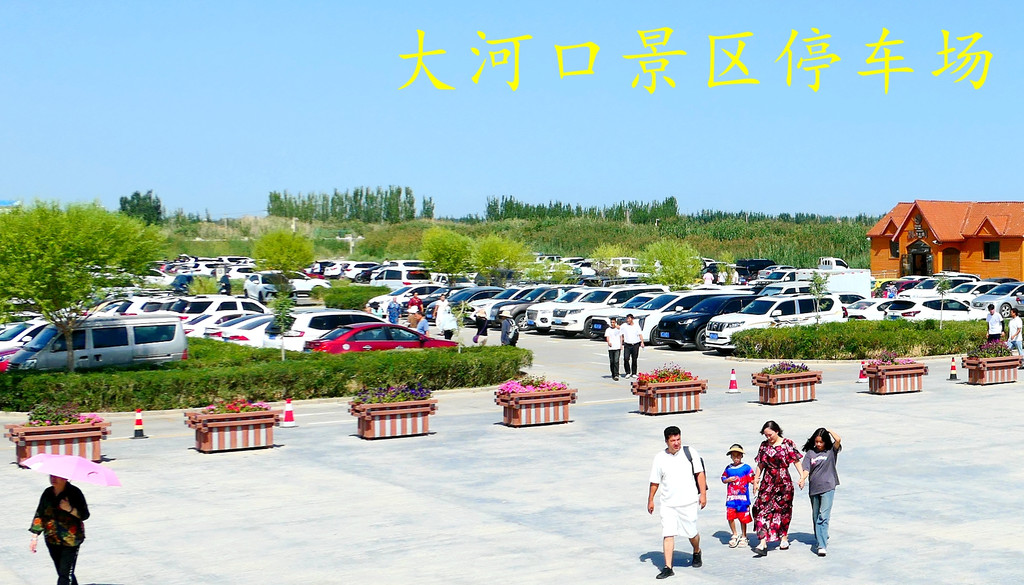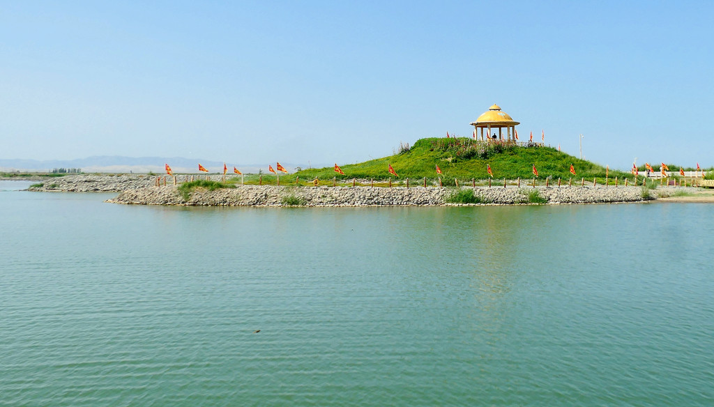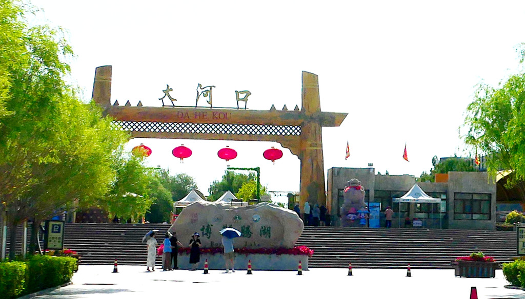 离开孔雀海滩后,我们沿着国道G218(伊宁-若羌段)向北行驶。这一段国道又称“环博斯腾湖旅游公路”,道路状况颇佳。右手边就是博斯腾湖,湖面上有大片黄色,不知是啥,猜想应为某种水生植物正在开花。沿途都是富饶的绿洲,大片的玉米正在茁壮生长。10:55看到路边有几个漂亮的大型蒙古包,我们随即右拐,驶向“大河口”景区,11:00抵达景区停车场。