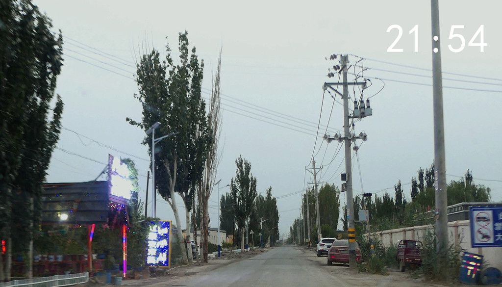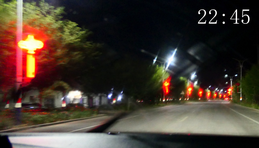 21:49,暮色将尽,我们依然是在狭窄乡道上颠簸。但所幸不久后,终于是赶在天空全黑之前驶出了乡道,进入较为宽阔的县道。可县道虽然较宽,但路面已是漆黑一片,即便车开大灯,视线依然模糊,驾驶难度陡增。更麻烦的是,每隔一段路就会遇到水泥路障,汽车得减速、绕弯,方能顺利通过。这些路障虽有信号灯闪烁,但却不甚明亮,不靠近根本就很难发现。儿子全神贯注地开着车,我也紧盯着前方,帮他时刻留意路障。想来,设置这些路障之原本目的,就是不想让过往车辆开得过快。