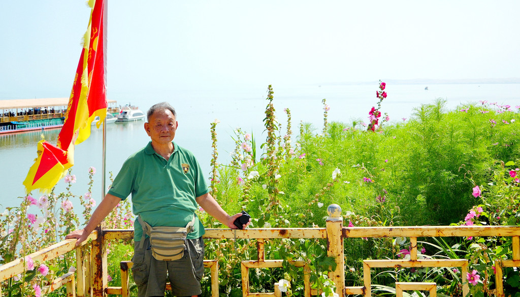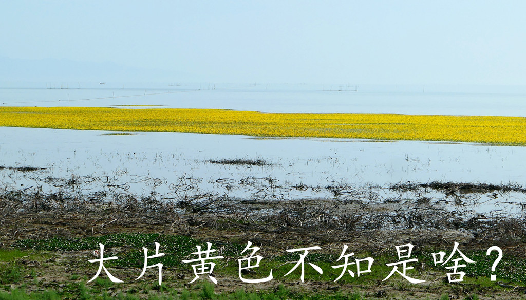 栈桥旁的小山包上有座亭子,它是附近地域制高点,下栈桥后也顺便过去看看。登上小亭远眺,博斯腾湖的美景可以看得更加真切。在亭中巧遇一位来自昌吉的新疆本地人,跟他攀谈了一会儿。他热情地向我介绍,小亭南侧不远处,水面盛开着大片黄花的区域便是开都河的入湖河口。在水面上漂浮的黄花,是博斯腾湖特有之野生睡莲。博斯腾湖面积达1600多平方公里,湖水常年有进(以开都河为主),有出(孔雀河),是我国最大的内陆淡水吞吐湖。湖区西南部拥有近8万亩野生睡莲,是全国最大的野生睡莲生长区域。