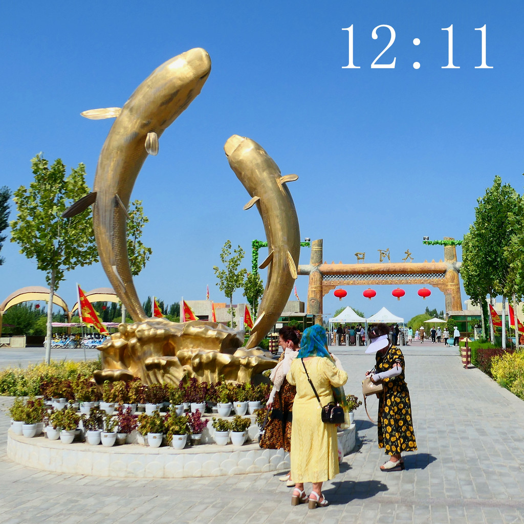 12:13走到景区大门,门内有一座高大的金色双鱼雕塑。博斯腾湖是新疆最大的渔