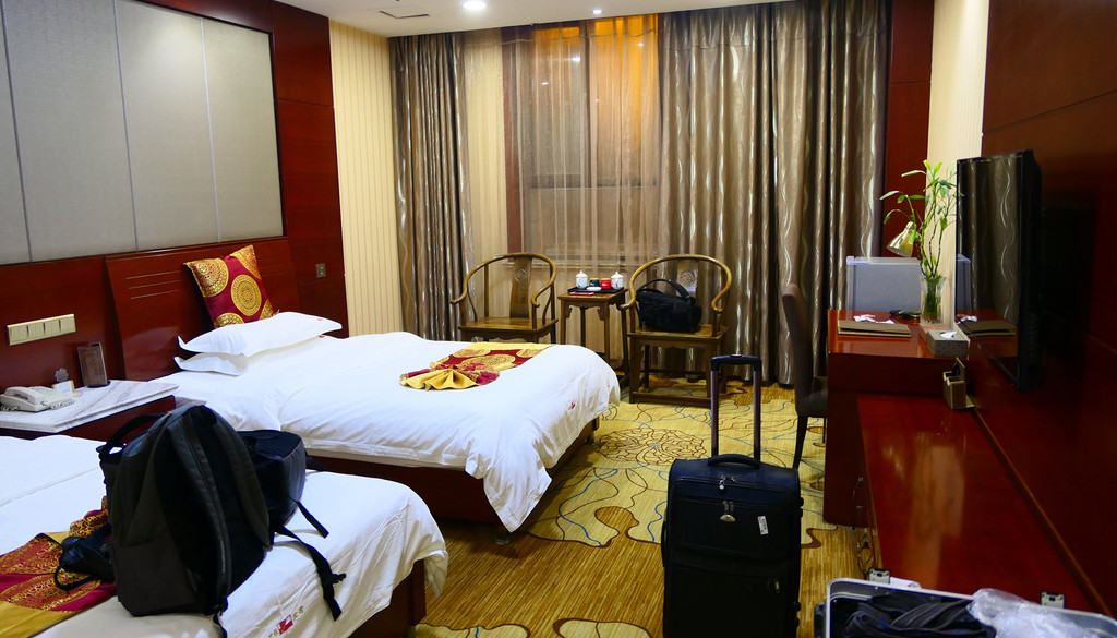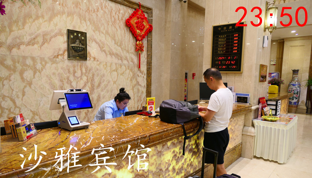 22:45驶经塔里木镇,一片漆黑的公路上终于有了些许亮光,街边绿化树上还有彩灯闪烁。23:38抵达沙雅,23:52入住沙雅宾馆客房。房价216元/晚,感觉相当不错。时间已是8月3日凌晨,但街上仍有餐馆营业,X.J.询问要不要去吃晚餐,我说不饿,他也说不饿,于是晚餐就免了。