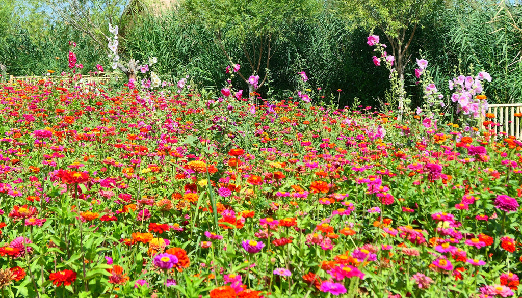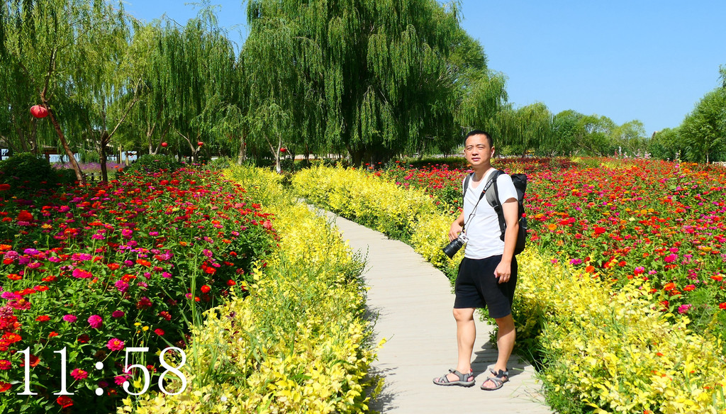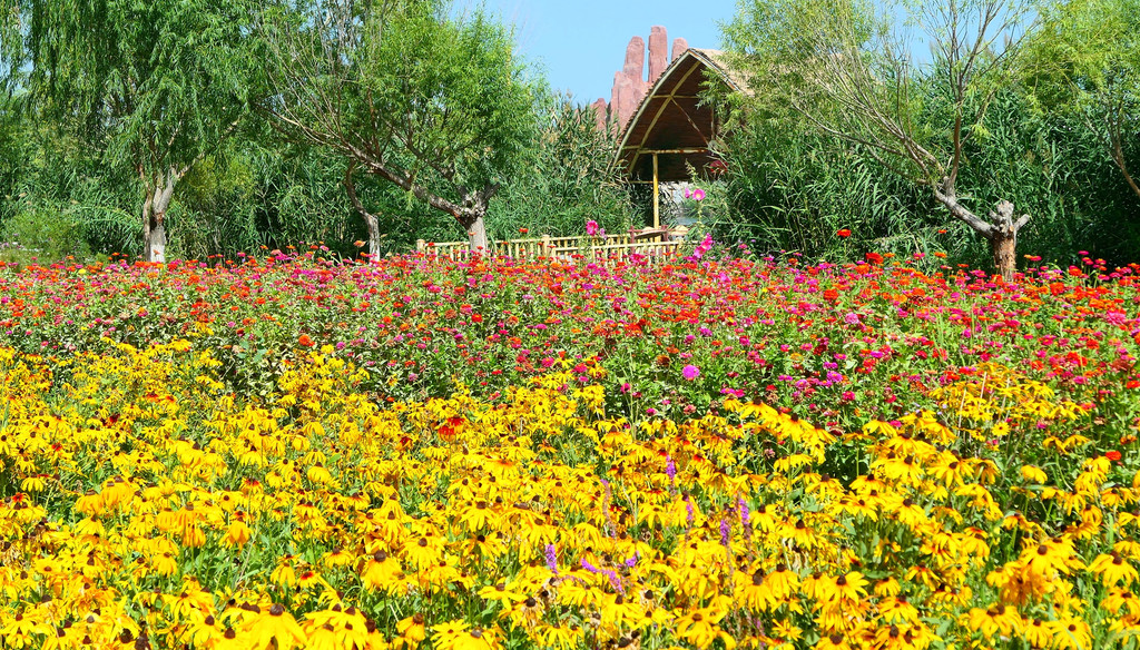 走下小山以后,我们便直奔景区大门,途中邂逅大片人工种植的花海。花径小路蜿蜒曲折,与主路相伴而行,我俩沿着花间小路漫步,各色鲜花在我们身旁竞相绽放,五彩缤纷,花团锦簇,令人目不暇接。