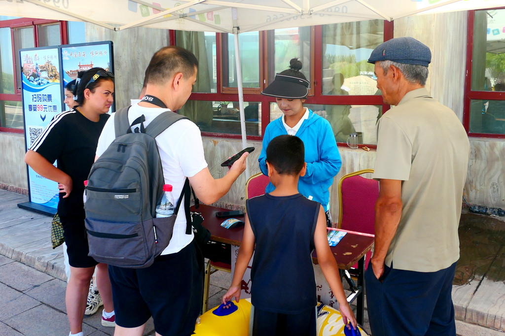 景区停车场面积颇大,此时已有很多汽车停放。游客多为新疆本地人,随处可见印欧人种的面孔。X.J.购票,我是出示身份证免费,11:08两人进入景区。
