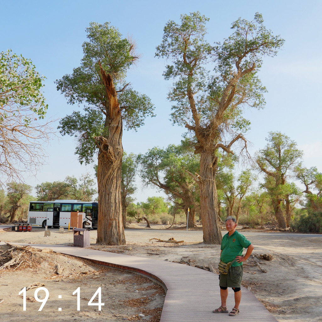 “树魂”距离大巴车的始发乘车点不远,我们下车后立即走出公园大门,19:55离开胡杨林公园,驱车前往塔里木河大桥。掐指一算,我们乘坐大巴车的观光时间,也刚好就是景区工作人员所声称的两小时20分钟左右。