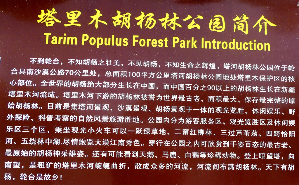 胡杨是最古老的树种,迄今已在地球上存活一亿三千万年以上。全世界的胡杨绝大部分生长在中国,而中国90%以上的胡杨都是生长在新疆塔里木河流域。俗话说,不到轮台,不知胡杨之壮美,不见胡杨,不知生命只辉煌。塔里木河胡杨林公园地处轮台县的塔里木河沿岸,总面积达100平方公里,被誉为世界最古老、面积最大、保存最完整、也是最为原始的胡杨林保护区。