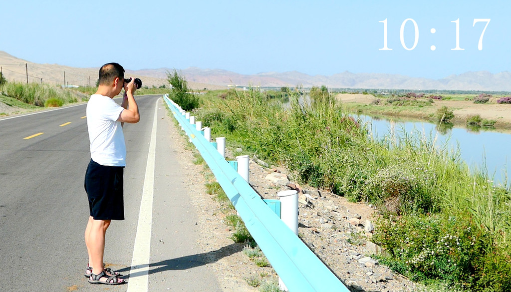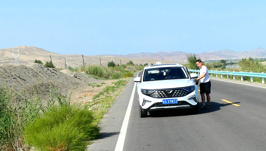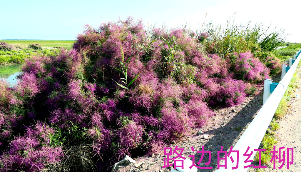 得益于河水滋润,沿途植被长势喜人,显得生机勃勃。特别是道路两旁一丛丛的红柳,翠绿的细小叶片,相伴团团簇簇的红花,红绿相衬,明艳夺目,也是格外地好看。两人见此美景,赶忙下车,手捧相机,一顿狂拍。