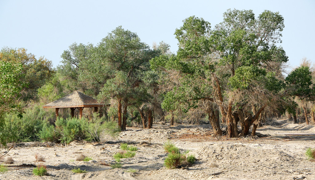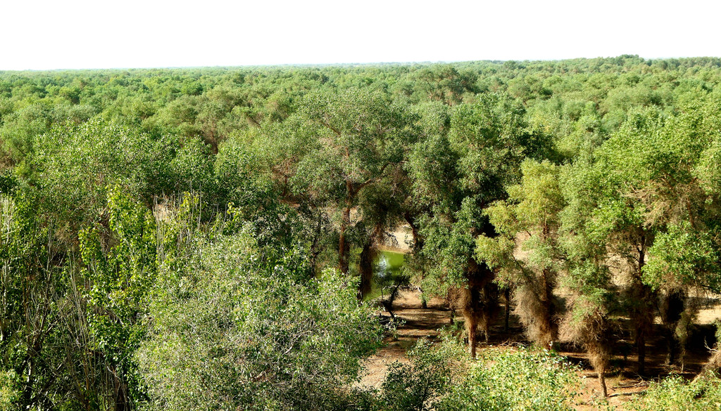 18:20登上瞭望塔顶,放眼所及都是茂密的胡杨,广袤的绿色一眼望不到边。附近有条小河静静流淌,它应该就是的恰阳河。河畔虽有游艇停靠,但码头上却是空无一人,显得格外冷清。