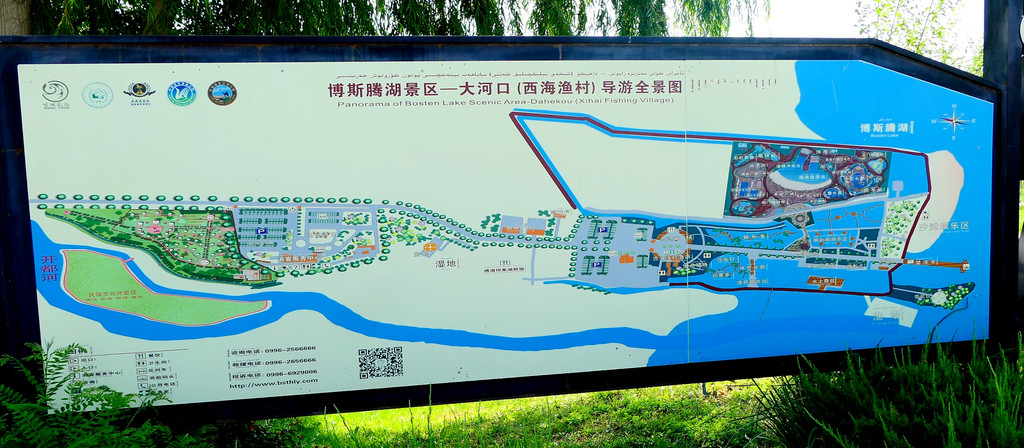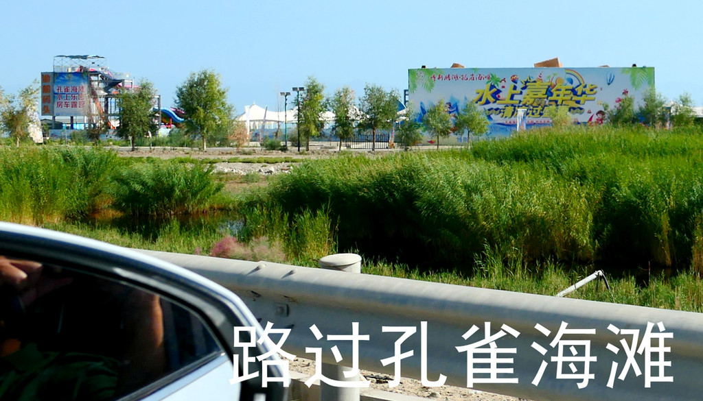 继续前行,10:33达孔雀海滩,此处全称“孔雀海滩水上乐园”,湖畔构筑了众多戏水设施。我们正拟购票入园,看到不少当地人都是带着小朋友前来。一番询问后得知,孔雀海滩主要是供孩童玩水,没啥风景,大河口才是真正的旅游景区。于是,我们没有停留,直接驱车赶往大河口。值得一提的是,这里也正是博斯腾湖的出水口,著名的孔雀河便是发源于此。博斯腾湖之水经由孔雀河,一路朝向罗布泊流淌,最终消失在茫茫沙漠之中。