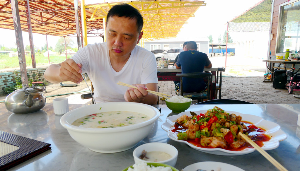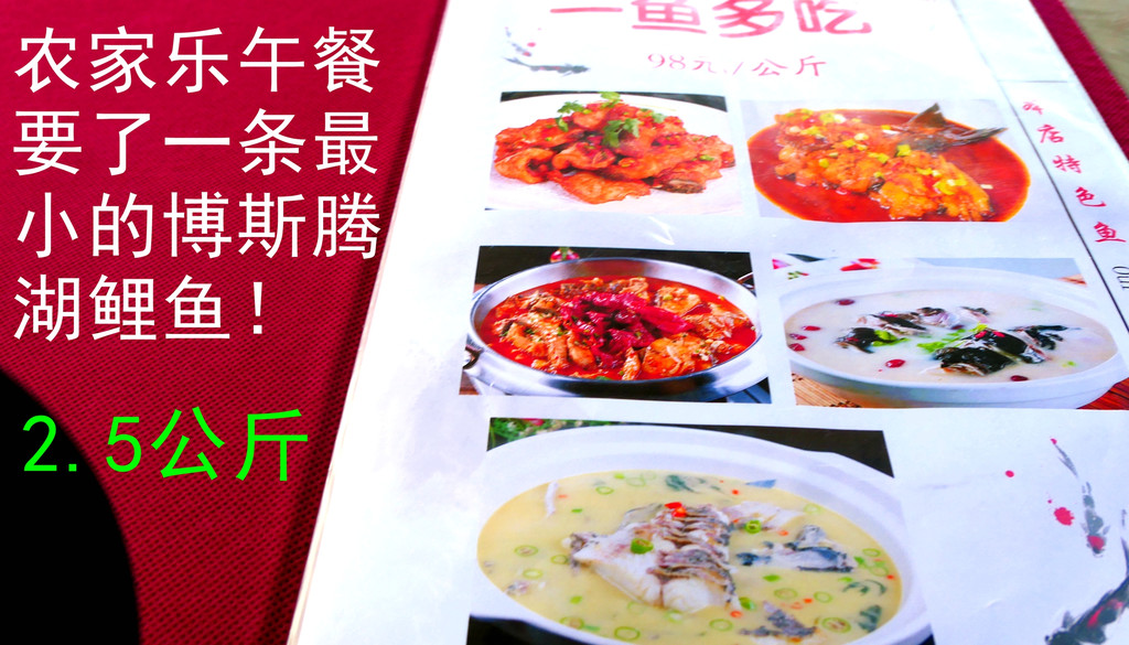 在停车场取车后出发,12:22,我们在景区大门外觅得一家看着挺不错的农家乐。店铺老板是博斯腾湖当地的蒙古族,聘请一位来自四川的川菜厨师掌勺。博斯腾湖的野生活鲤鱼要价98元/公斤,我们挑了条最小的,也有2.5公斤。厨师建议一鱼两吃:鱼头炖豆腐汤,鱼肉红烧。