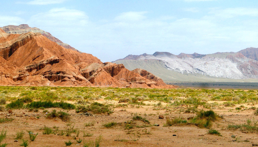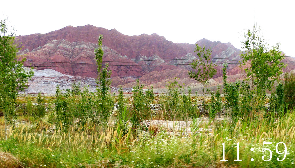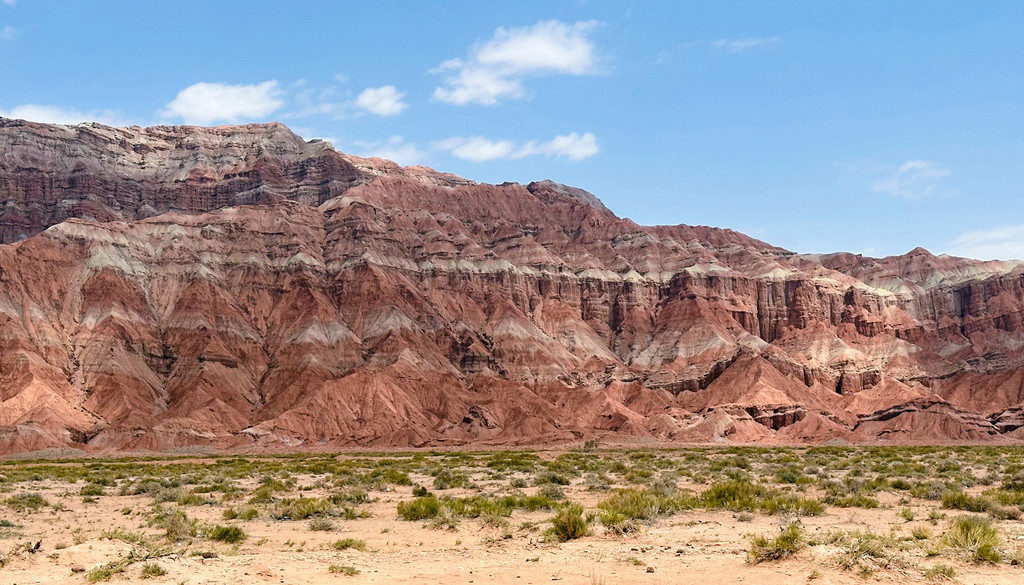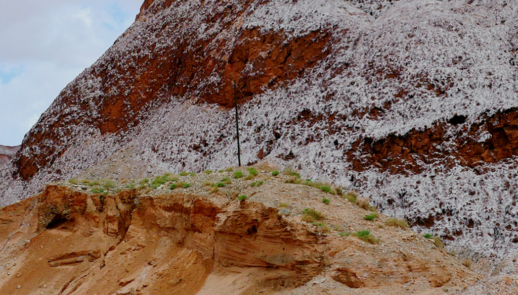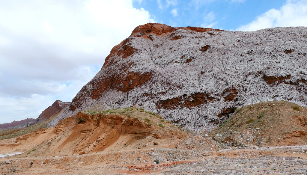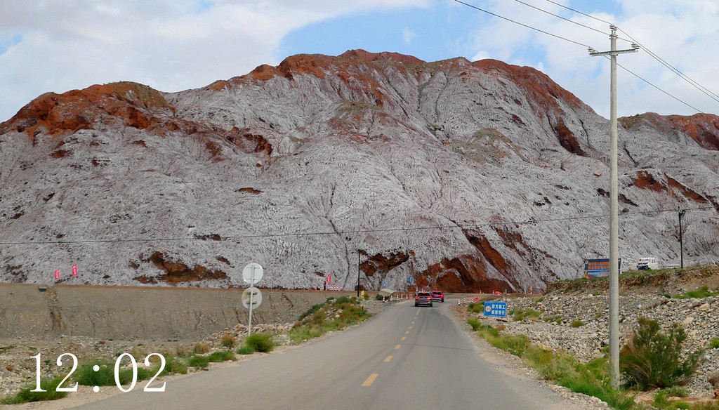 12:01道路左拐向西,我们在路口附近看到了十分怪异的景象:前方红色山体表面覆盖着一层白色,远看不知是啥,驶近才看清,全都是洁白的晶花。此刻正是夏季,晶花不可能是冰晶,于是猜想为盐晶。后来才知道,天山托木尔景区地域之内还有一处“温宿盐丘国家地质公园”。公园内的红色砂岩、泥岩富含盐分,眼前所见应该就是其中的一座盐山。