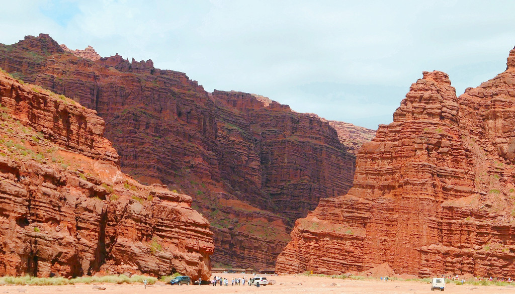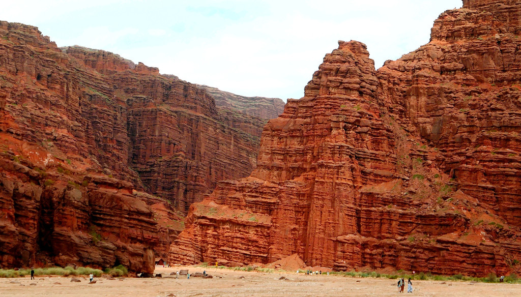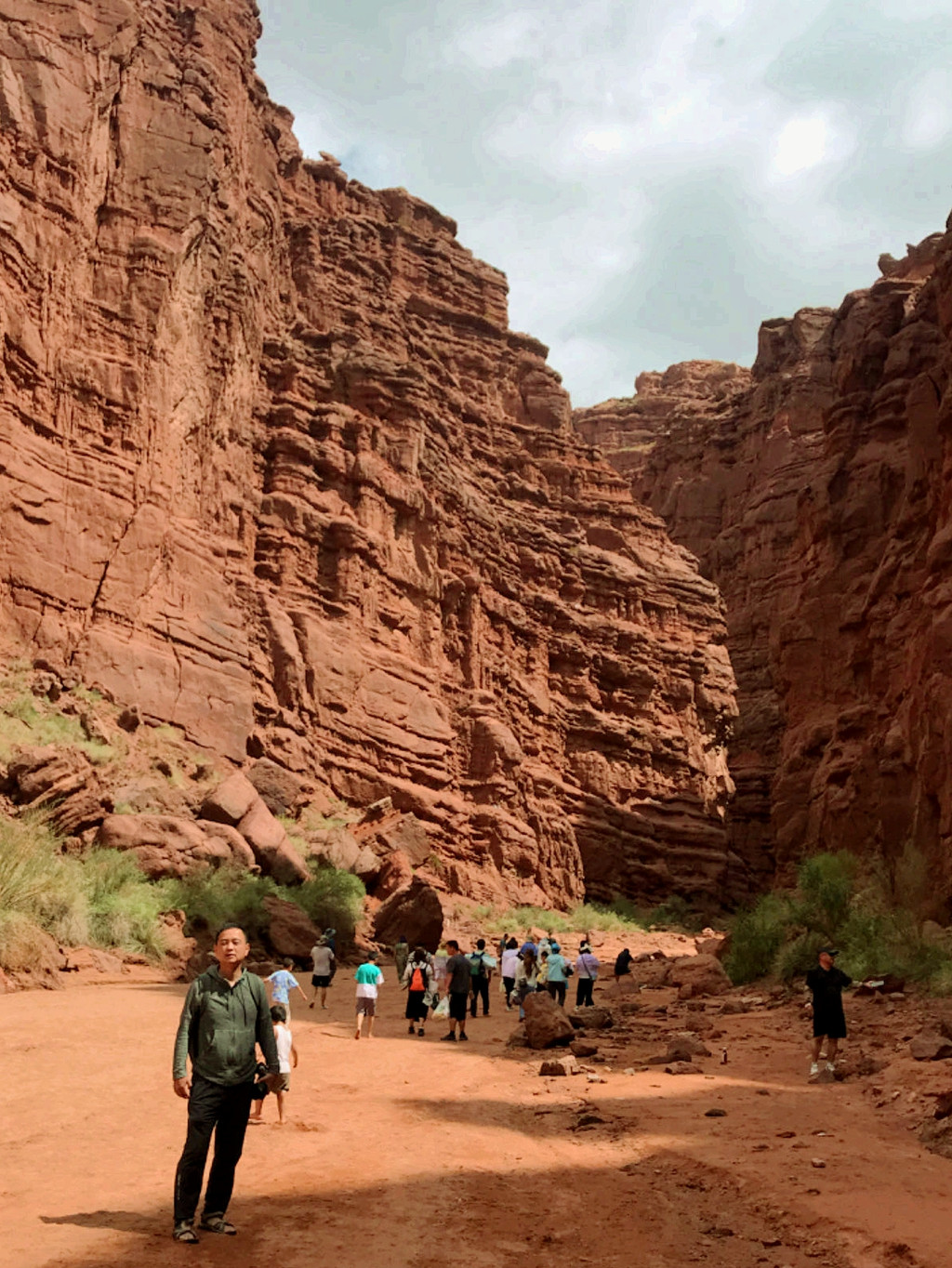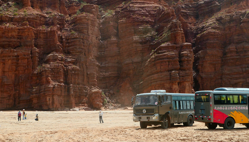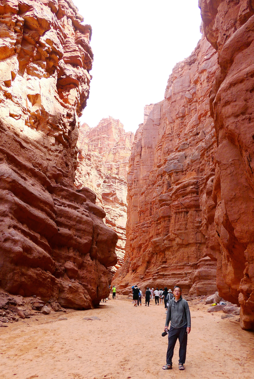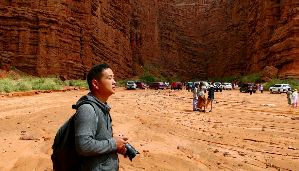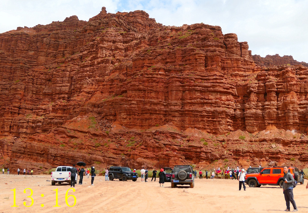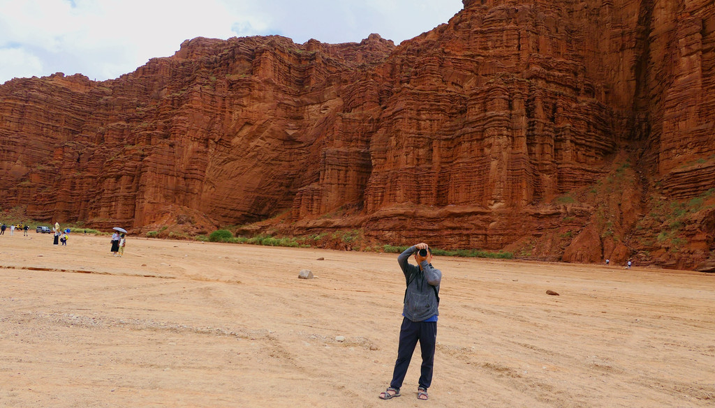 13:10抵达交通车终点,这里是一大片平坦的沙滩,跨度达到数百米,仿佛就是一座辽阔“广场”。四周峰峦叠嶂,奇峰兀立,刀切斧劈般地崖壁近乎与地面垂直,山崖下的游人和汽车都显得十分渺小,山势之磅礴,令人瞠目结舌。下车不久遇阵雨,所幸很快天晴,红山经历雨淋,色彩变得更加艳丽。