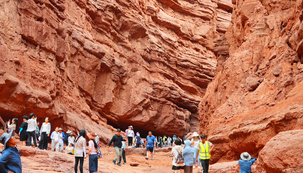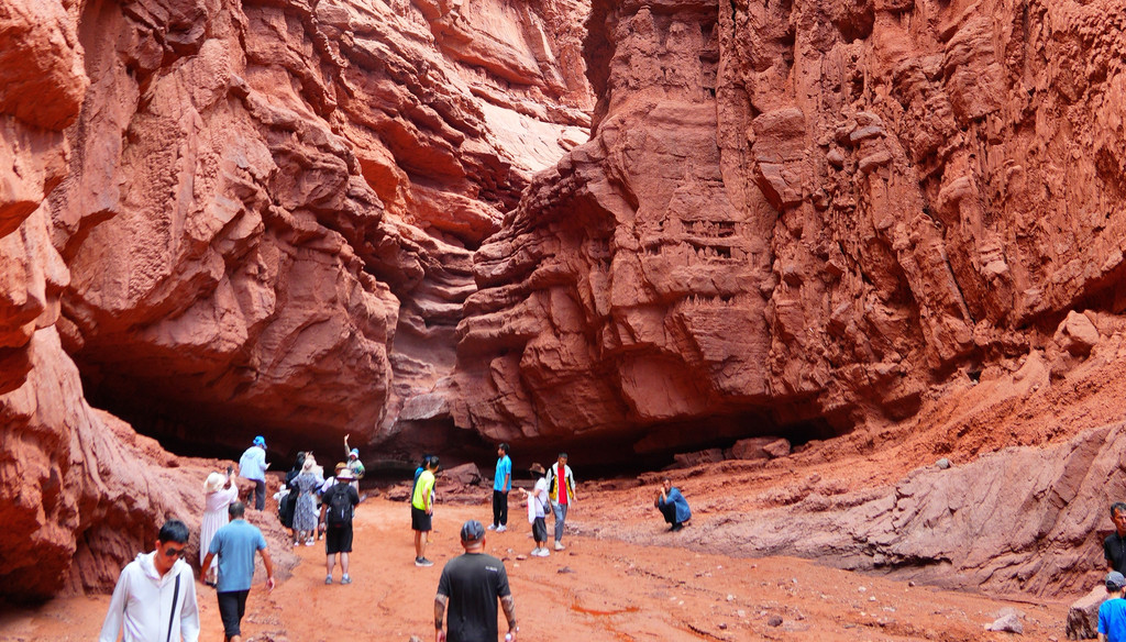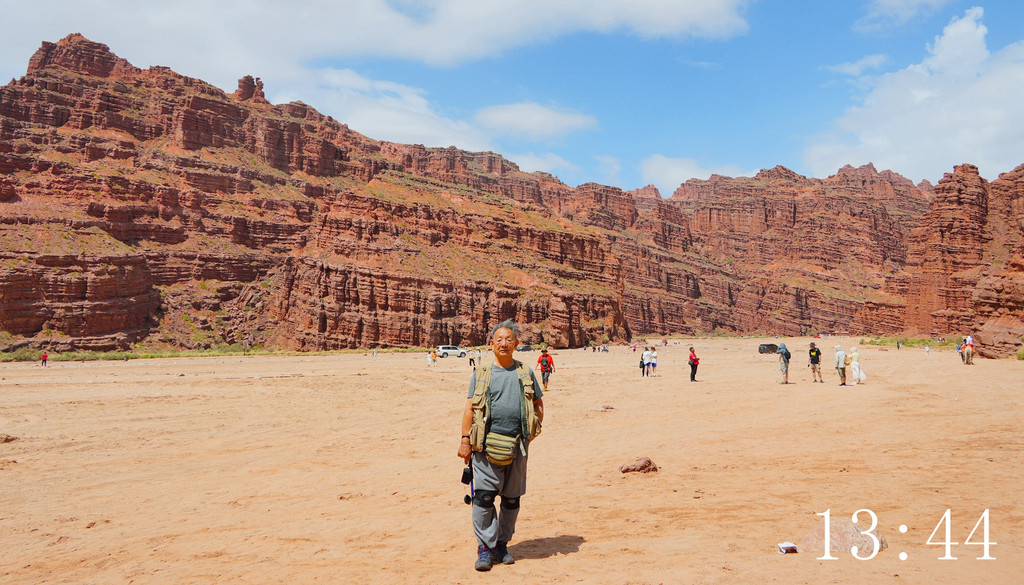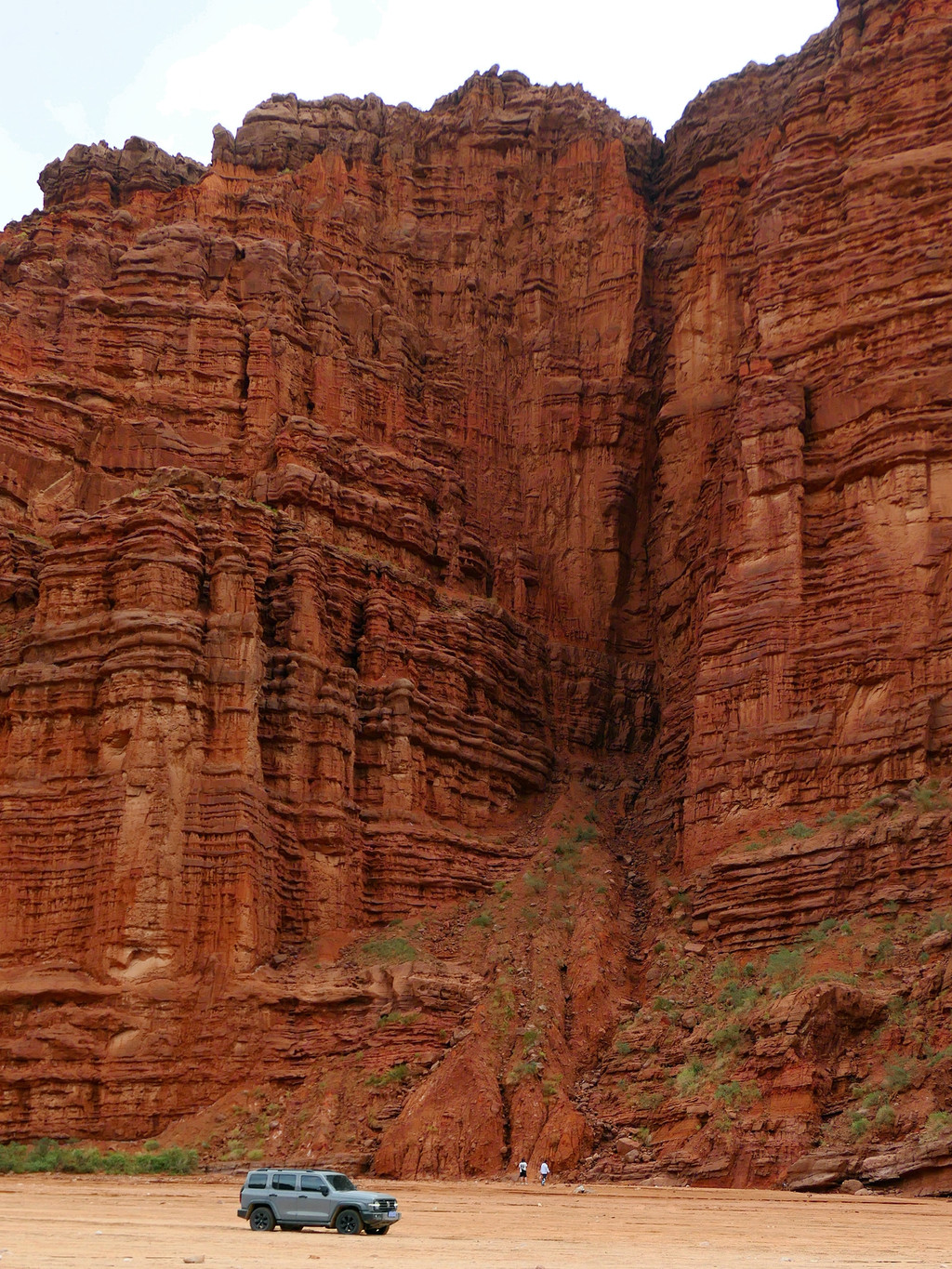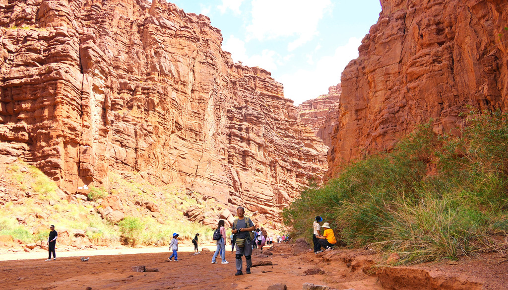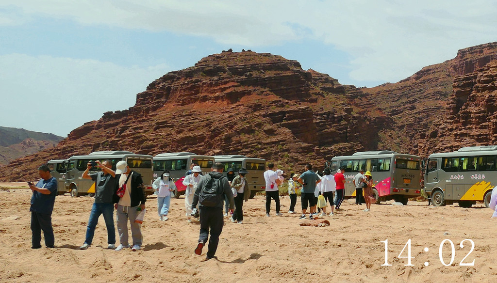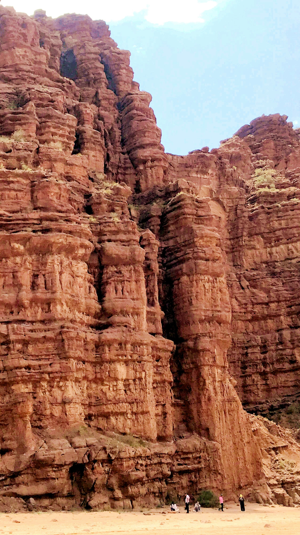 13:10抵达交通车终点,这里是一大片平坦的沙滩,跨度达到数百米,仿佛就是一座辽阔“广场”。四周峰峦叠嶂,奇峰兀立,刀切斧劈般地崖壁近乎与地面垂直,山崖下的游人和汽车都显得十分渺小,山势之磅礴,令人瞠目结舌。下车不久遇阵雨,所幸很快天晴,红山经历雨淋,色彩变得更加艳丽。