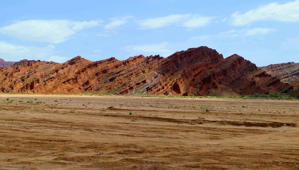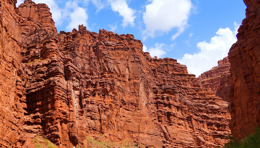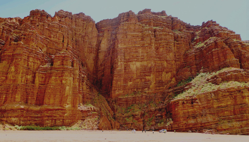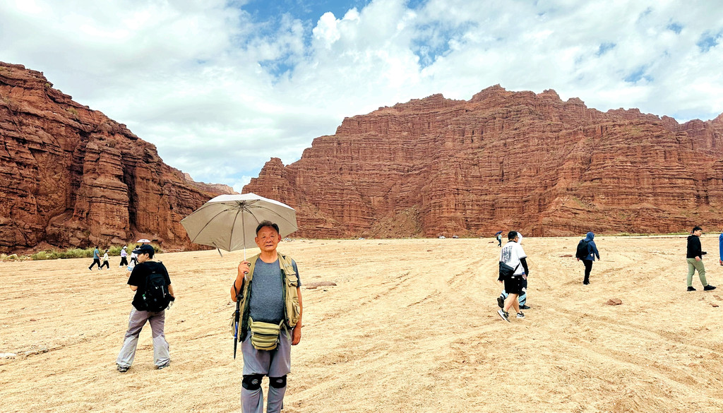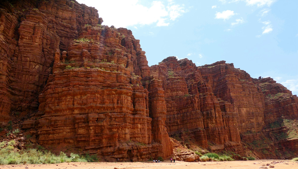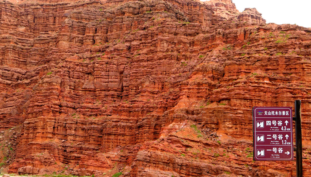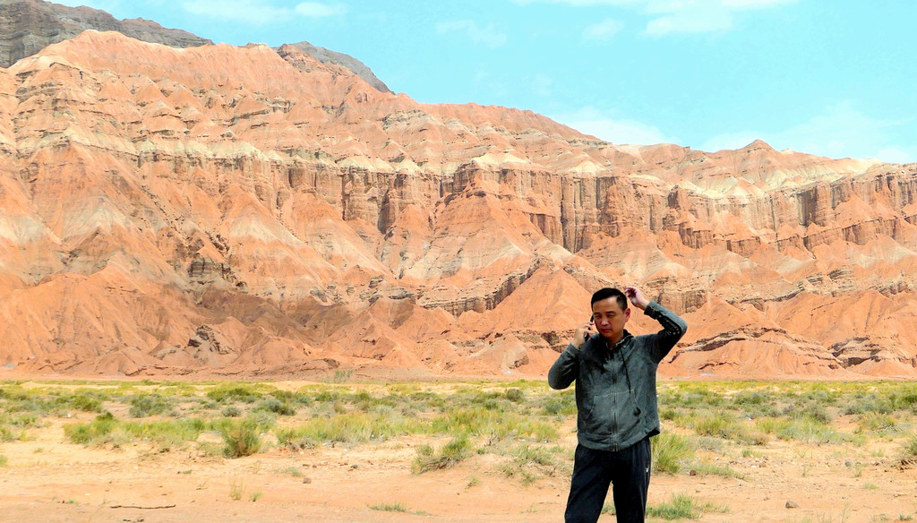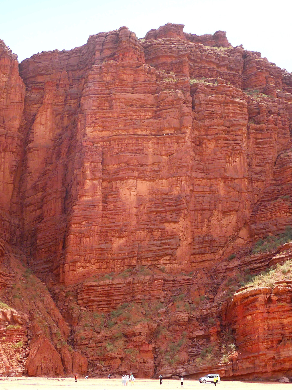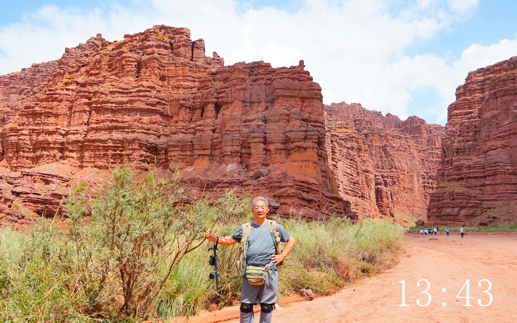 13:10抵达交通车终点,这里是一大片平坦的沙滩,跨度达到数百米,仿佛就是一座辽阔“广场”。四周峰峦叠嶂,奇峰兀立,刀切斧劈般地崖壁近乎与地面垂直,山崖下的游人和汽车都显得十分渺小,山势之磅礴,令人瞠目结舌。下车不久遇阵雨,所幸很快天晴,红山经历雨淋,色彩变得更加艳丽。