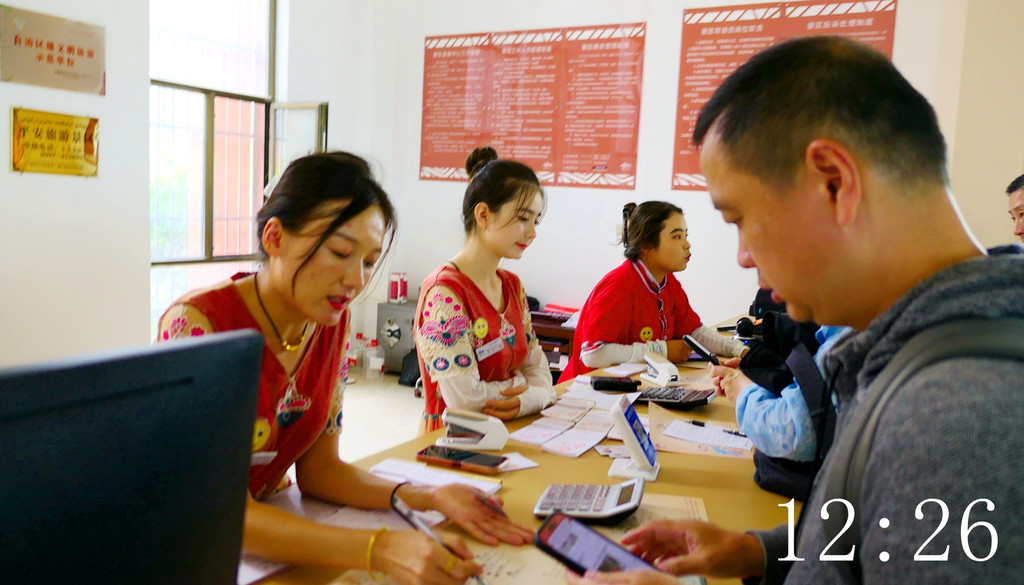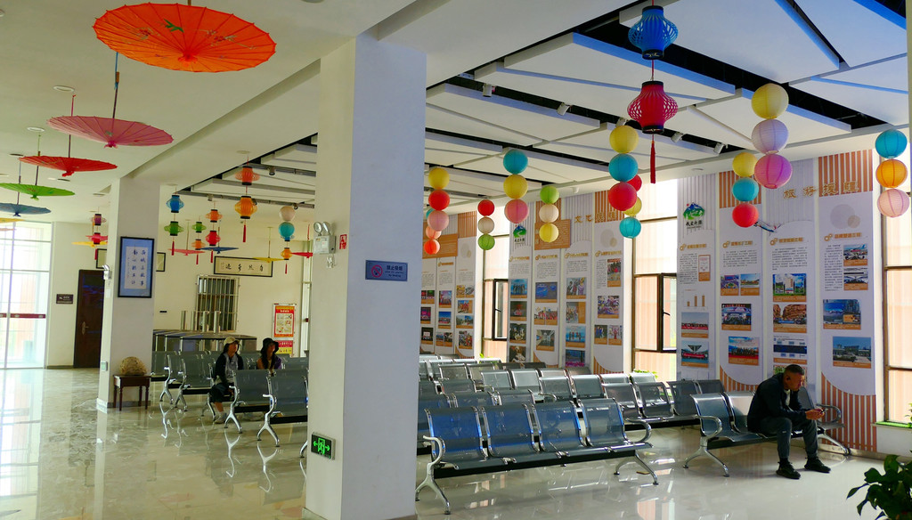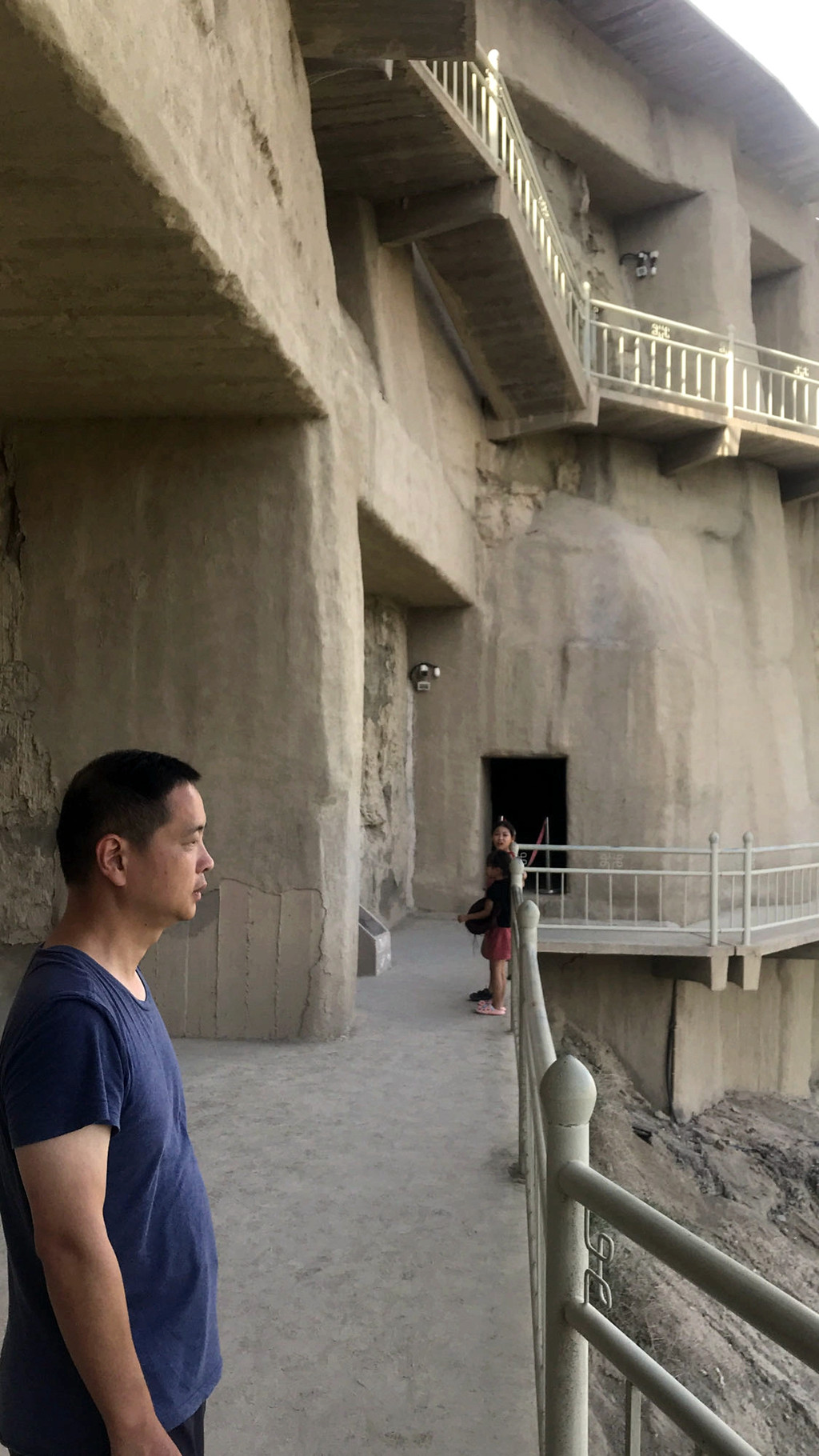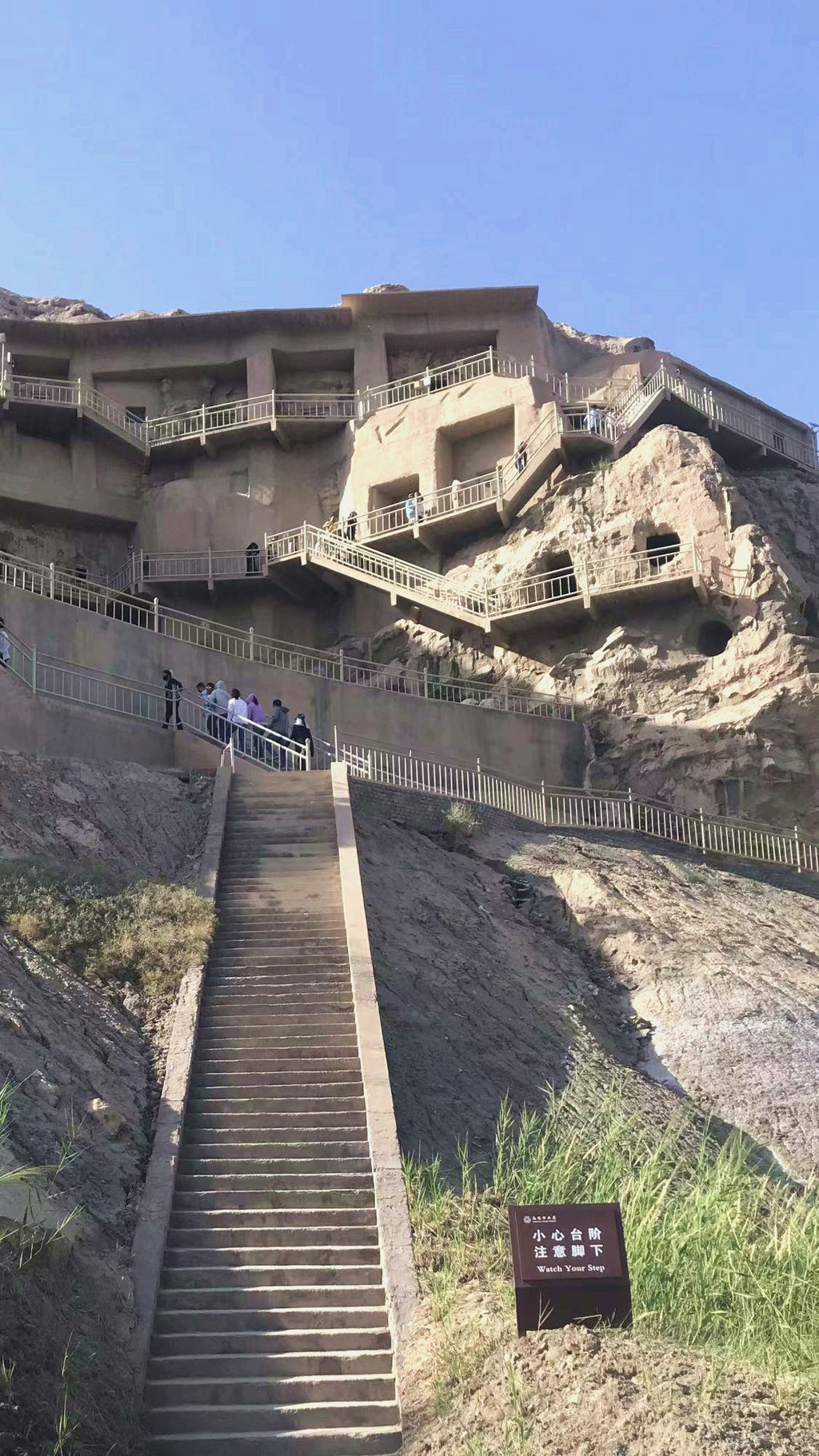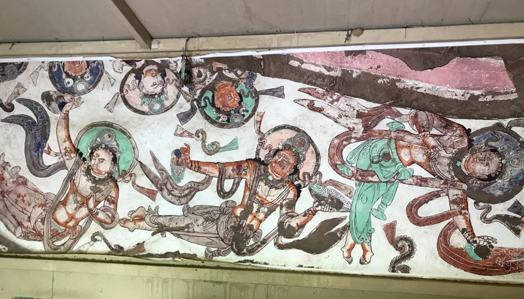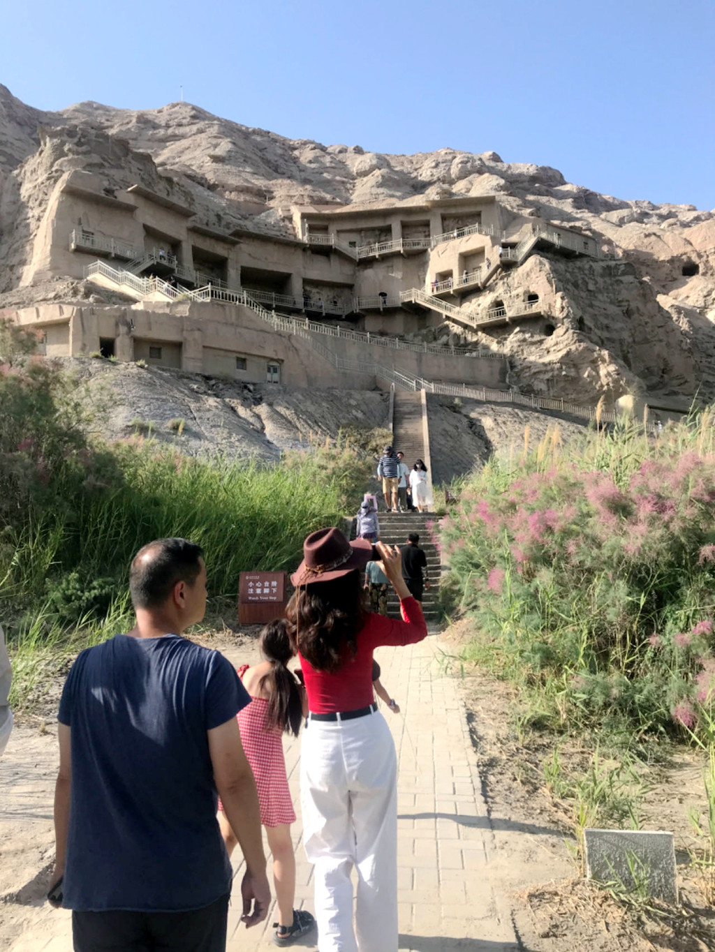 照相机和背包不准进入石窟(手机可以),景区设置专用橱柜供游人存包,存包房的墙壁上有一幅壁画,猜想应该是景区某洞窟内的壁画仿品。按照景区规定,游客是分组由导游带领进入窟区参观,每批10人,我们购票后又等待了片刻,直到凑足10人后,方得进入窟区。