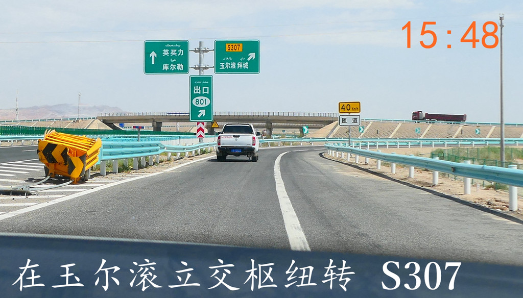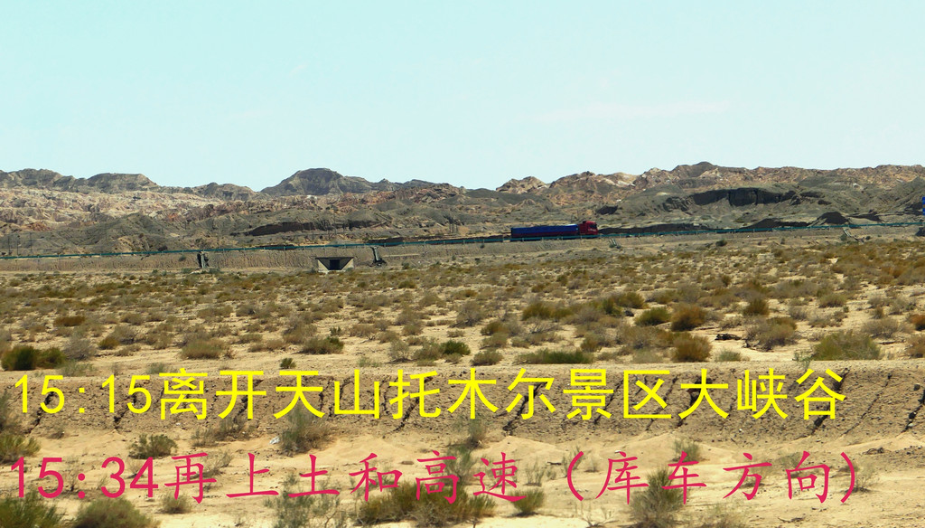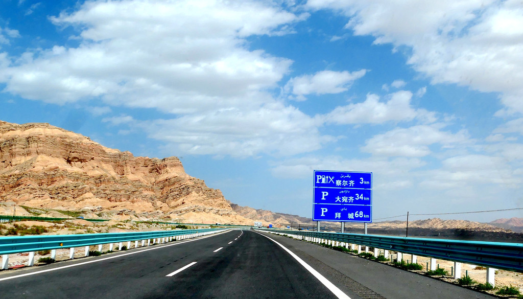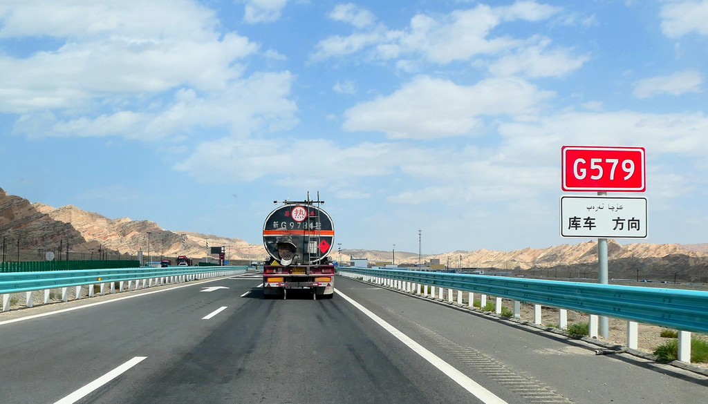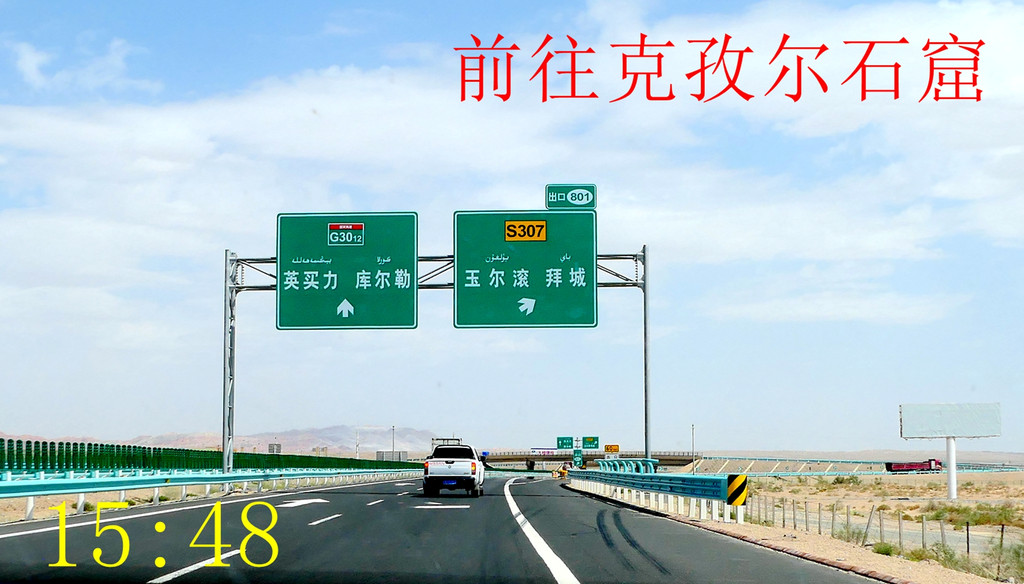 15:15离开温宿大峡谷,驱车前往克孜尔千佛洞,大约须行驶2小时。克孜尔千佛洞位于阿克苏地区拜城县的克孜尔乡,它是比敦煌石窟开凿时间更早的佛教石窟群。15:34经“五团”立交再上土和高速(库车方向),15:48又在玉儿滚立交枢纽下高速,转入省道S307,驶往拜城方向。这一段的道路又称国道G579(玉儿滚立交-拜城-库车),猜想是将原来的省道改建、升级为国道。