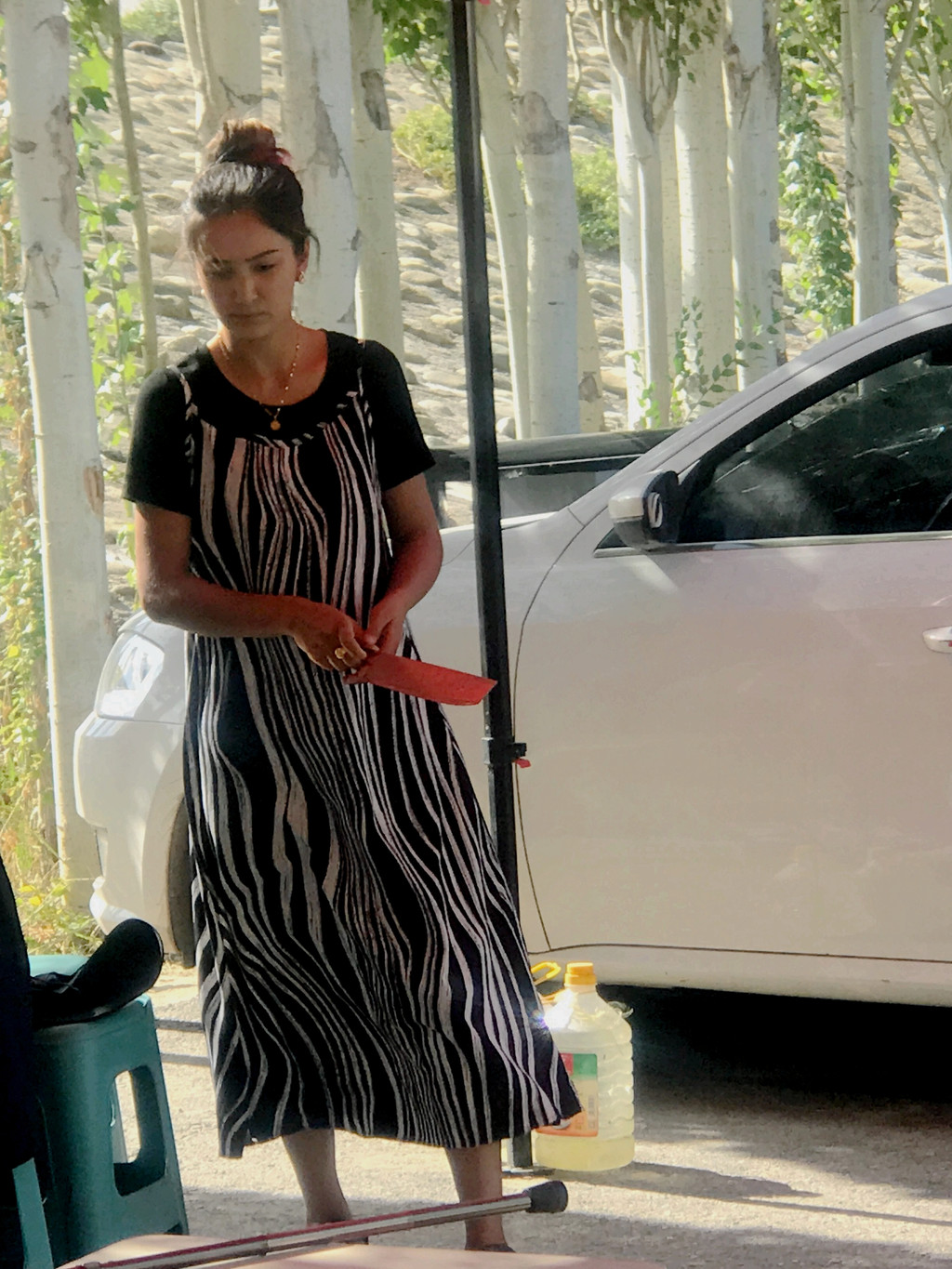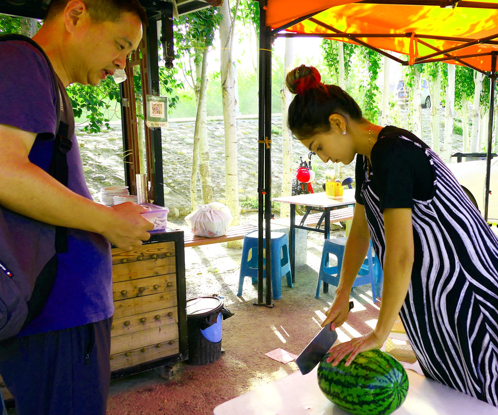 19:30离开窟区,19:45走出景区大门,在停车场旁的一个摊位吃西瓜。这里的西瓜又甜、又便宜,我们挑选了一个最小的还吃不完,最后只好向摊位女老板要了个塑料袋,将吃剩下的西瓜打包。J