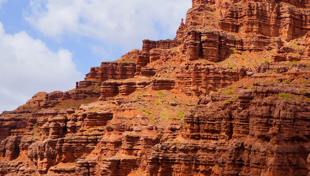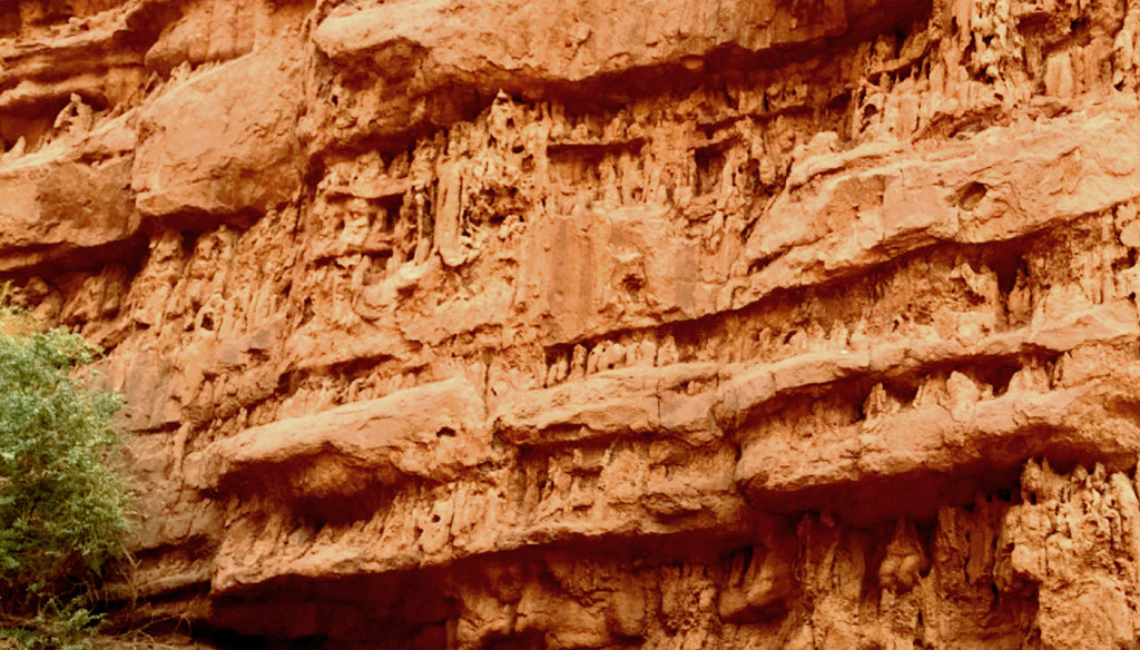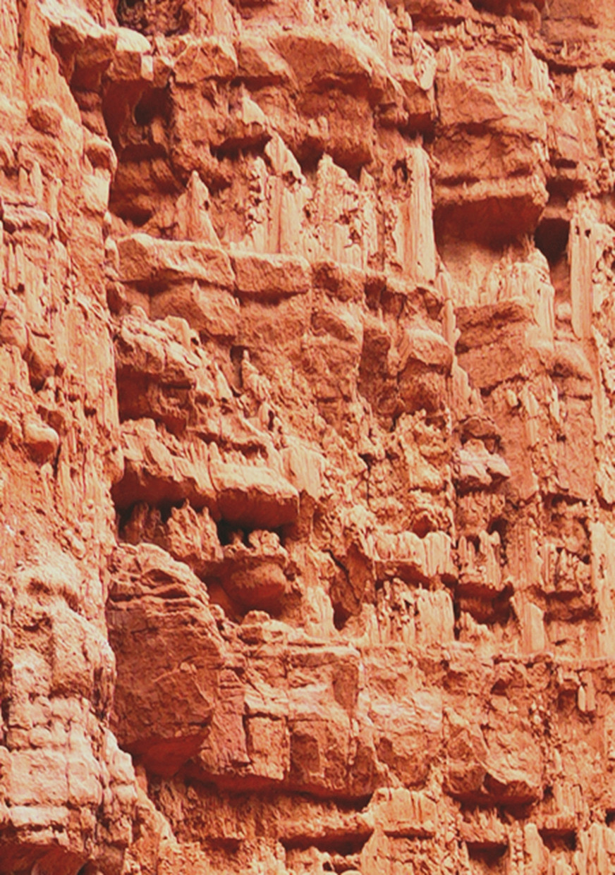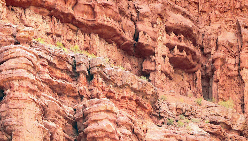 放眼所见皆为绝壁、奇峰,崖壁展现出层次分明的理纹,红崖赤壁与千姿百态的石峰石柱交相辉映,仿佛是荒城,又像是古堡。经年累月的风雨侵蚀,又将岩壁上的纹理“精雕细刻”,幻化出千奇百怪的模样,好似亭台楼阁,又像是形态各异的人物,大自然的鬼斧神工着实令人赞叹。