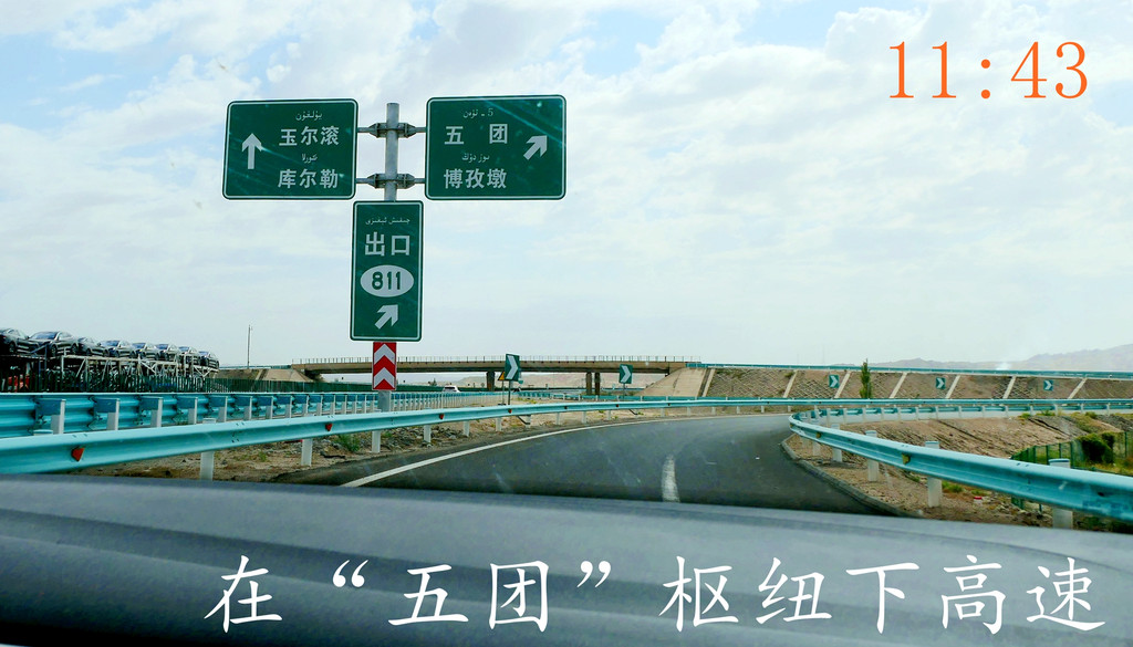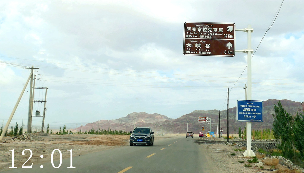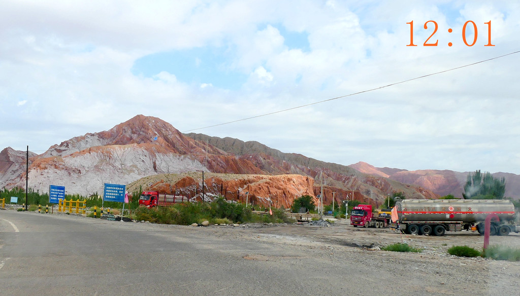 我们原本是应该在“温宿工业园区”立交桥下高速,然而,X.J.跟我讲话分神,错过了路口,只好继续前行约11公里,11:43在“五团”立交桥下高速。此处距离大峡谷还有25公里,须行车30分钟左右。