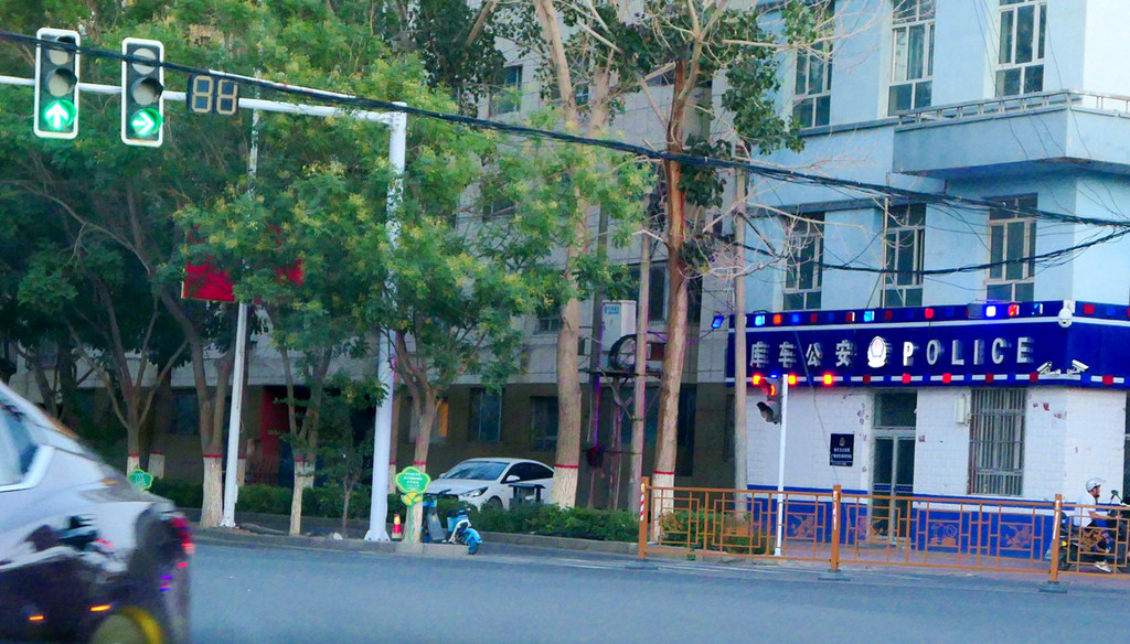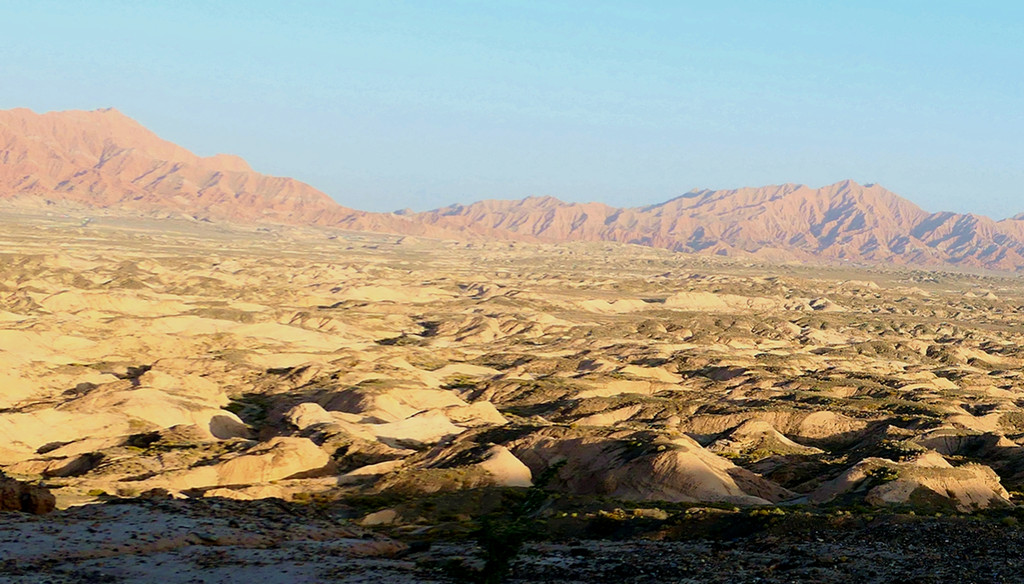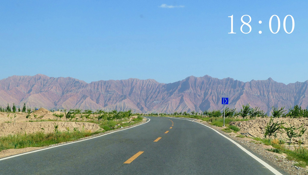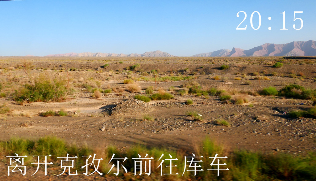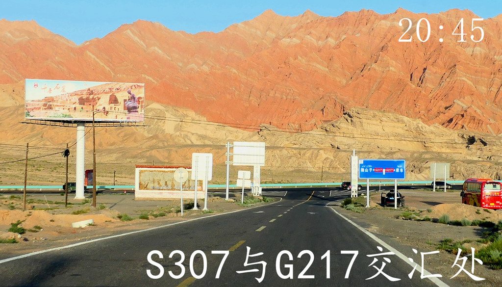 20:02离开景区,经克孜旅游专线,再转省道S307,前往库车。今日的库车就是古代龟兹国都所在之地。行车一路都是戈壁荒滩,20:45驶经S307与G217(独库公路)交汇的丁字路口,正对面是漂亮的红山。