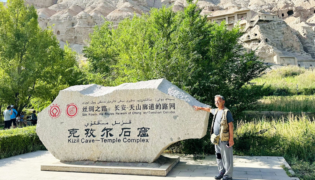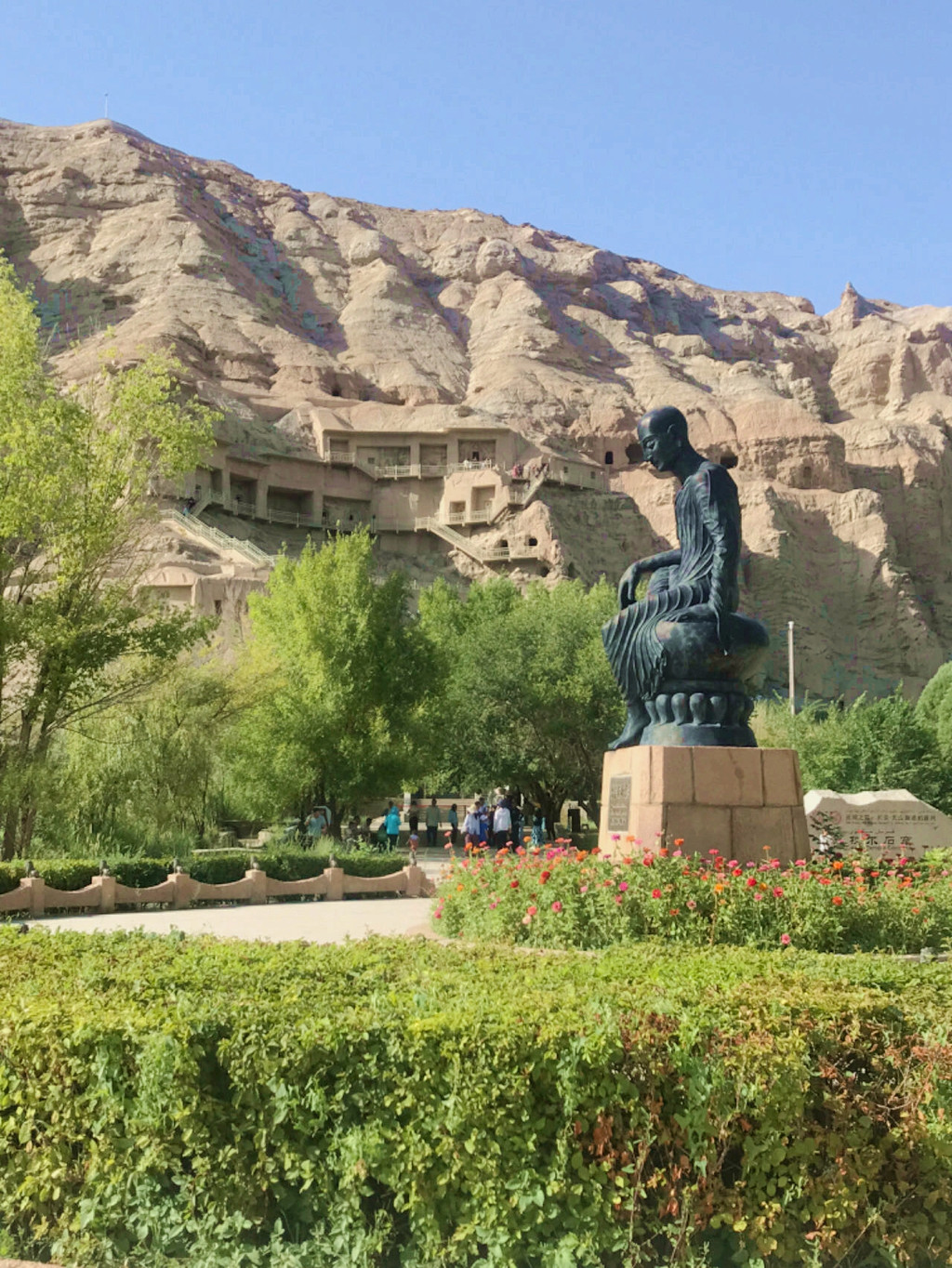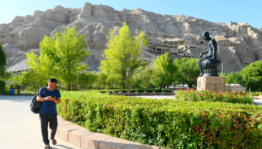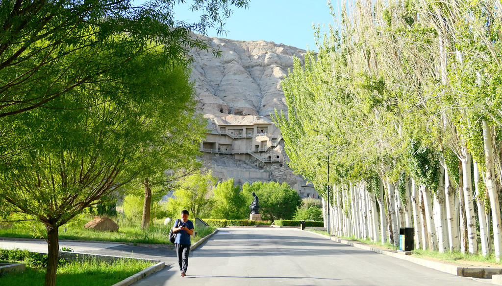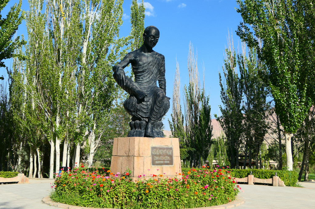 从景区停车场到真正的石窟区,还有徒步走很长距离,道路两旁都是高大的白杨。走到窟区附近,最醒目的标志就是那尊鸠摩罗什青铜塑像。鸠摩罗什是我国佛教历史上的重要人物,他的父亲原为天竺(古印度)贵族,来到龟兹后生下鸠摩罗什。鸠摩罗什九岁随母前往克什米尔学经,返回龟兹后成为西域著名高僧,后来又经河西走廊辗转来到内地长安,被尊为十六国时期“后秦”的国师。鸠摩罗什对于佛教传入中国内地曾有重大贡献,他也是中国汉传佛教四大佛经翻译家之一,一生翻译了35部,共294卷佛经。其中,如《妙法莲华经》《金刚经》等,都曾对中国佛教之发展产生过深远影响。